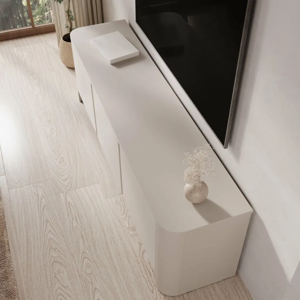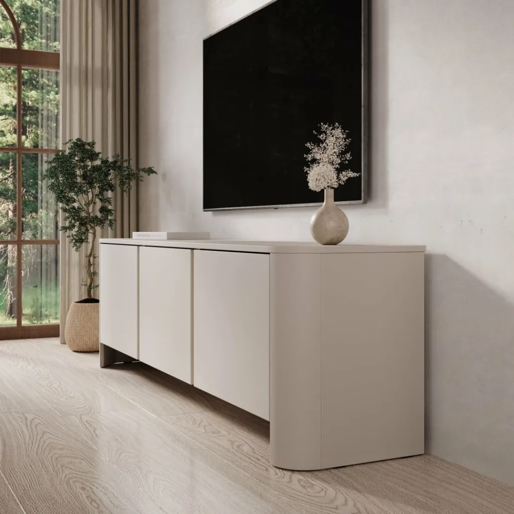 TV-Meubel Barbados is een strak en modern meubel uitgevoerd in een rustige beige kleur. Het design met afgeronde hoeken en greeploze deuren zorgt voor een minimalistische en elegante uitstraling, perfect passend in een eigentijds interieur.
