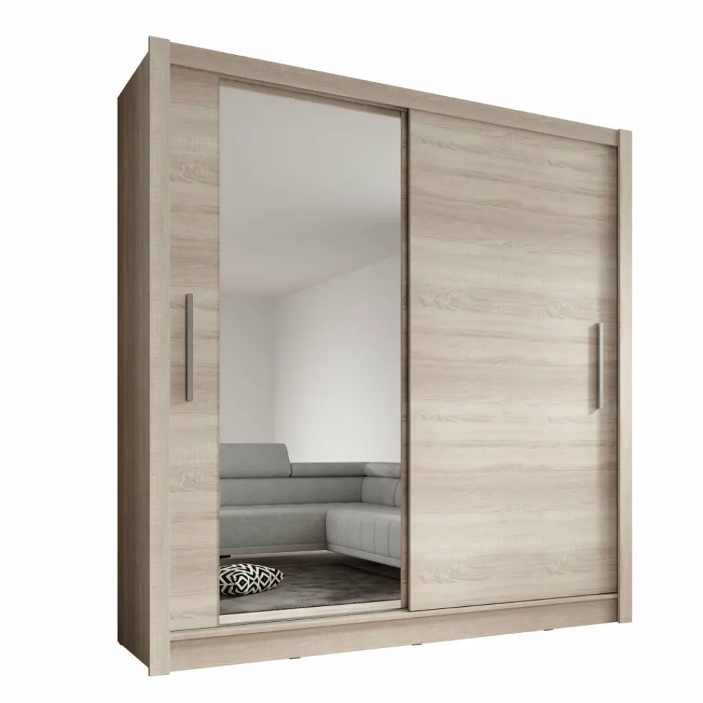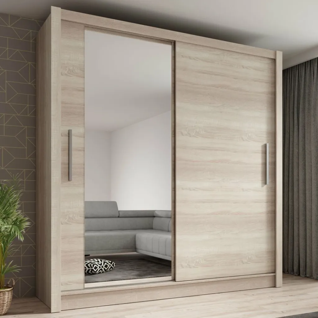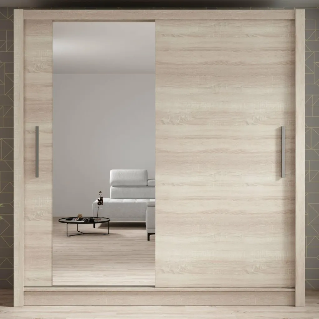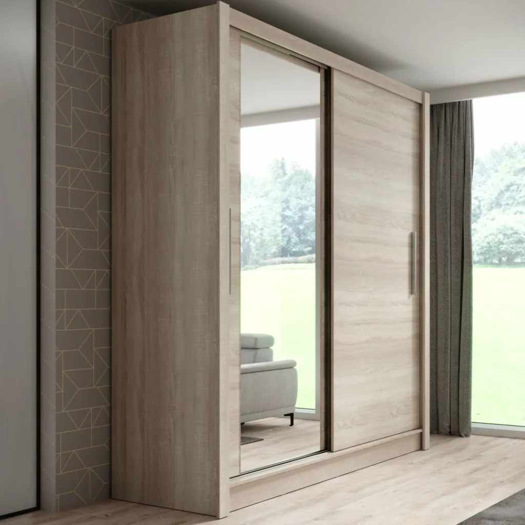 Kledingkast Bazarre combineert moderne met praktische opbergruimte. Deze stijlvolle garderobekast is uitgevoerd in een warme eikenhoutlook kleur en voorzien van twee schuifdeuren met zilverkleurige handgrepen. De linkerdeur is uitgerust met een grote spiegel, ideaal voor het snel checken van je outfit.
