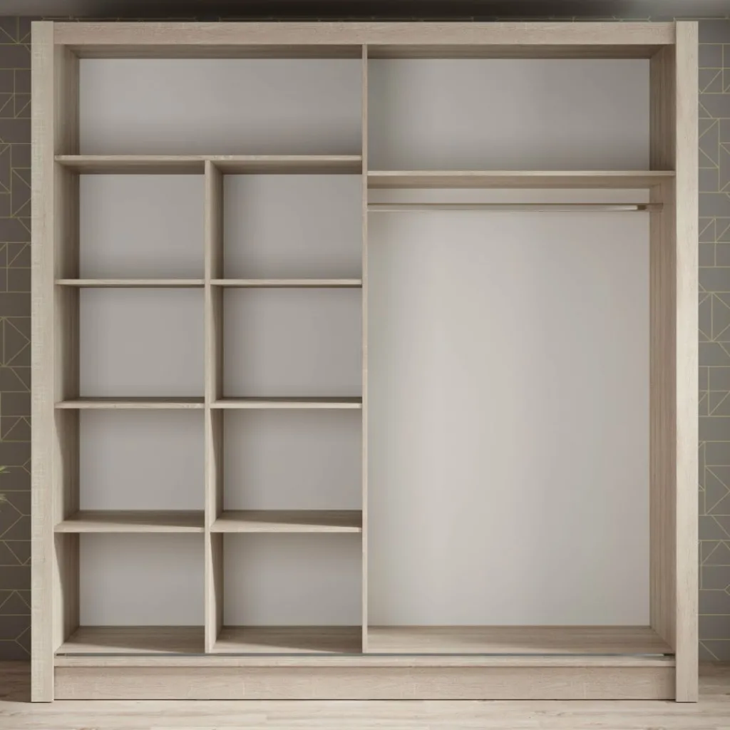 Achter de deuren vind je een slimme indeling met tien open vakken en één brede kledingroede. Zo berg je moeiteloos al je kleding, schoenen en accessoires overzichtelijk op.