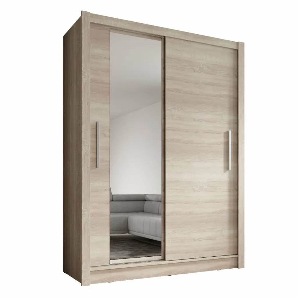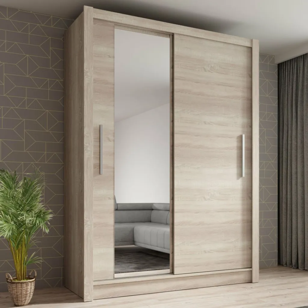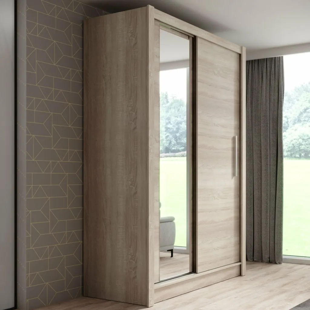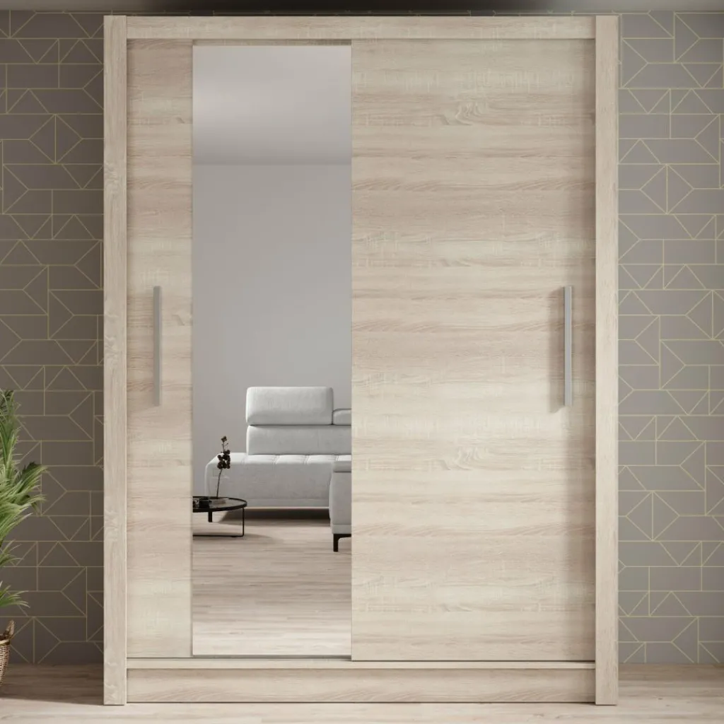 De Bazarre combineert moderne vormgeving met een warme uitstraling en een slimme indeling. Deze schuifdeurkast in eikenlook is voorzien van twee deuren, waarvan één met spiegel. De deuren openen met lange, zilverkleurige handgrepen.