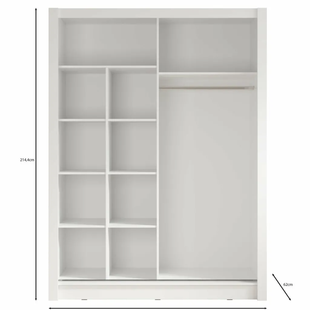 Achter de schuifdeuren vind je volop ruimte: een brede hangroede voor kleding die je netjes wilt ophangen én maar liefst tien open vakken voor het overzichtelijk opbergen van je garderobe, accessoires of beddengoed. De Bazarre is 155 cm breed en 214 cm hoog, en past door zijn rustige uitstraling goed in vrijwel elke slaapkamer.