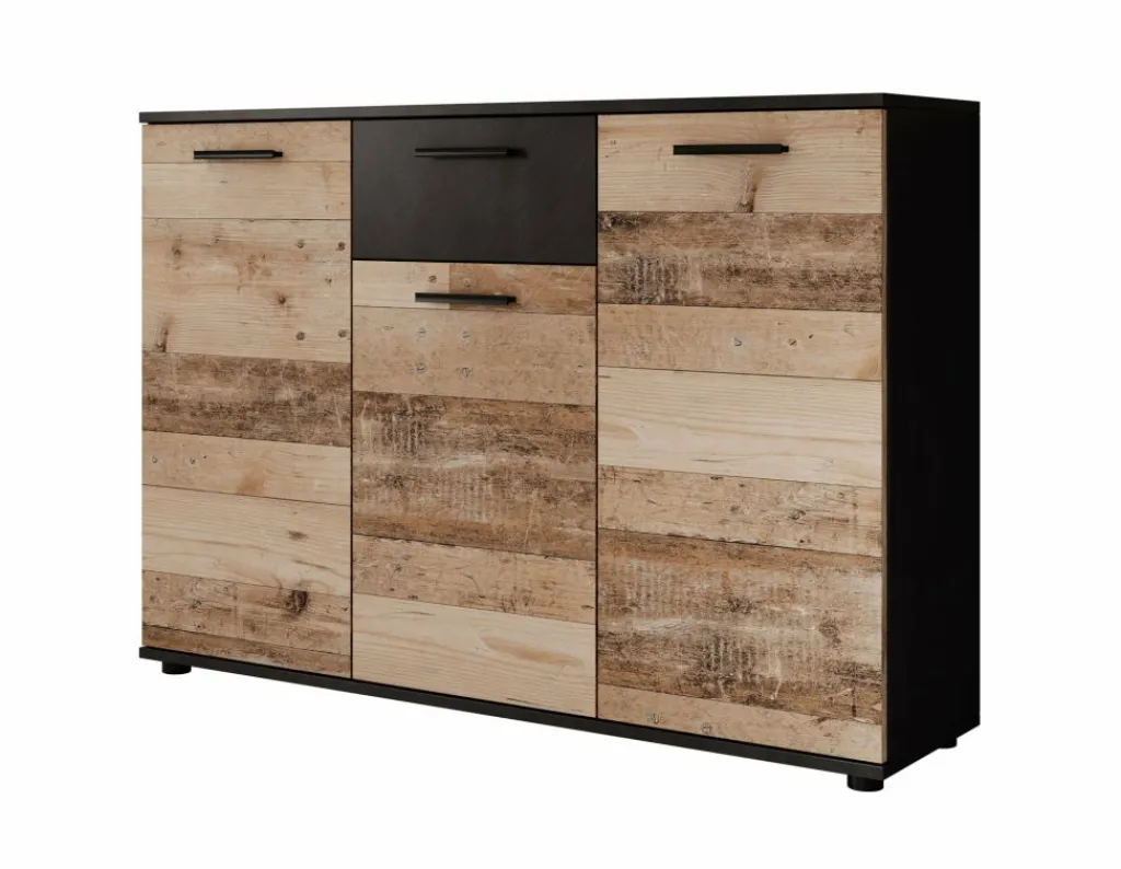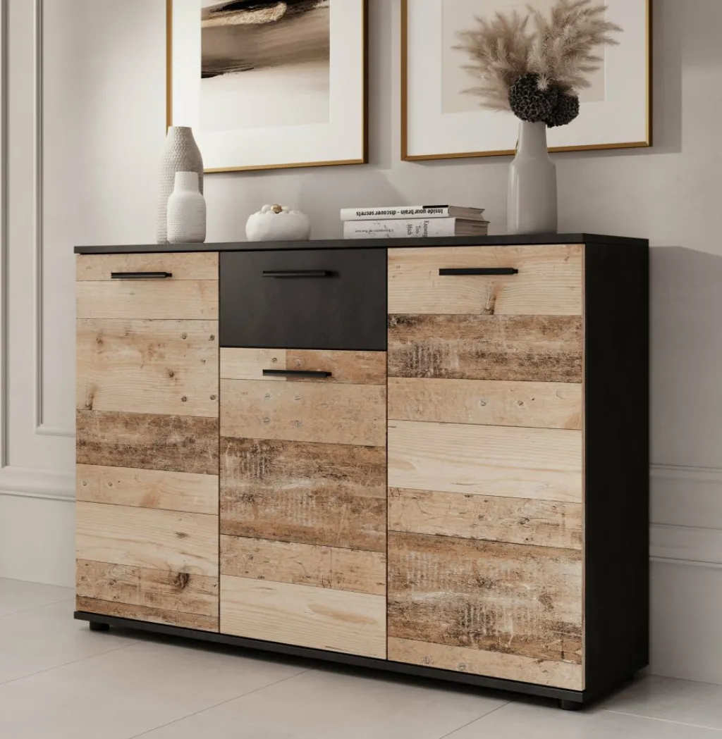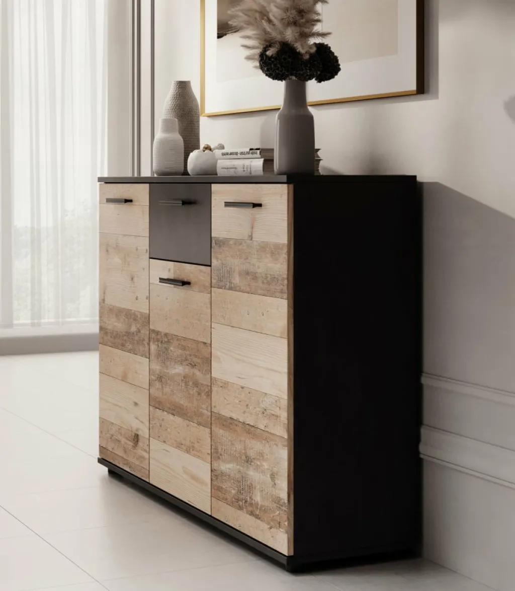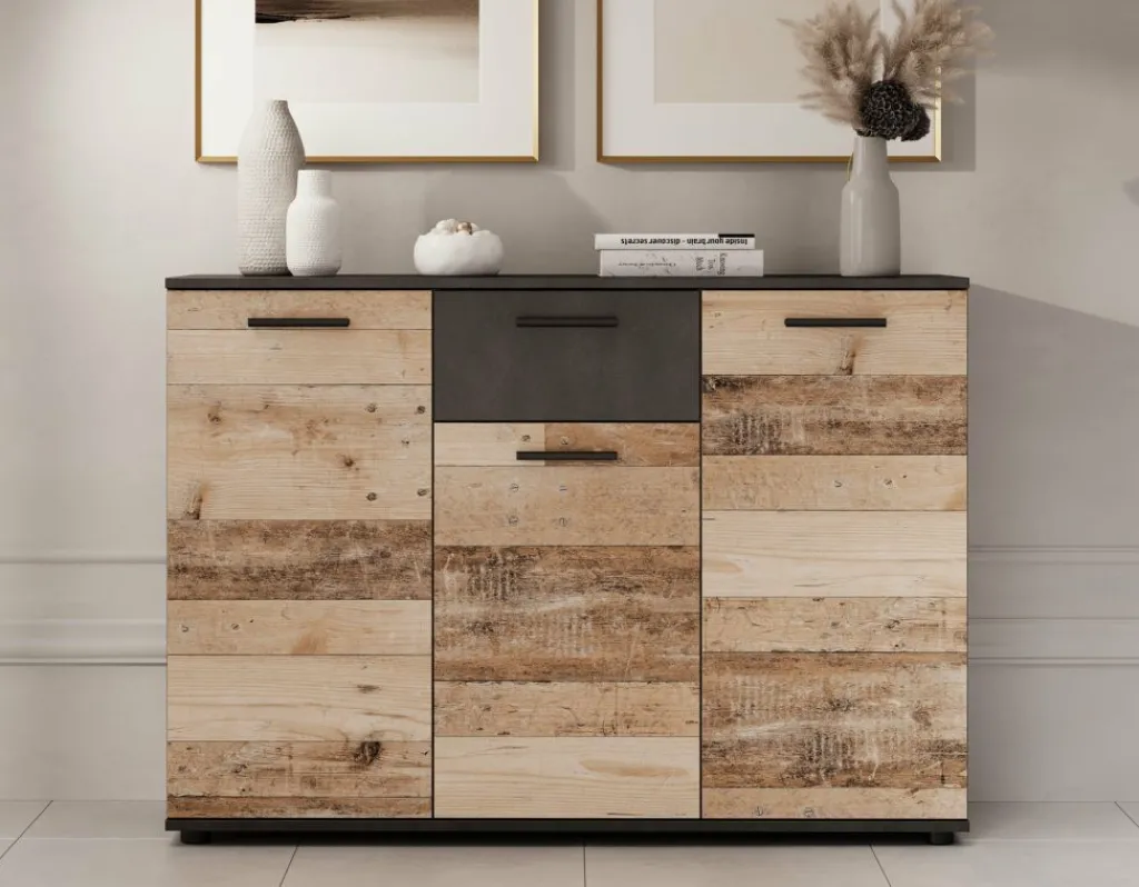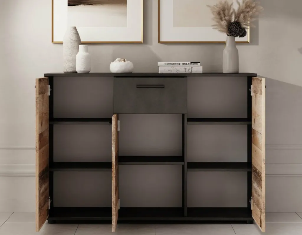 Dressoir Bellini is een praktisch en industriële designkast, uitgevoerd in een combinatie van een ‘licht old wood’ kleur met grijs. De opbergkast beschikt over 1 lade en 3 deuren die openen met zwarte handgrepen. Achter de deuren zitten maar liefst 8 opbergvakken. De kast staat op pootjes.