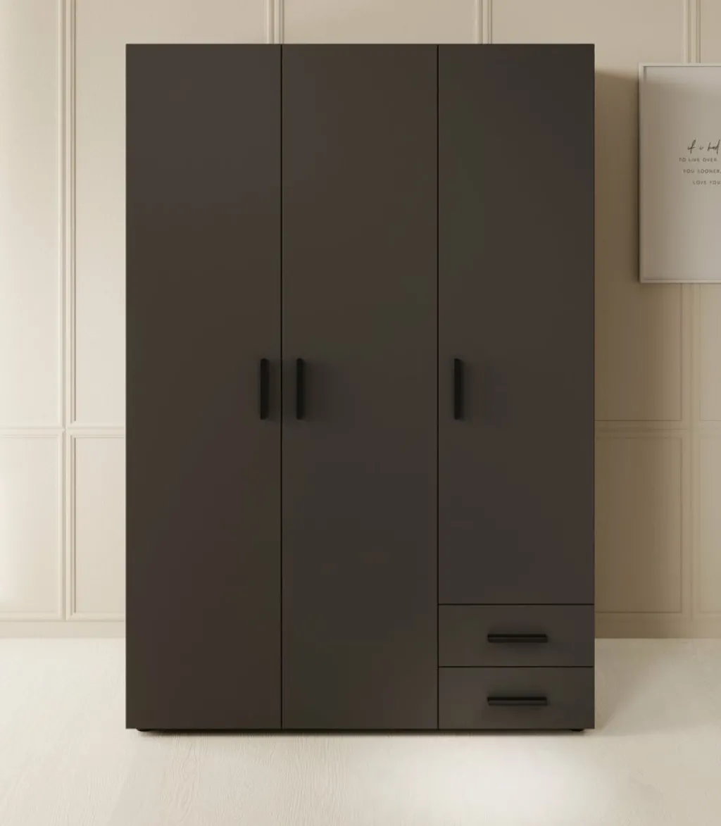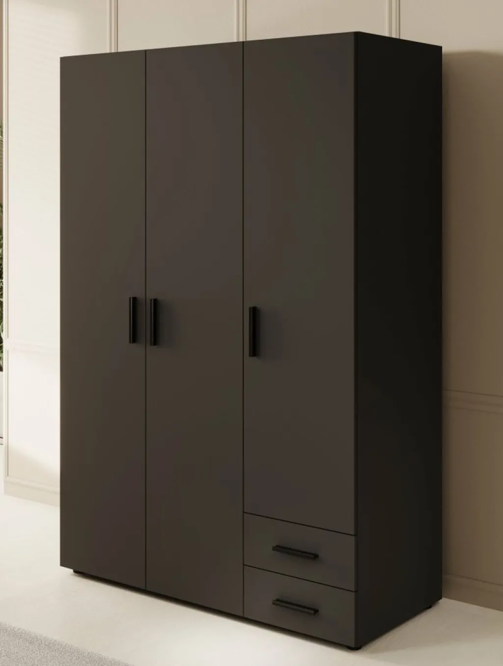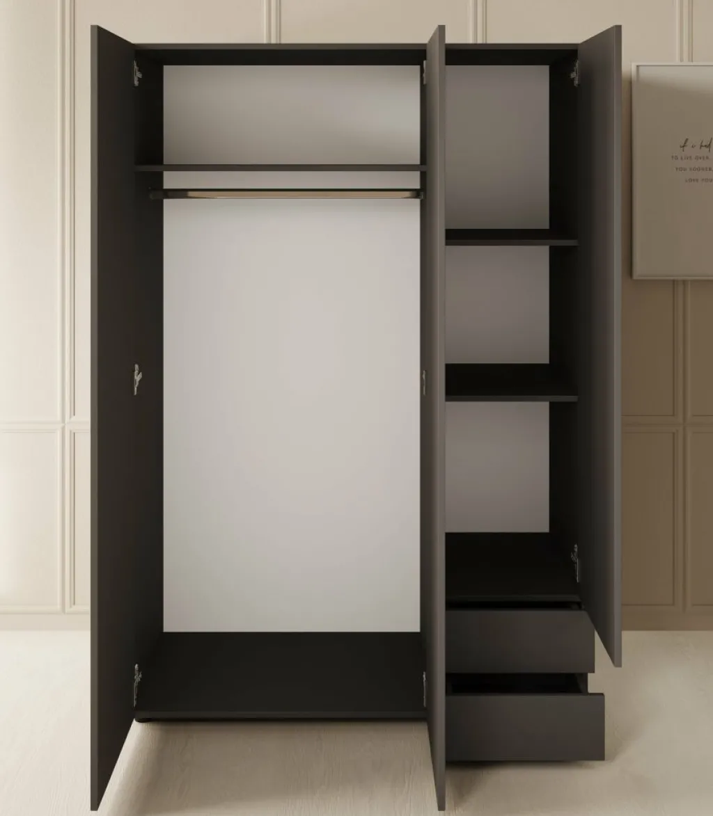 Kledingkast Bellini is een moderne garderobekast in de kleur antraciet. Dit model is voorzien van 3 scharnierdeuren en 2 lades die openen met zwarte handgrepen. De binnenkant van de kast bestaat uit 4 opbergvakken en 1 kledingroede. De Bellini staat op pootjes.