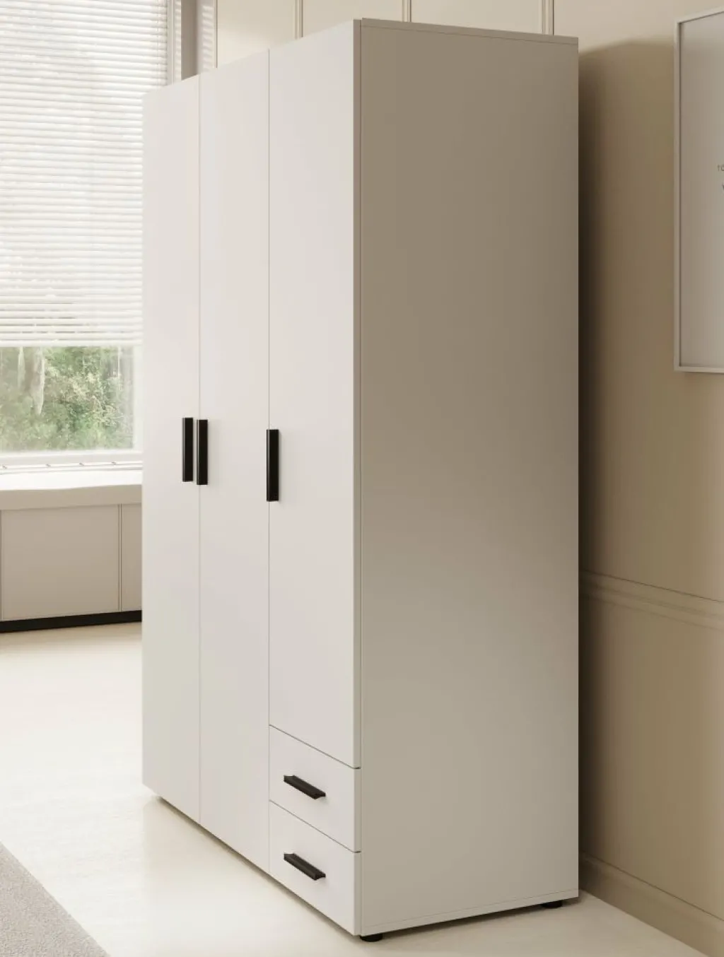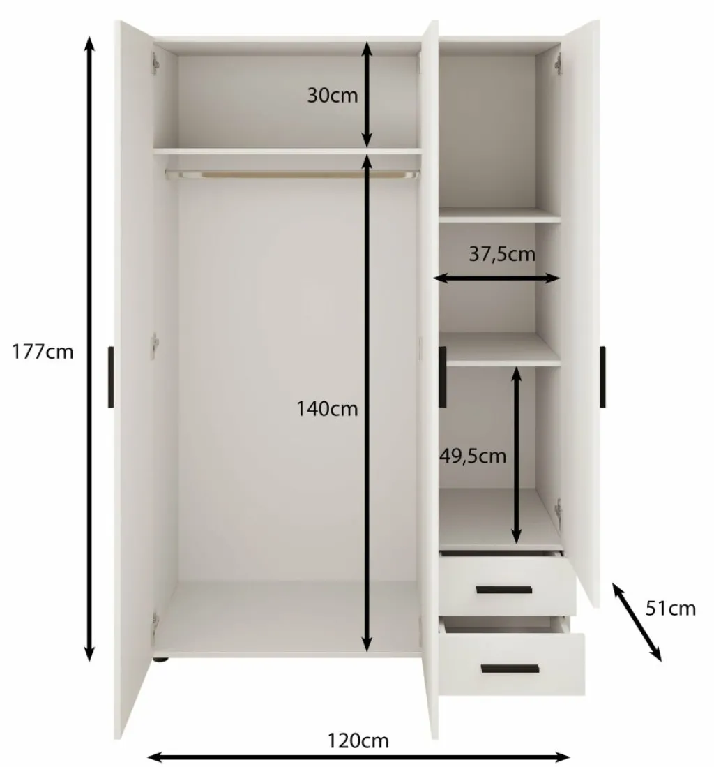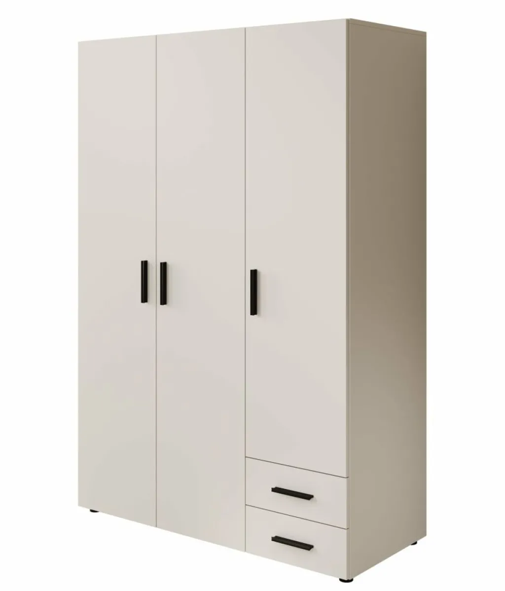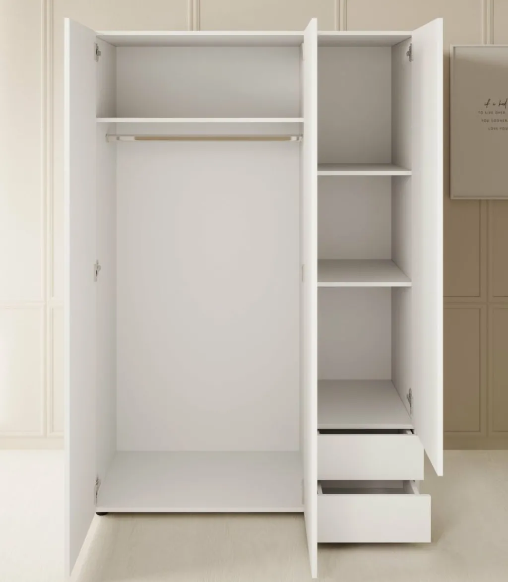 Kledingkast Bellini is een moderne garderobekast in de kleur wit. Dit model is voorzien van 3 scharnierdeuren en 2 lades die openen met zwarte handgrepen. De binnenkant van de kast bestaat uit 4 opbergvakken en 1 kledingroede. De Bellini staat op pootjes.