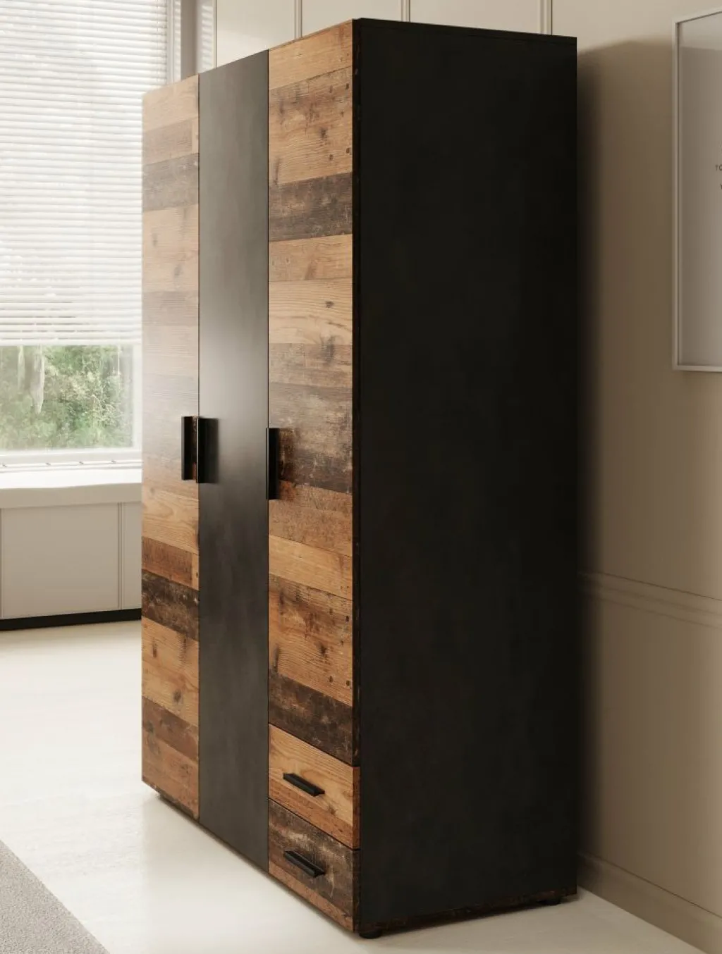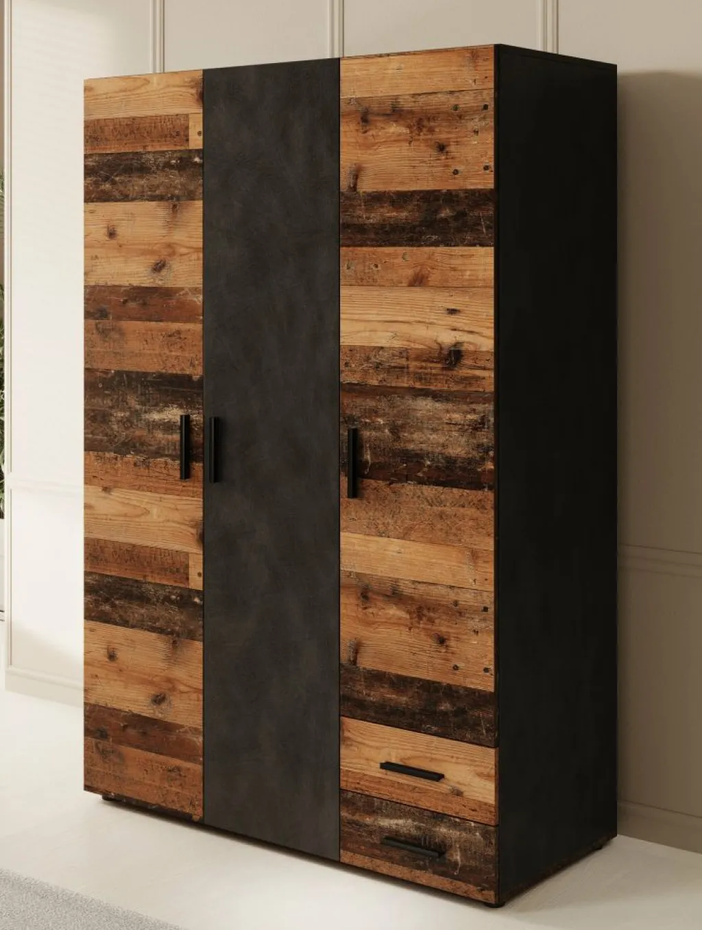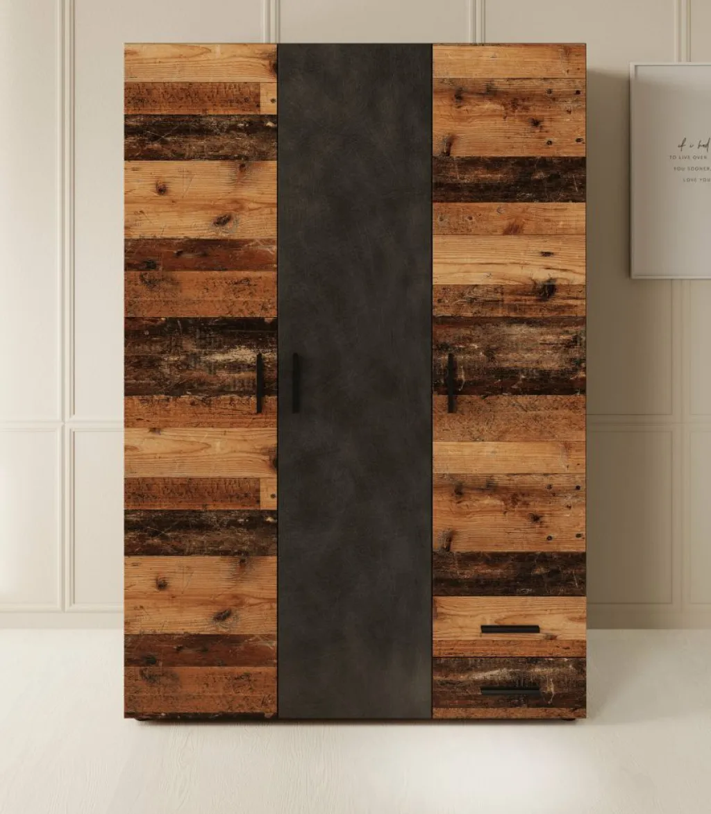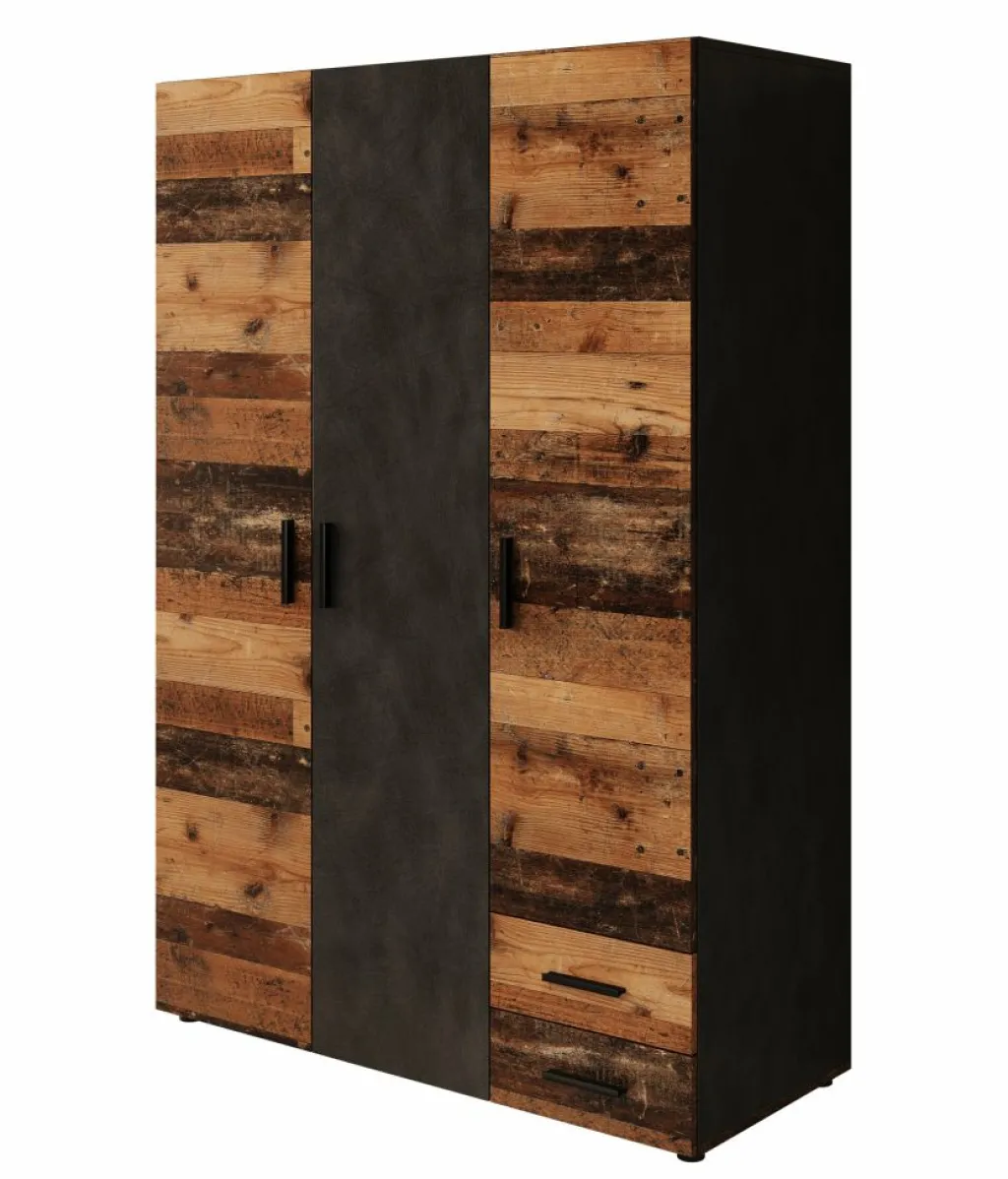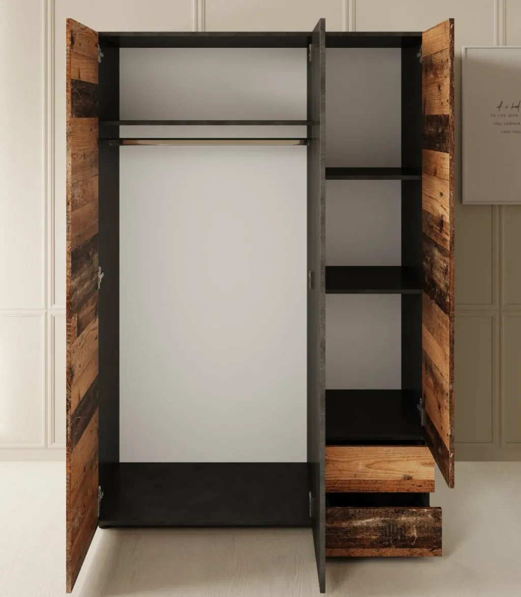 Kledingkast Bellini is een industriële garderobekast in de kleur donker old wood met grijs. Dit model is voorzien van 3 scharnierdeuren en 2 lades die openen met zwarte handgrepen. De binnenkant van de kast bestaat uit 4 opbergvakken en 1 kledingroede. De Bellini staat op pootjes.