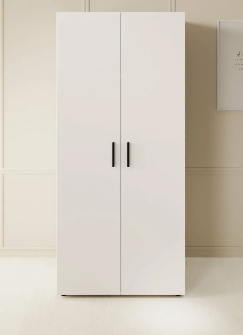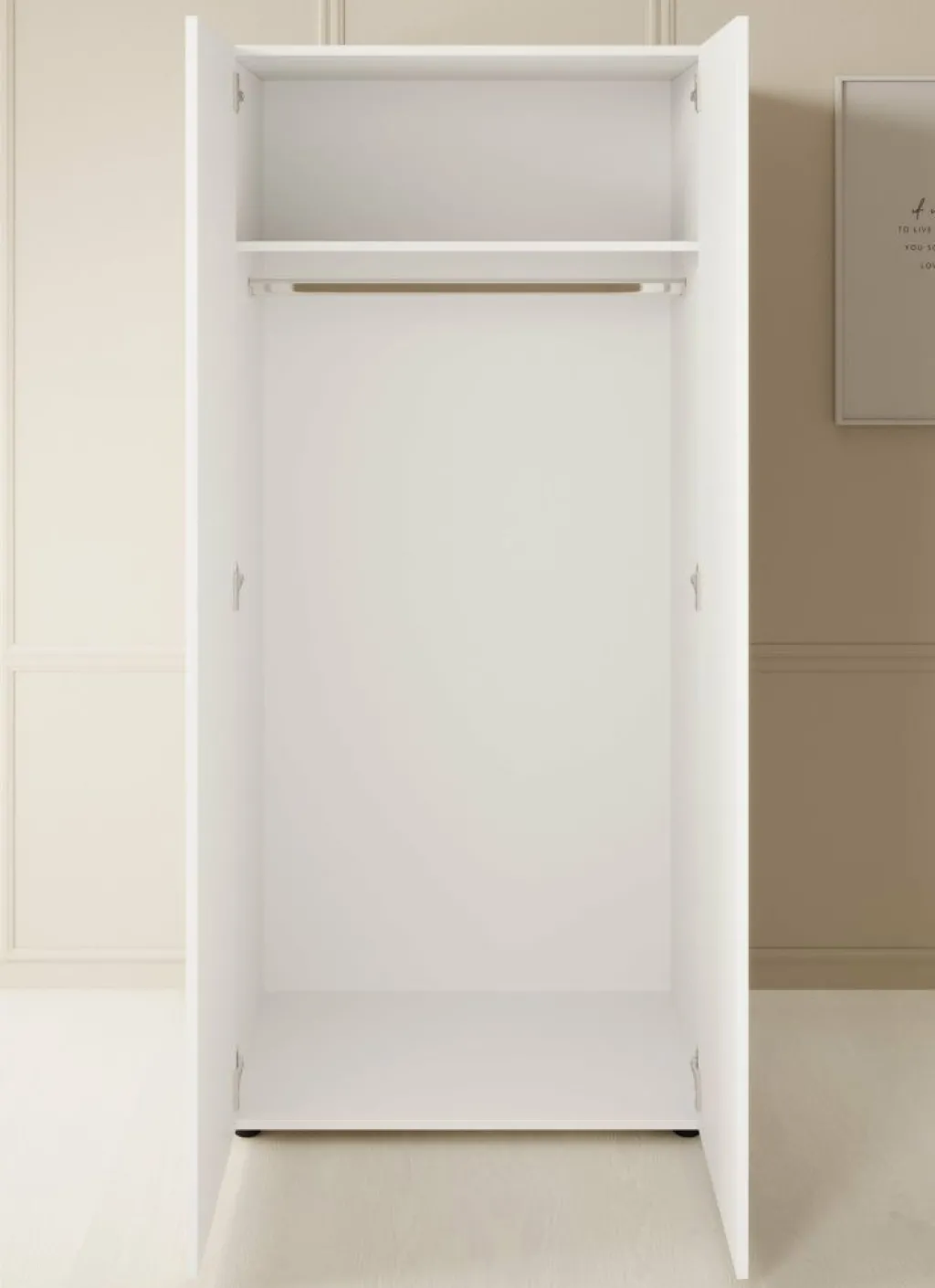 Kledingkast Bellini is een moderne garderobekast in de kleur wit met een eenvoudig design. Dit model is voorzien van 2 scharnierdeuren die openen met zwarte handgrepen. De binnenkant van de kast bestaat uit 1 opbergvak en 1 kledingroede. De Bellini staat op pootjes.