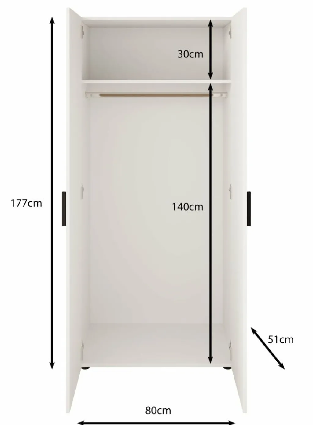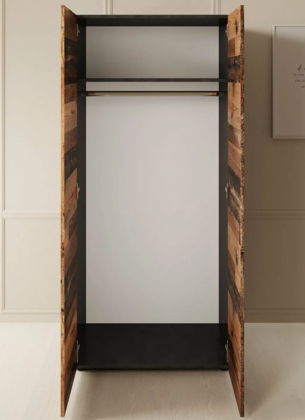 Kledingkast Bellini is een industriële, eenvoudige garderobekast in de kleur donker old wood met grijs. Dit model is voorzien van 2 scharnierdeuren die openen met zwarte handgrepen. De binnenkant van de kast bestaat uit 1 opbergvak en 1 kledingroede. De Bellini staat op pootjes.