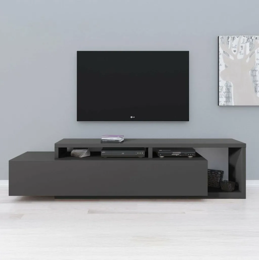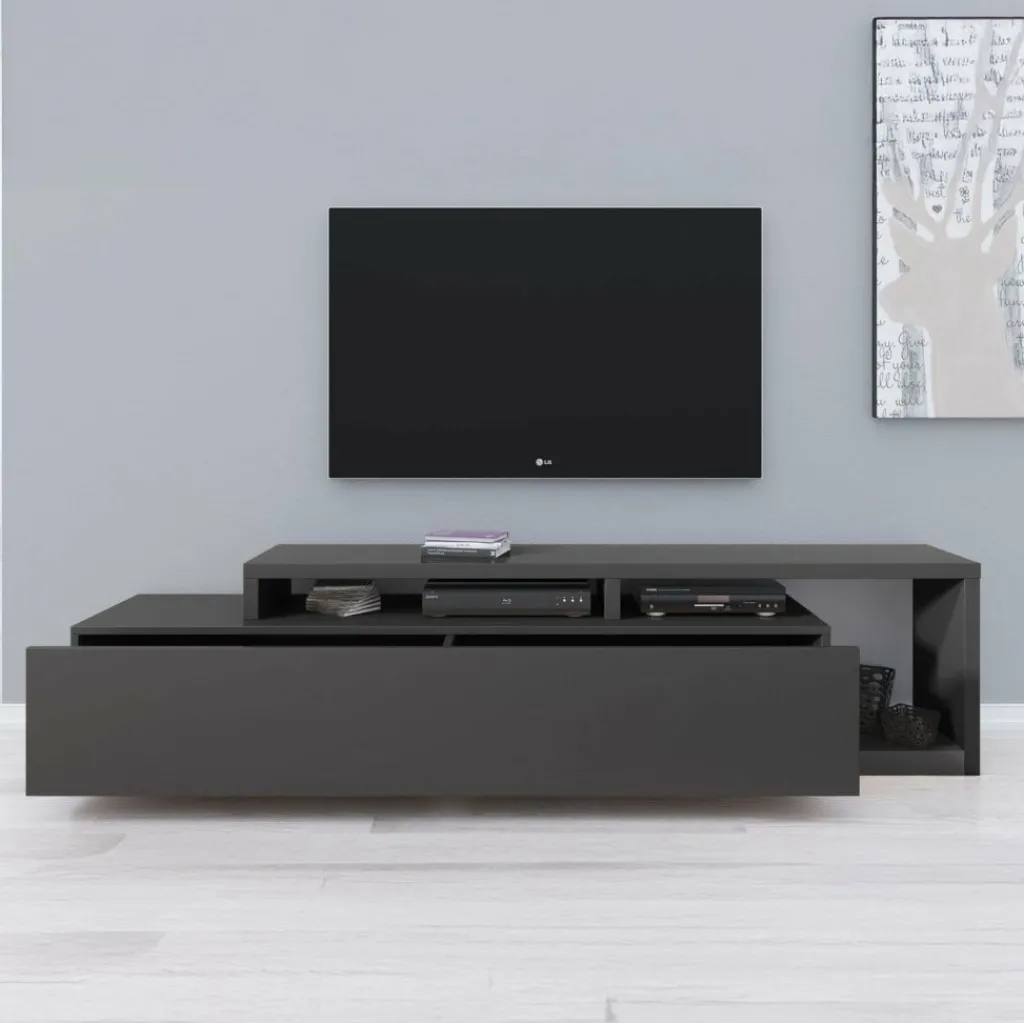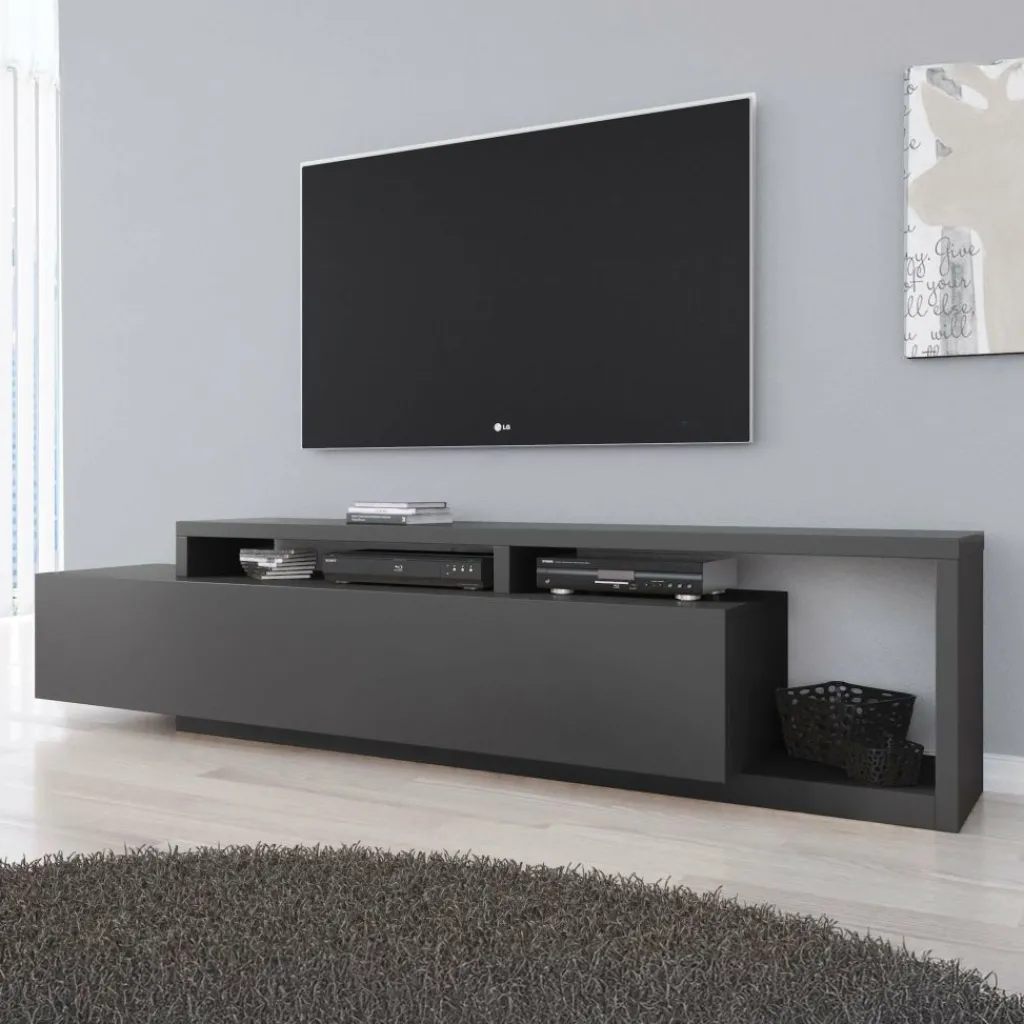 TV-Meubel Bello is een origineel vormgegeven kast geheel afgewerkt in antraciet. De kast is voorzien van een grote lade met daarachter voldoende opbergruimte. Boven op de lade en ernaast bevindt zich eveneens plek om apparatuur en andere spullen te plaatsen.