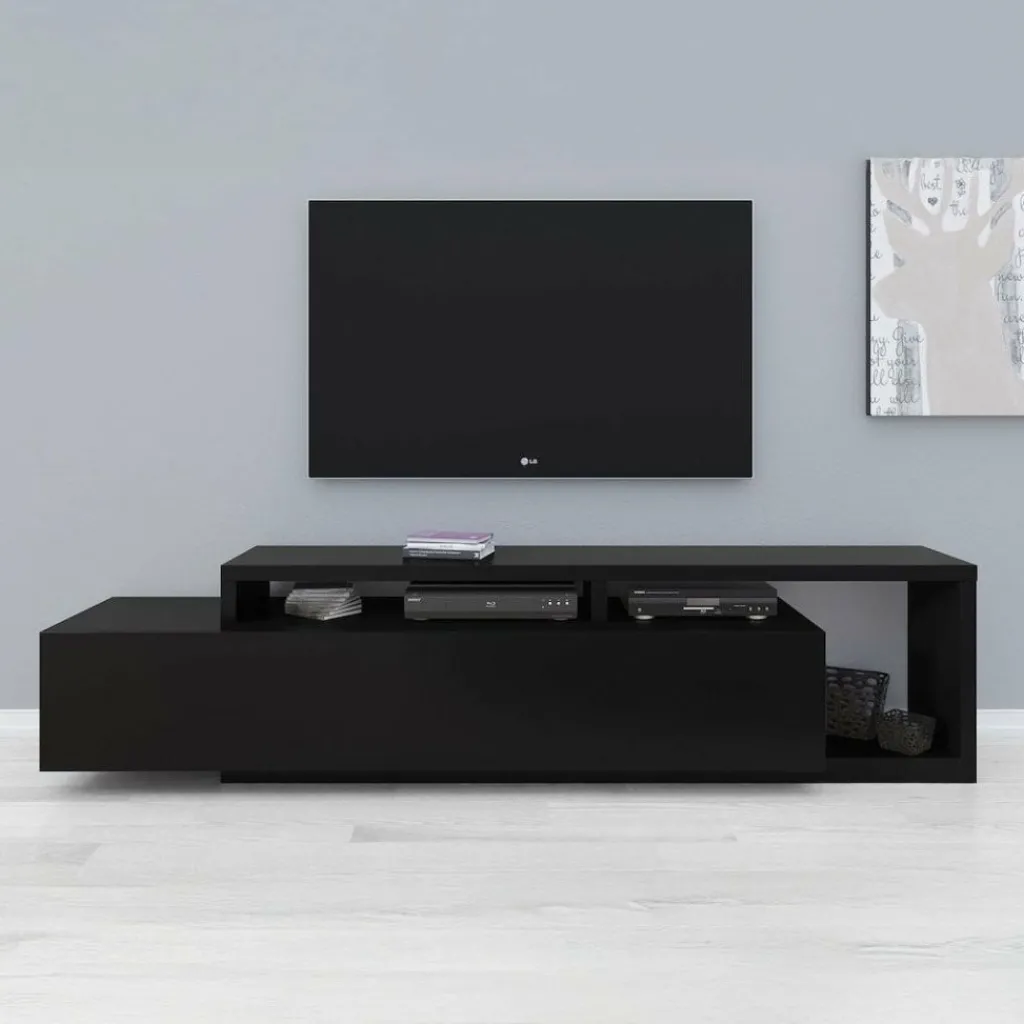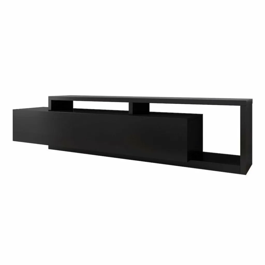TV-Meubel Bello is een strak vormgegeven kast geheel uitgevoerd in de kleur mat zwart. De kast is voorzien van één grote lade waarachter zich twee opbergvakken bevinden. Boven op de lade en ernaast bevindt zich eveneens plek om apparatuur en andere spullen te plaatsen.