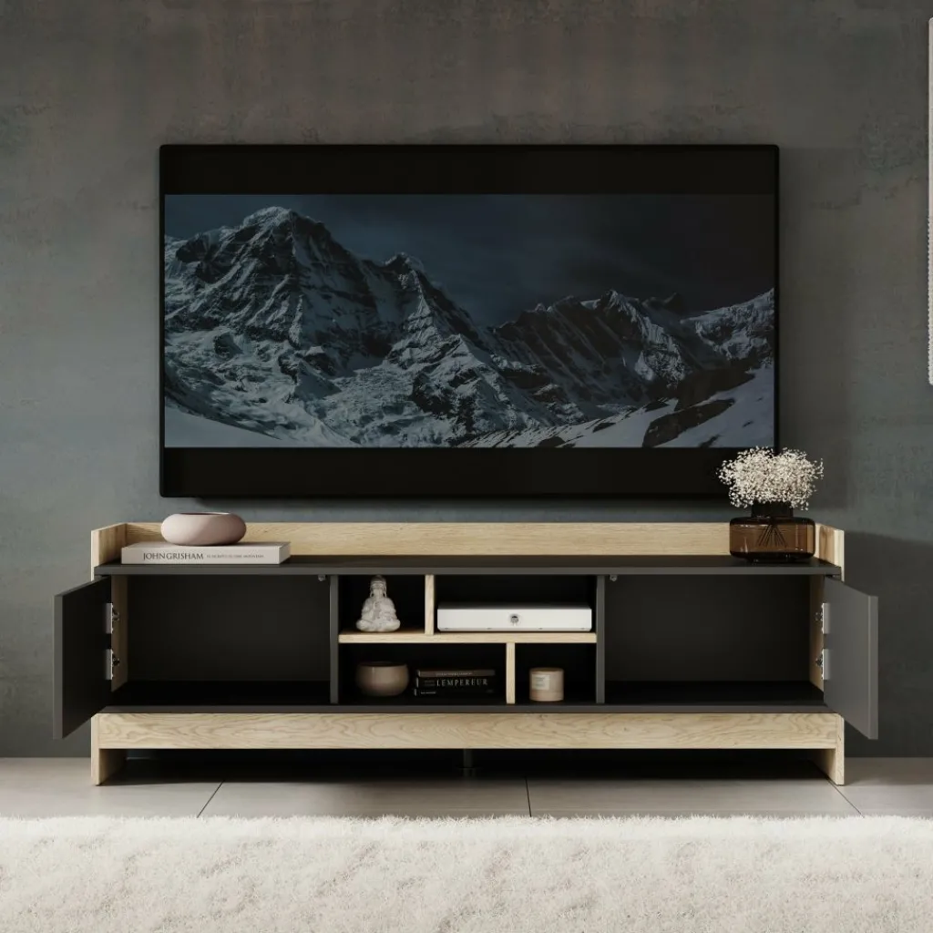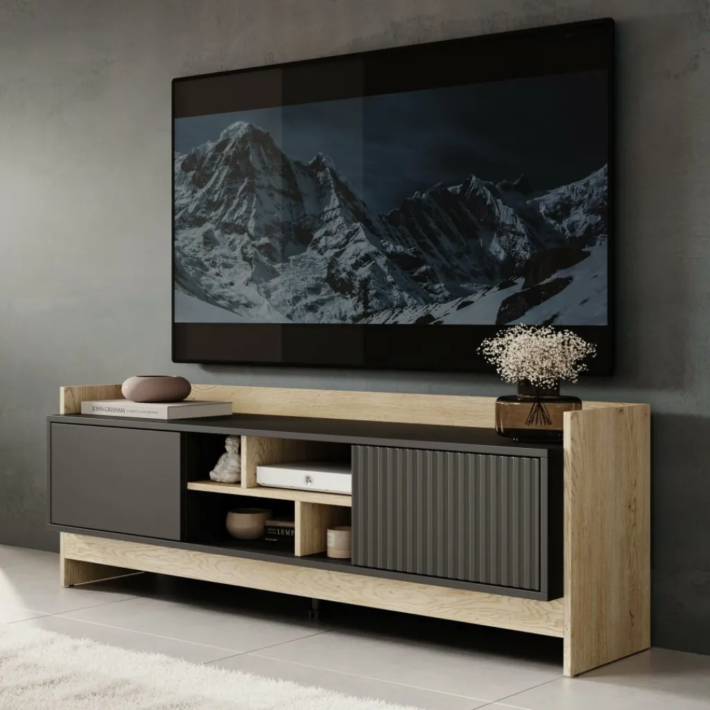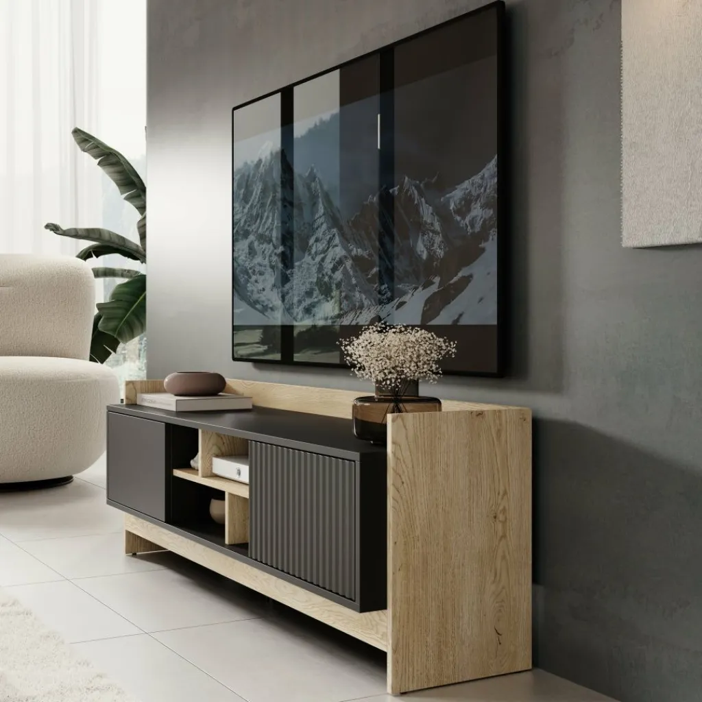 De Benz TV-meubel combineert moderne elegantie met praktisch gebruiksgemak. Met zijn strakke zwarte fronten en natuurlijke houtaccenten voegt dit meubel direct een stijlvol karakter toe aan jouw interieur. Het minimalistische ontwerp zorgt ervoor dat het naadloos aansluit bij uiteenlopende woonstijlen, van modern tot Scandinavisch.