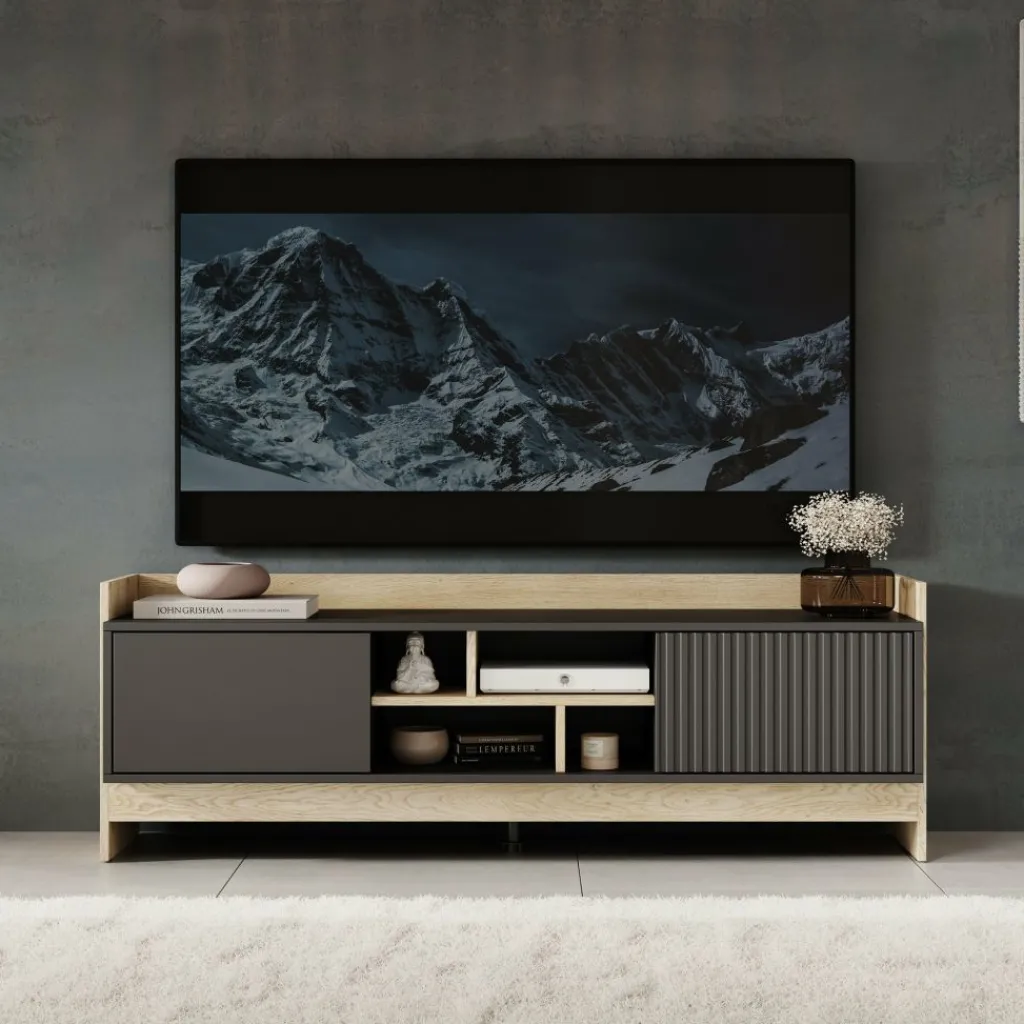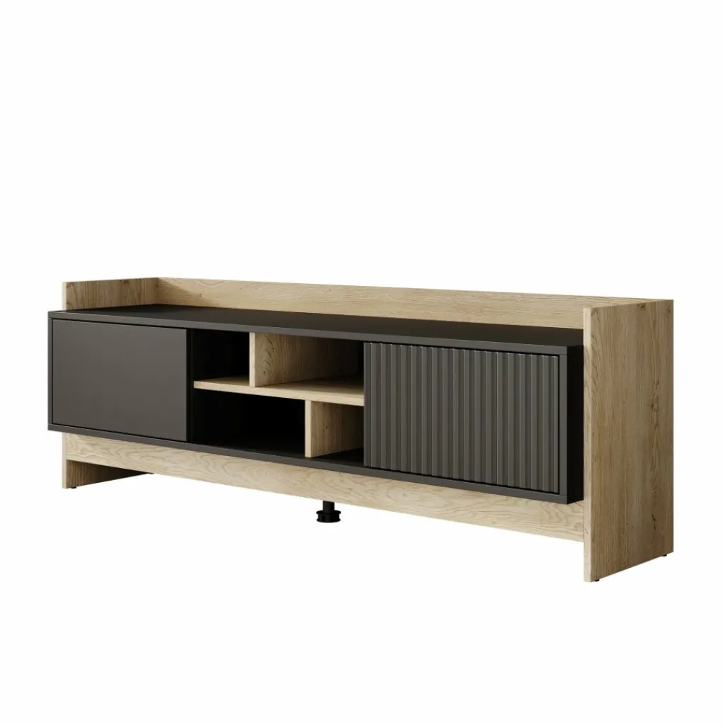 Dankzij de royale afmetingen van 150 cm breed biedt de Benz voldoende ruimte voor een grote televisie en al je multimedia-apparatuur. Achter de twee deuren vind je praktische opbergruimte voor accessoires, kabels of andere spullen die je netjes uit het zicht wilt houden. De open vakken zijn ideaal voor je spelconsole, mediabox of stijlvolle decoratie.