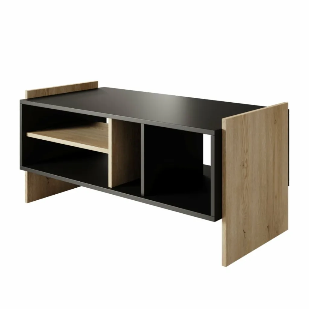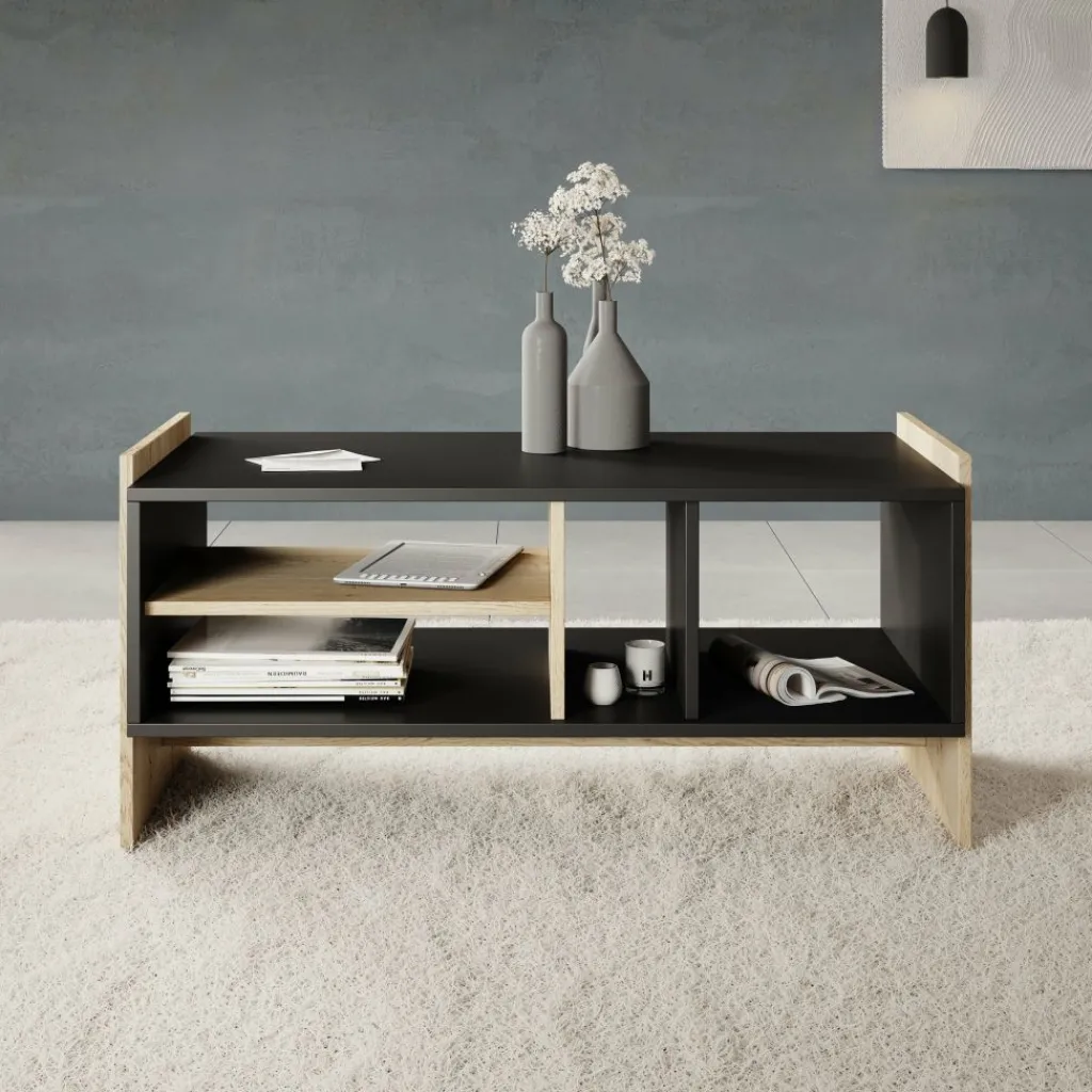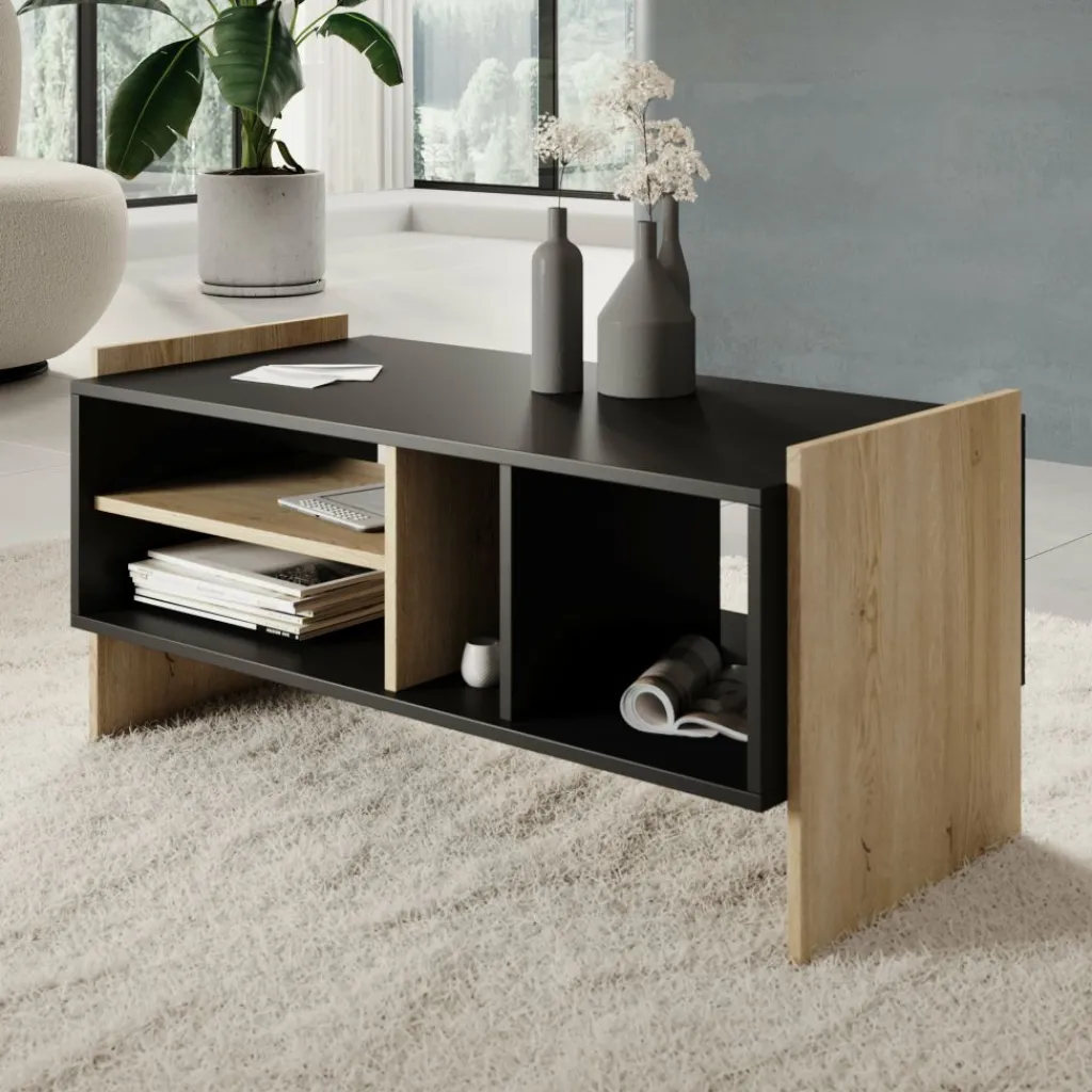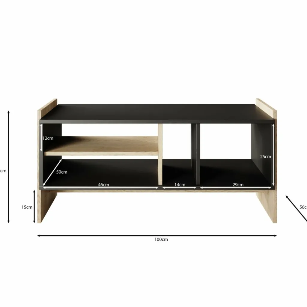 De combinatie van zwart met eikenhoutlook zijkanten zorgt voor een moderne en stoere uitstraling die goed past in een industrieel of modern interieur. Dankzij de slimme indeling met meerdere vakken blijft de woonkamer netjes en overzichtelijk.