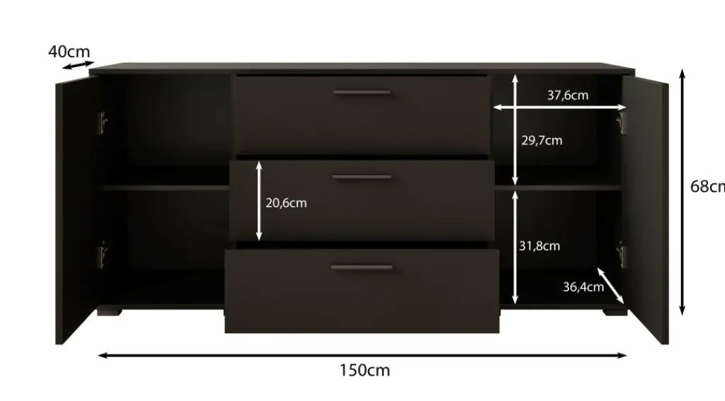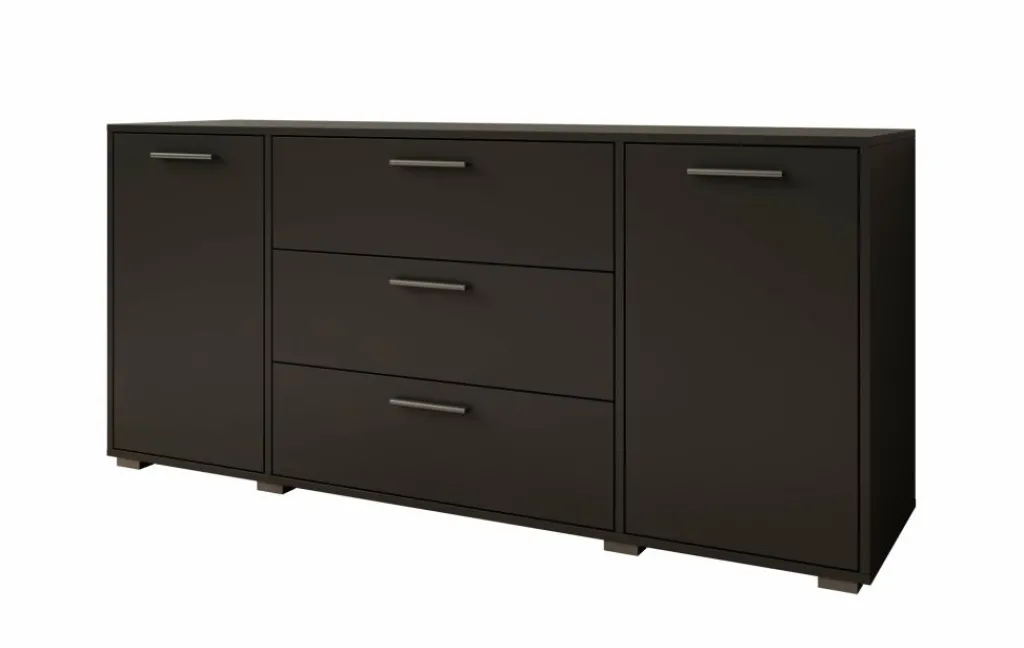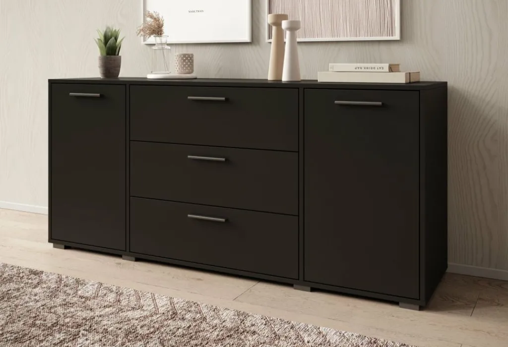 Dressoir Bonzo is een moderne designkast, uitgevoerd in een mat zwarte kleur. De kast beschikt over 2 deuren waarachter in totaal 4 opbergvakken zitten en 3 handige opberglades. De deuren en lades openen met zilverkleurige handgrepen. Door het strakke en eenvoudige design is dit meubel vooral passend binnen een moderne woonstijl.