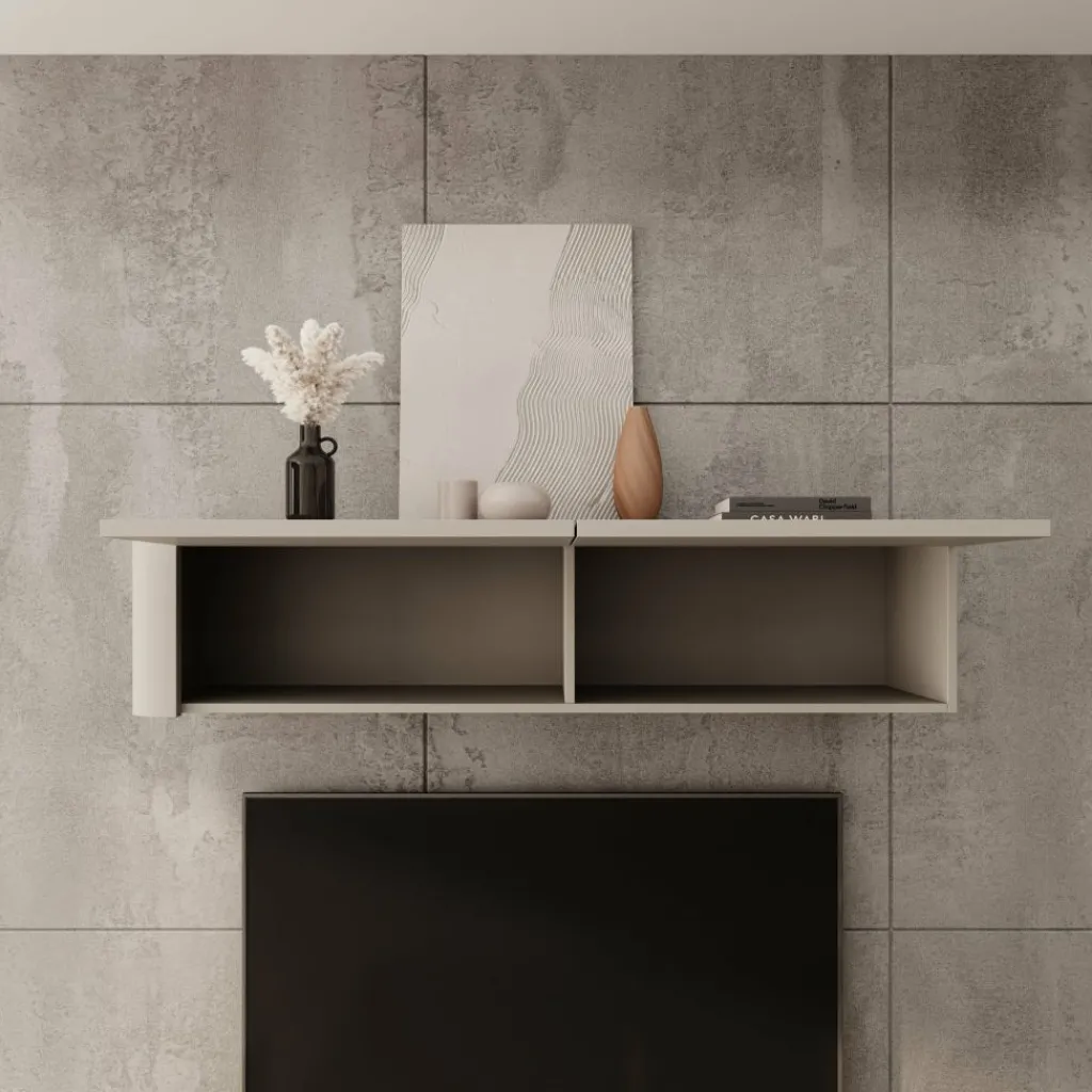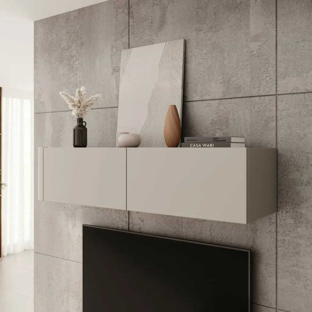 De beige afwerking geeft de wandkast een neutrale en moderne uitstraling die goed te combineren is met verschillende interieurstijlen. Bijou is een praktische wandoplossing voor boven een tv of als losse kast.