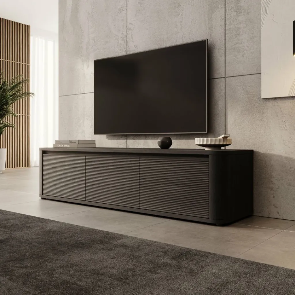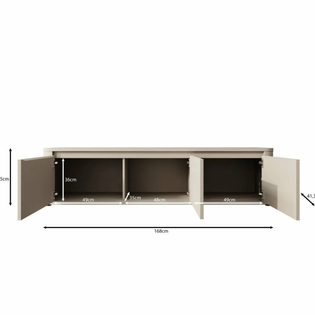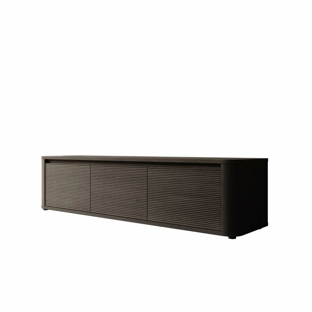 Achter de drie deuren bevinden zich meerdere opbergvakken die ruimte bieden voor elektronica, kabels en accessoires. De deuren zijn greeploos uitgevoerd en voorzien van een ribstructuur aan de voorzijde, wat zorgt voor een duidelijke en strakke frontindeling. Door de lage hoogte blijft het meubel praktisch in gebruik en goed in verhouding onder de tv.