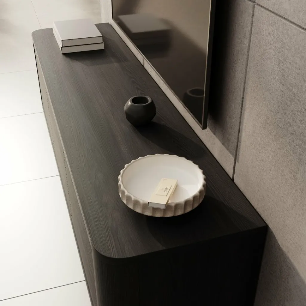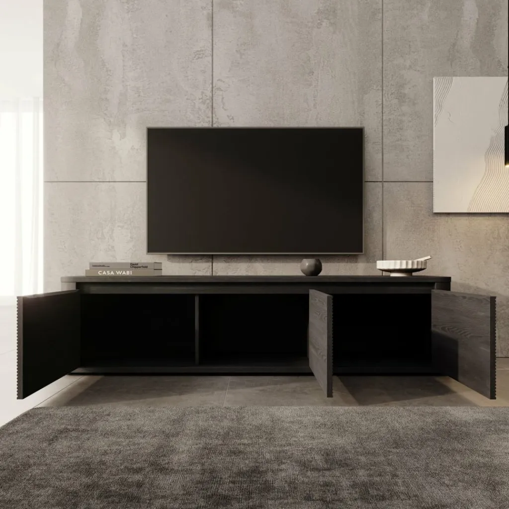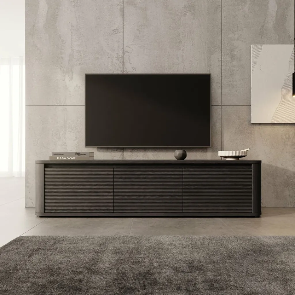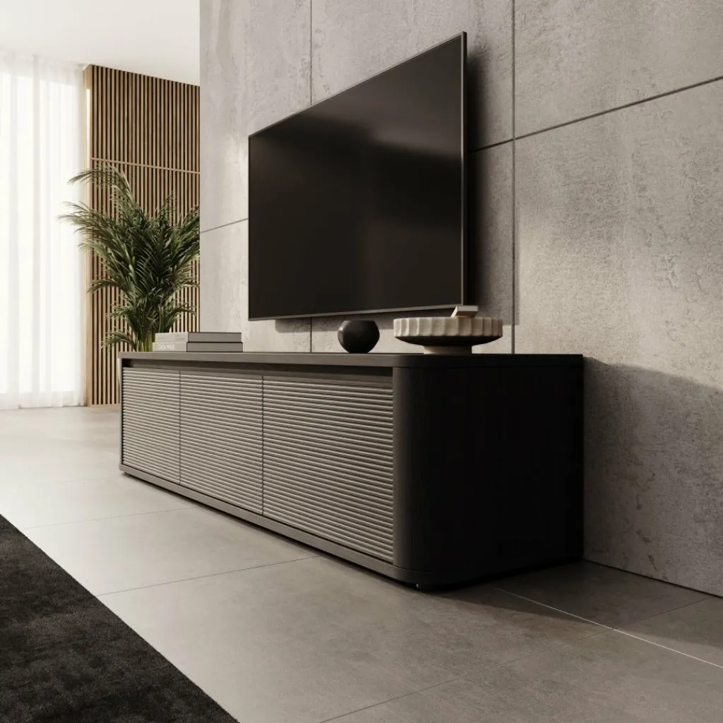 Achter de drie deuren bevinden zich meerdere opbergvakken die ruimte bieden voor elektronica, kabels en accessoires. De deuren zijn greeploos uitgevoerd en voorzien van een ribstructuur aan de voorzijde, wat zorgt voor een duidelijke en strakke frontindeling. Door de lage hoogte blijft het meubel praktisch in gebruik en goed in verhouding onder de tv.