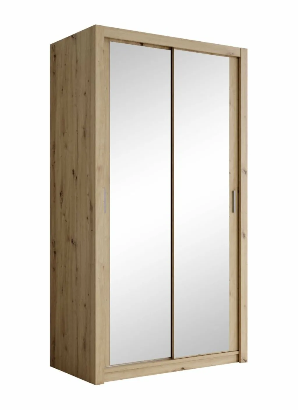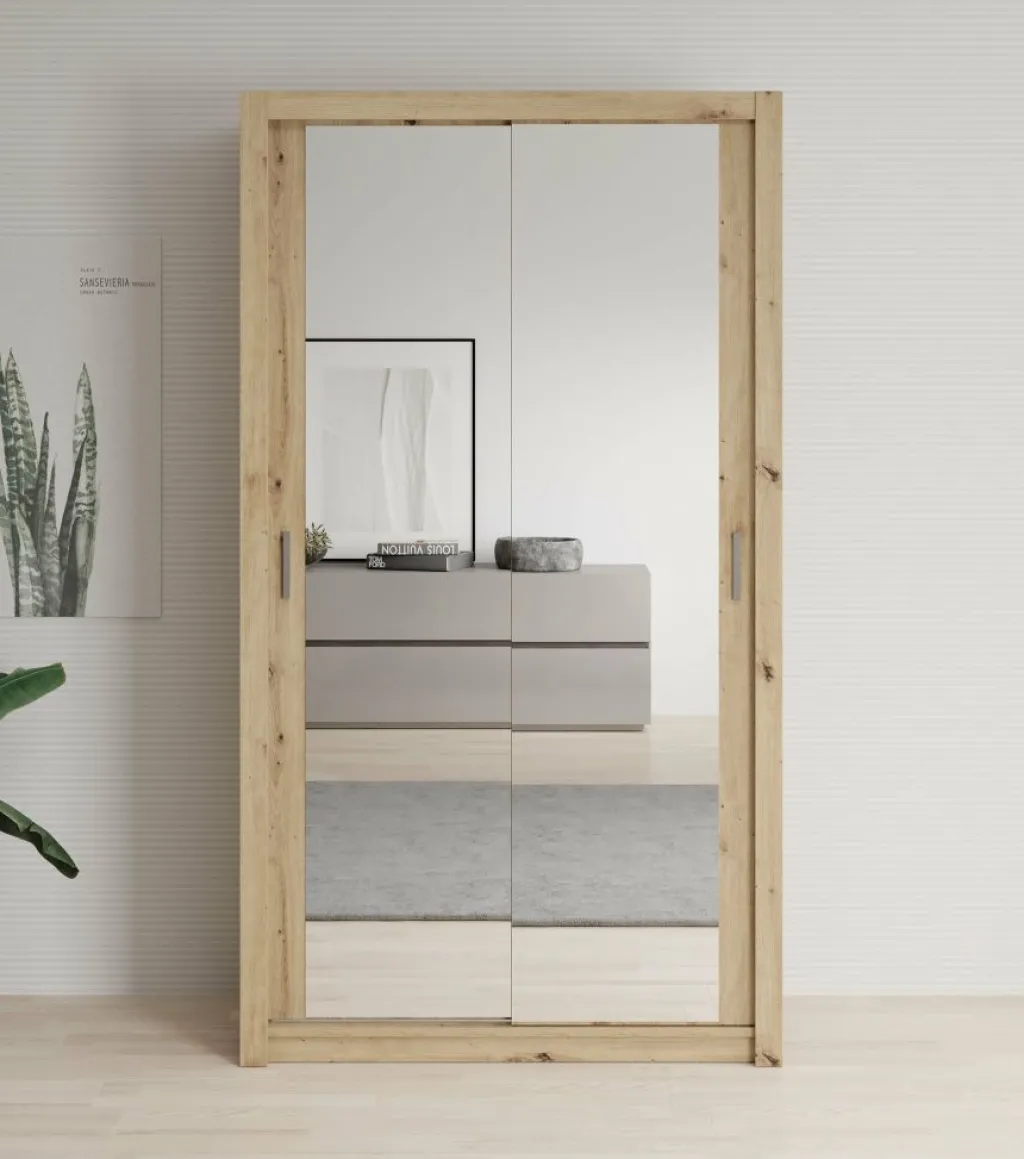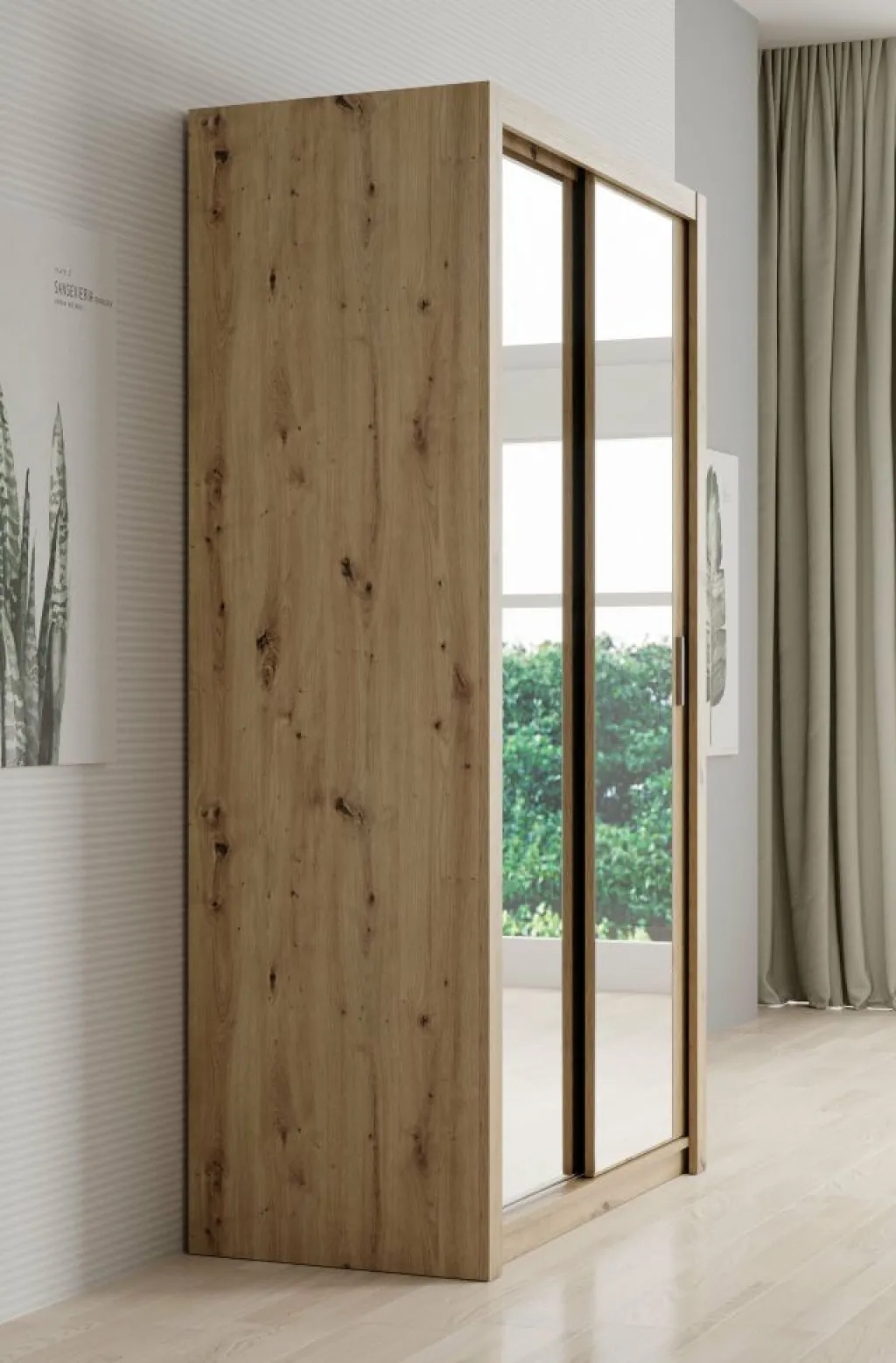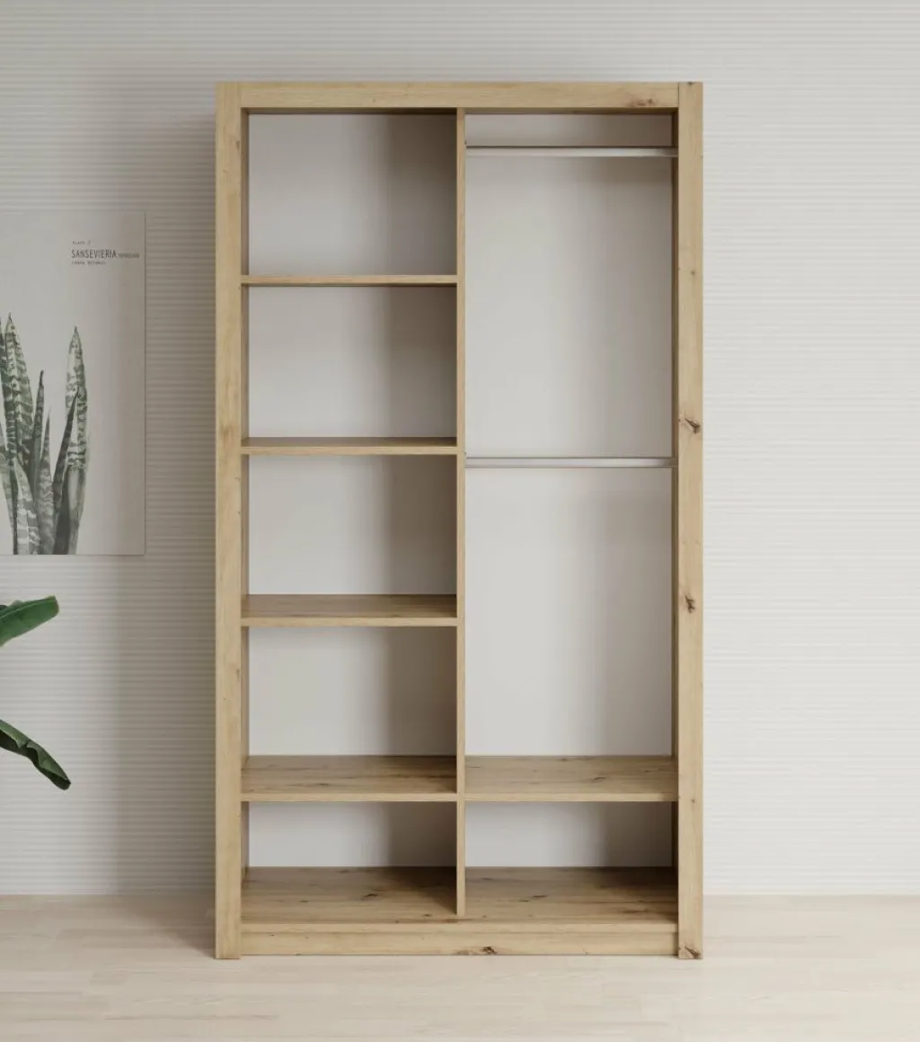 Kledingkast Blake is een moderne garderobekast uitgevoerd in eiken kleur. De kledingkast heeft twee schuifdeuren met daarachter veel opbergruimte. In de binnenkant van de kast vind je 6 opbergvakken. Daarnaast beschikt de kast over twee stangen om kleding op te hangen.