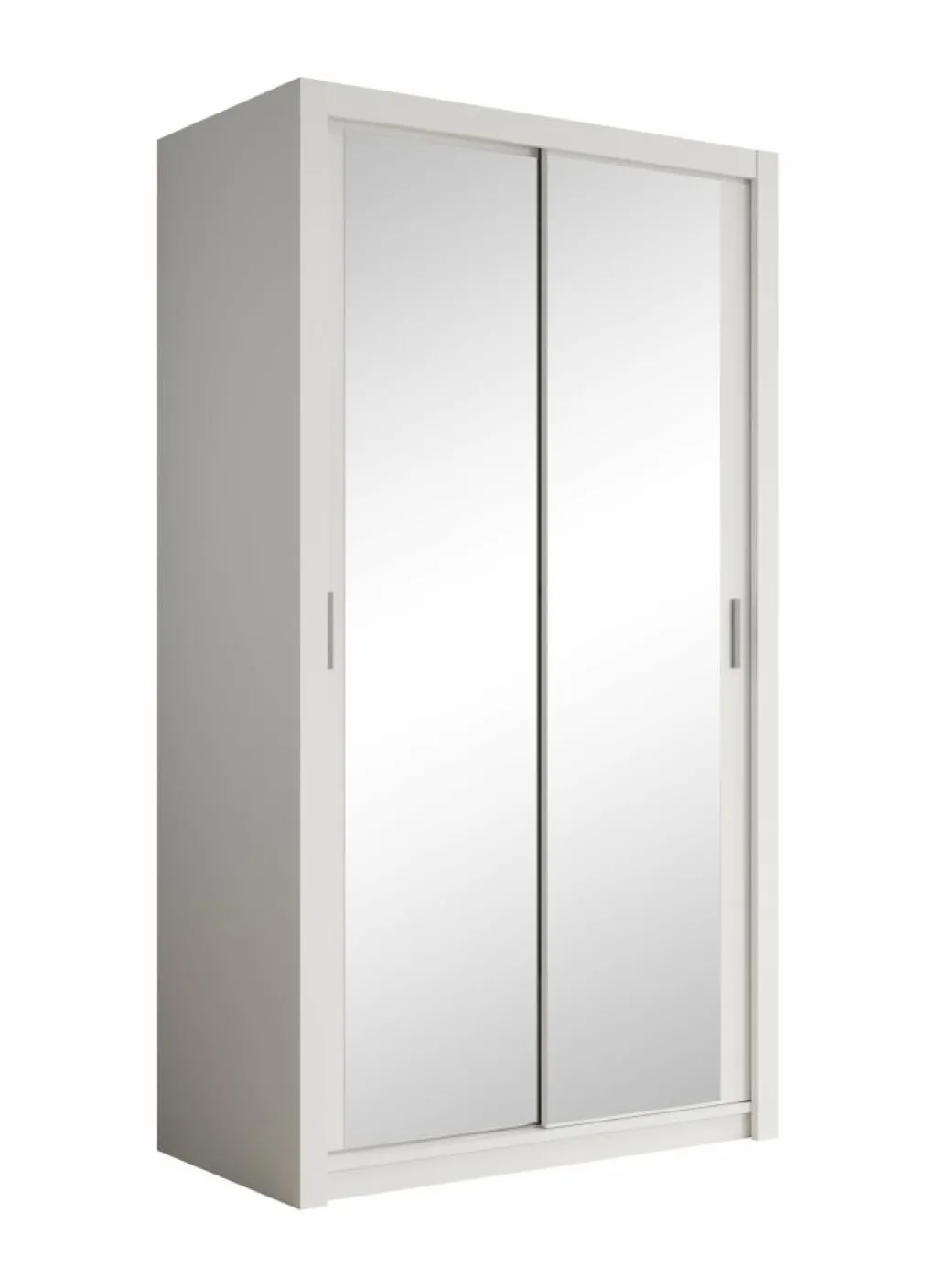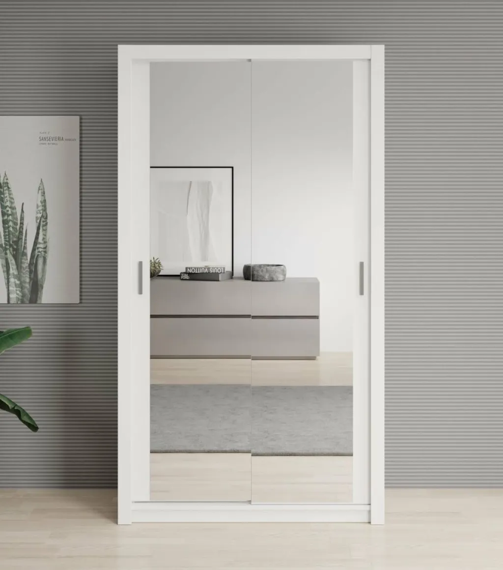 Kledingkast Blake is een moderne garderobekast uitgevoerd in mat witte kleur. De kledingkast heeft twee schuifdeuren met daarachter veel opbergruimte. In de binnenkant van de kast vind je 6 opbergvakken. Daarnaast beschikt de kast over twee stangen om kleding op te hangen.