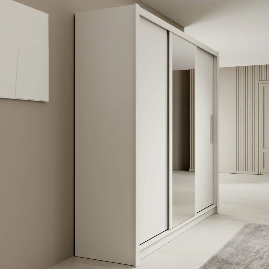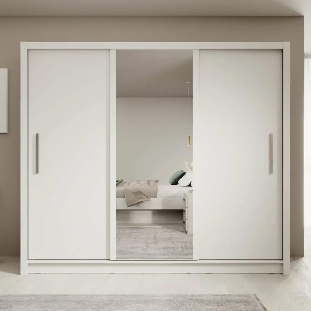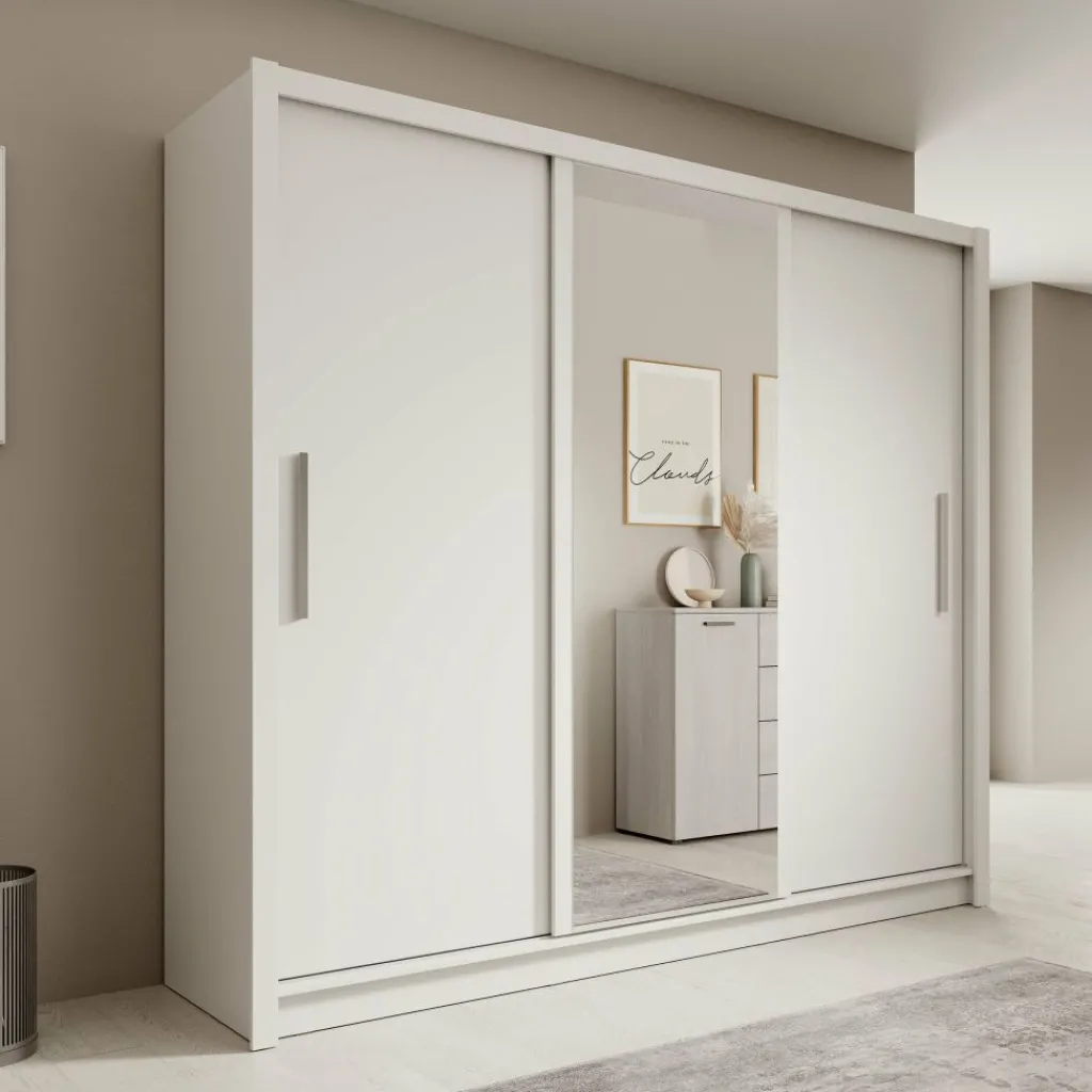 De Blue kledingkast in wit biedt royale opbergruimte en een tijdloze uitstraling die perfect past in elke slaapkamer. De kast beschikt over drie brede schuifdeuren, waarvan één met een grote spiegel. Deze spiegeldeur zorgt voor extra gemak tijdens het aankleden en laat de kamer optisch groter en lichter aanvoelen.