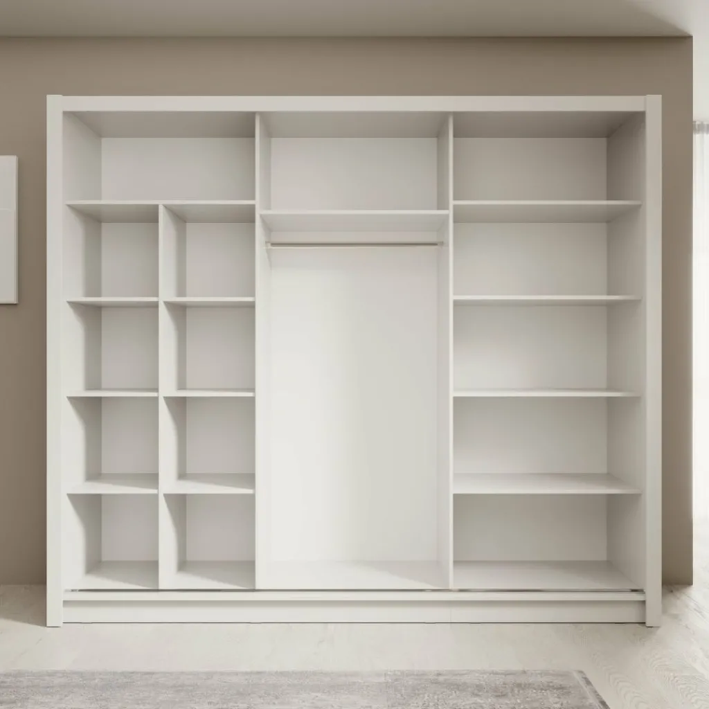Binnenin is de kast praktisch ingedeeld met meerdere legplanken en een ruime hangsectie, ideaal voor het overzichtelijk opbergen van kleding, schoenen en accessoires. De schuifdeuren bewegen soepel en besparen ruimte, waardoor de kast ook geschikt is voor kleinere kamers.