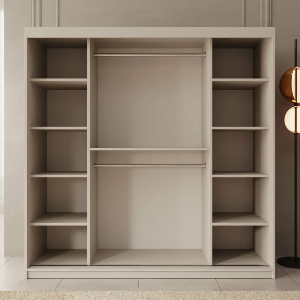 De Bodhi kledingkast van 200 cm breed combineert royale opbergruimte met een strak en modern ontwerp. De kast beschikt over meerdere legplanken en een groot hanggedeelte, ideaal voor kledingstukken die netjes opgeborgen moeten worden. De schuifdeuren zorgen ervoor dat de kast eenvoudig te openen is, zonder extra ruimte in beslag te nemen.