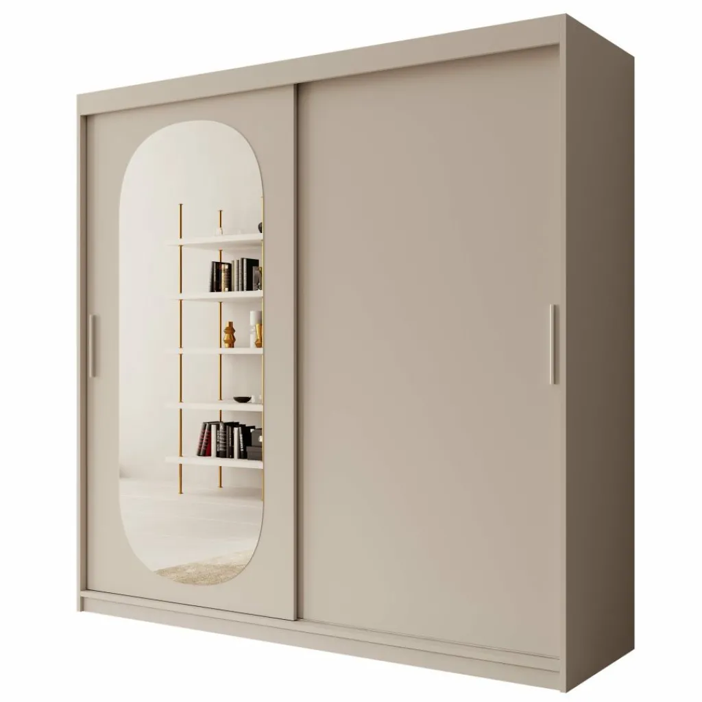 De beige kleur geeft de kast een tijdloze, neutrale uitstraling, terwijl de spiegeldeur bijdraagt aan een luxueuze en ruimtelijke look. Perfect voor middelgrote tot grotere slaapkamers waar zowel stijl als functionaliteit belangrijk zijn.