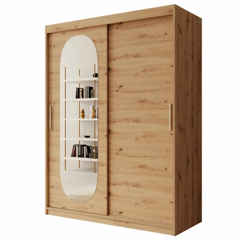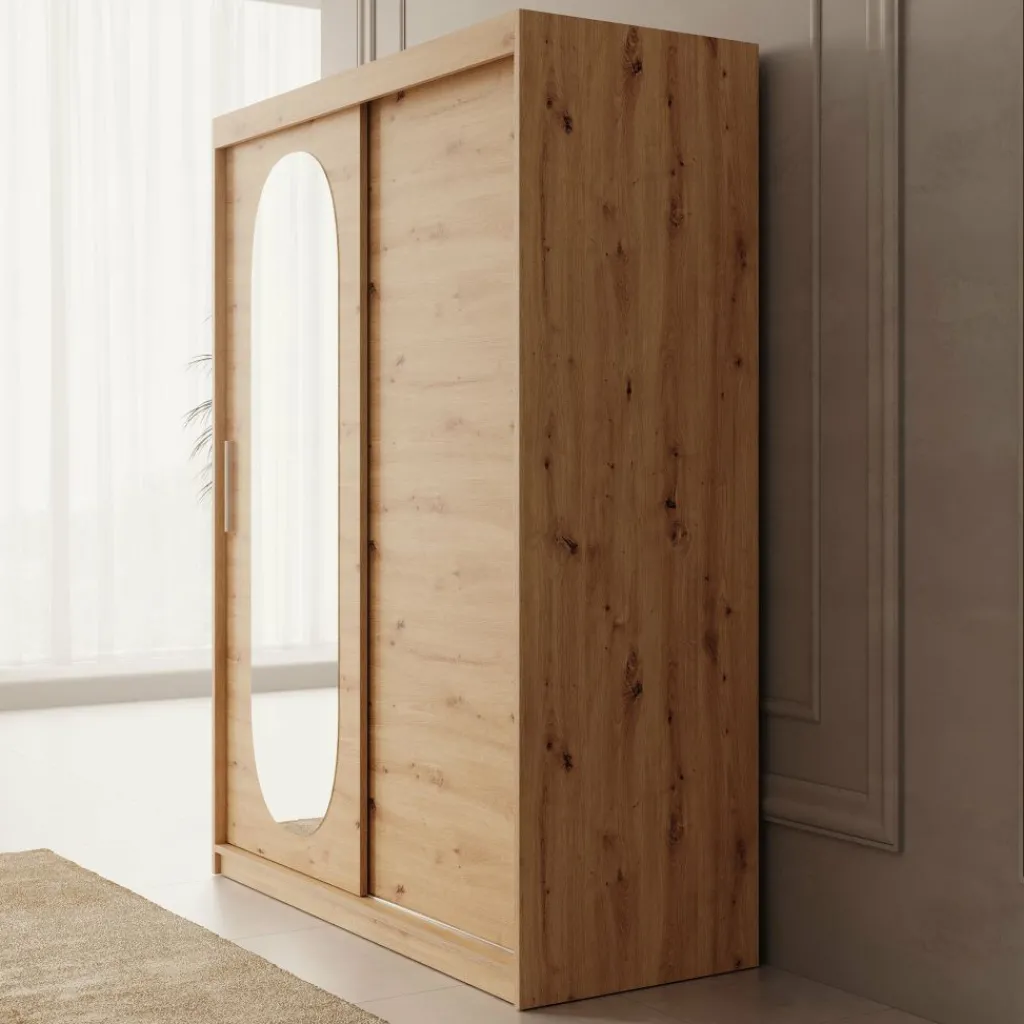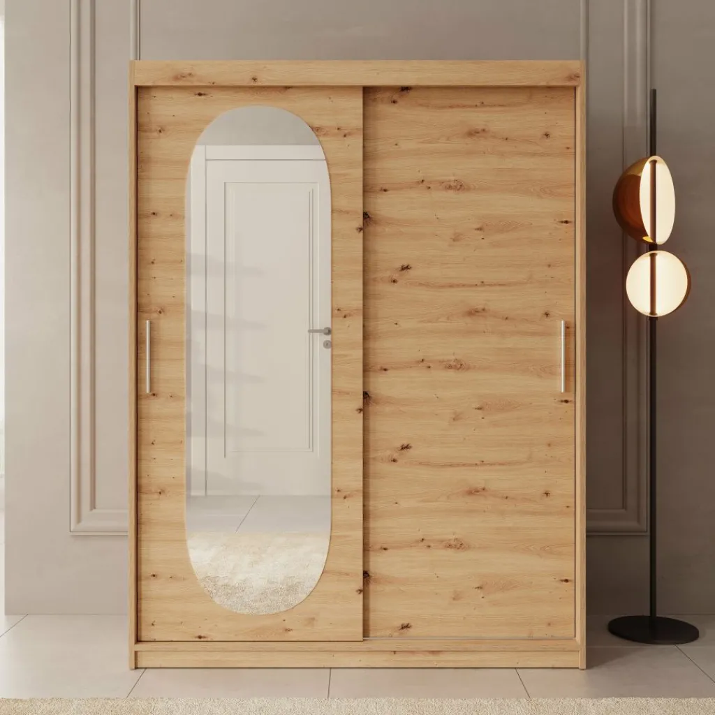 De Bodhi kledingkast van 150 cm breed is een compacte, maar stijlvolle oplossing voor wie toch voldoende opbergruimte zoekt. Achter de schuifdeuren vind je een slimme indeling met zowel legplanken als een hanggedeelte, zodat je gemakkelijk al je kleding, schoenen en accessoires kunt organiseren. Het warme eiken decor geeft de kast een natuurlijke en rustige uitstraling, terwijl de grote spiegeldeur niet alleen praktisch is, maar ook zorgt voor meer licht en een ruimtelijk effect in je slaapkamer. Dankzij het schuifdeursysteem neemt de kast weinig ruimte in beslag, ideaal voor kleinere kamers of appartementen waar iedere centimeter telt.