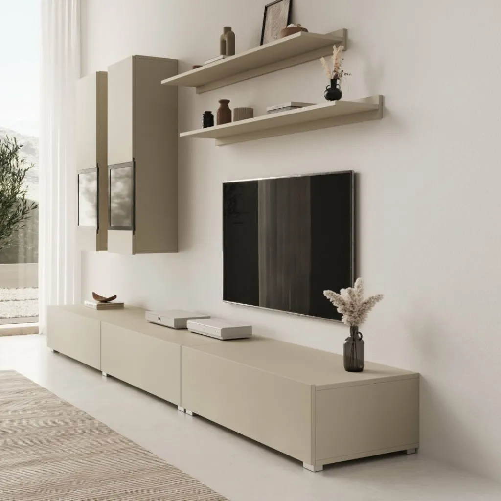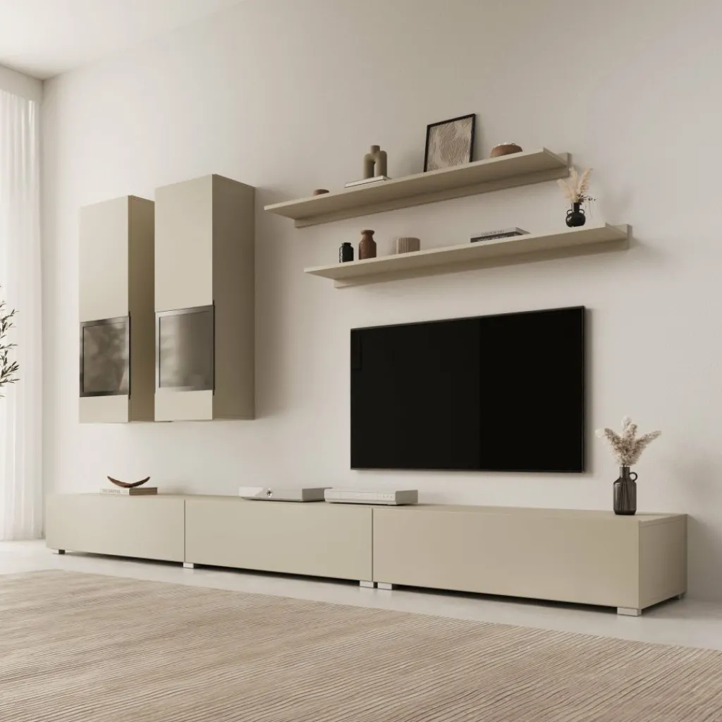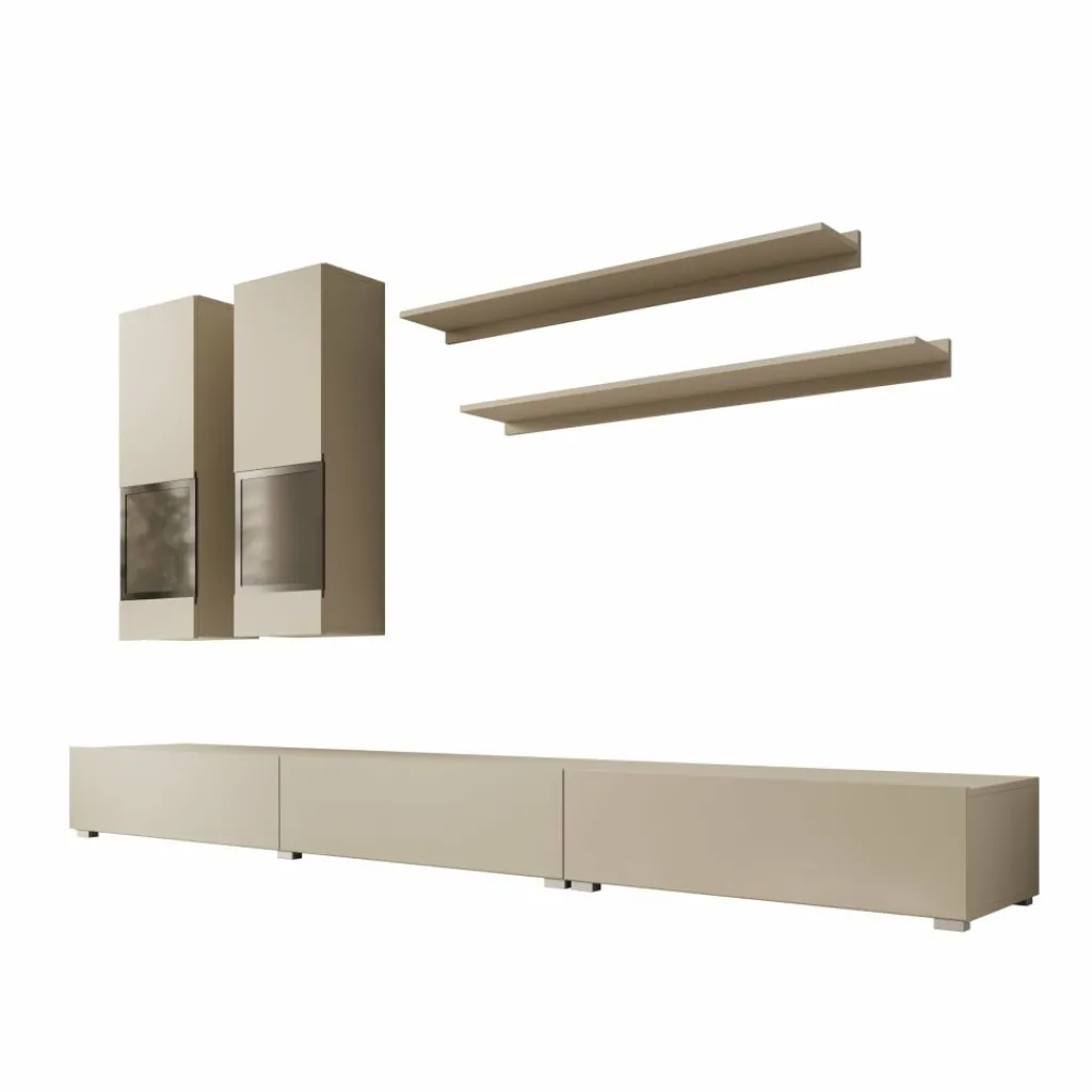 Het Bolivar wandmeubel is uitgevoerd in een warme beige kleur en heeft een strak, laag design met een rustige en verfijnde uitstraling. De combinatie van een langwerpig tv-meubel, twee wandkasten met glasvitrine en twee zwevende wandplanken zorgt voor een complete en evenwichtige wandsamenstelling die past bij een modern of minimalistisch interieur. Het frame, de leggers, tussenwanden en fronten zijn gemaakt van 15 mm spaanplaat, de achterwanden zijn gemaakt van 3 mm HDF en de poten zijn gemaakt van kunststof. Het meubel is voorzien van metalen scharnieren.