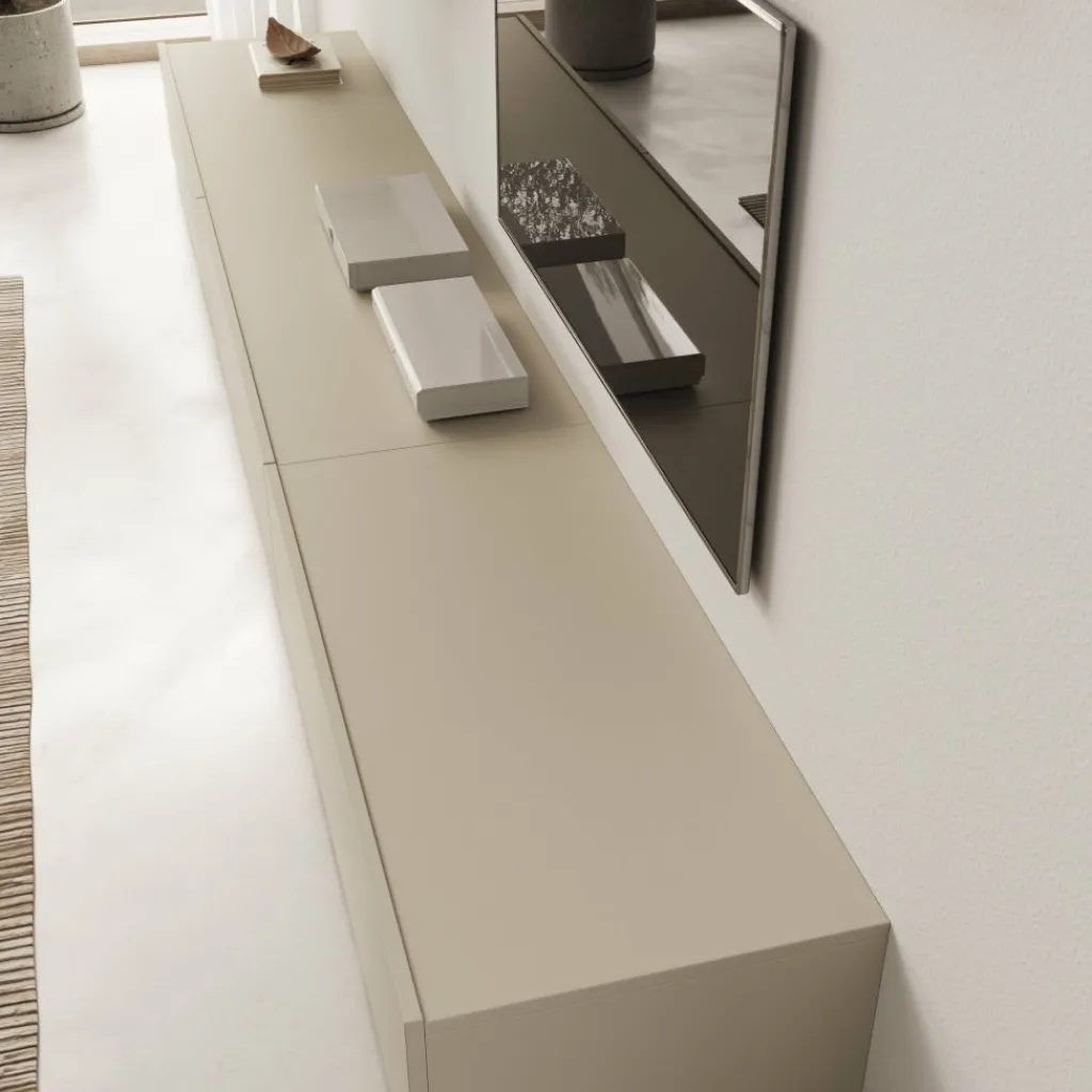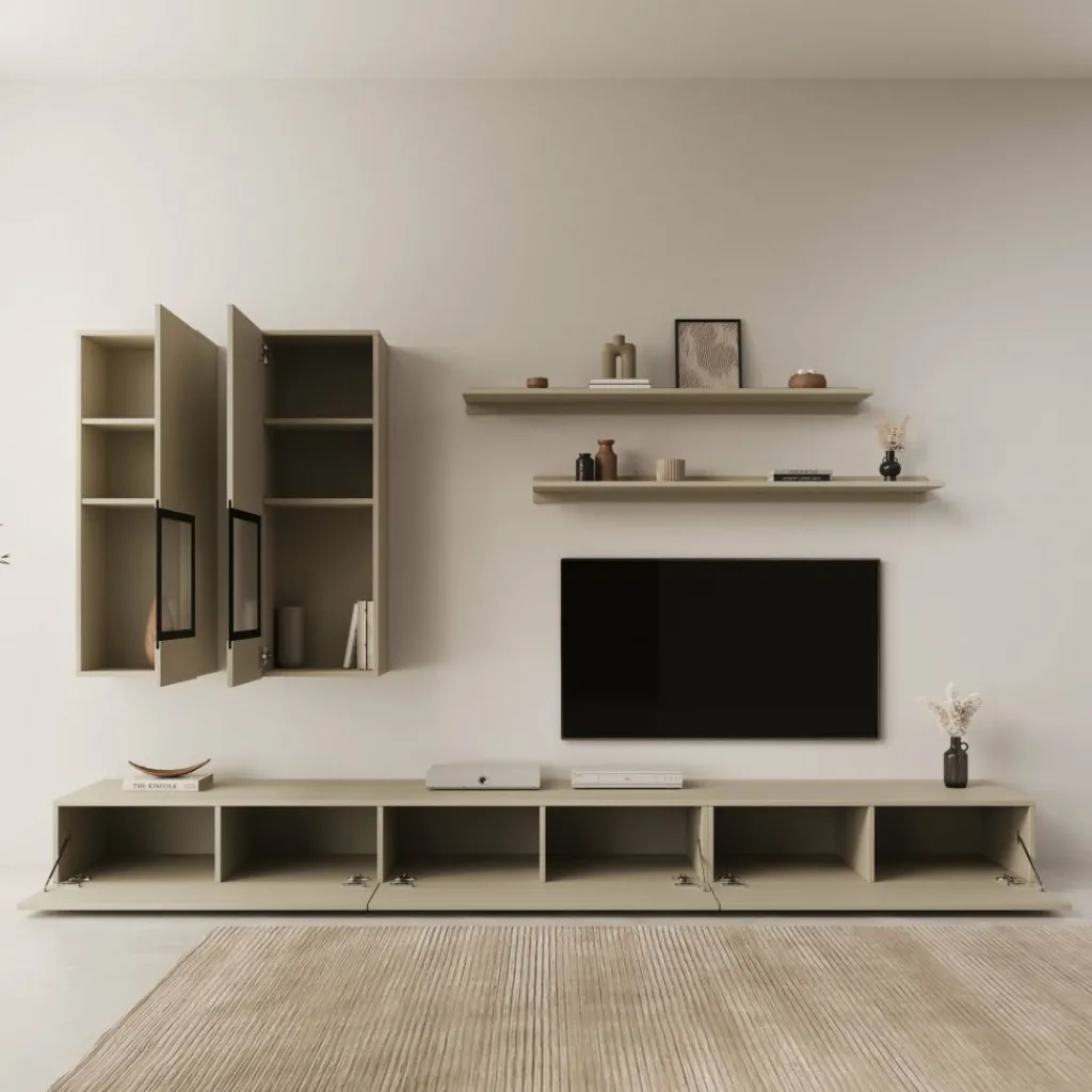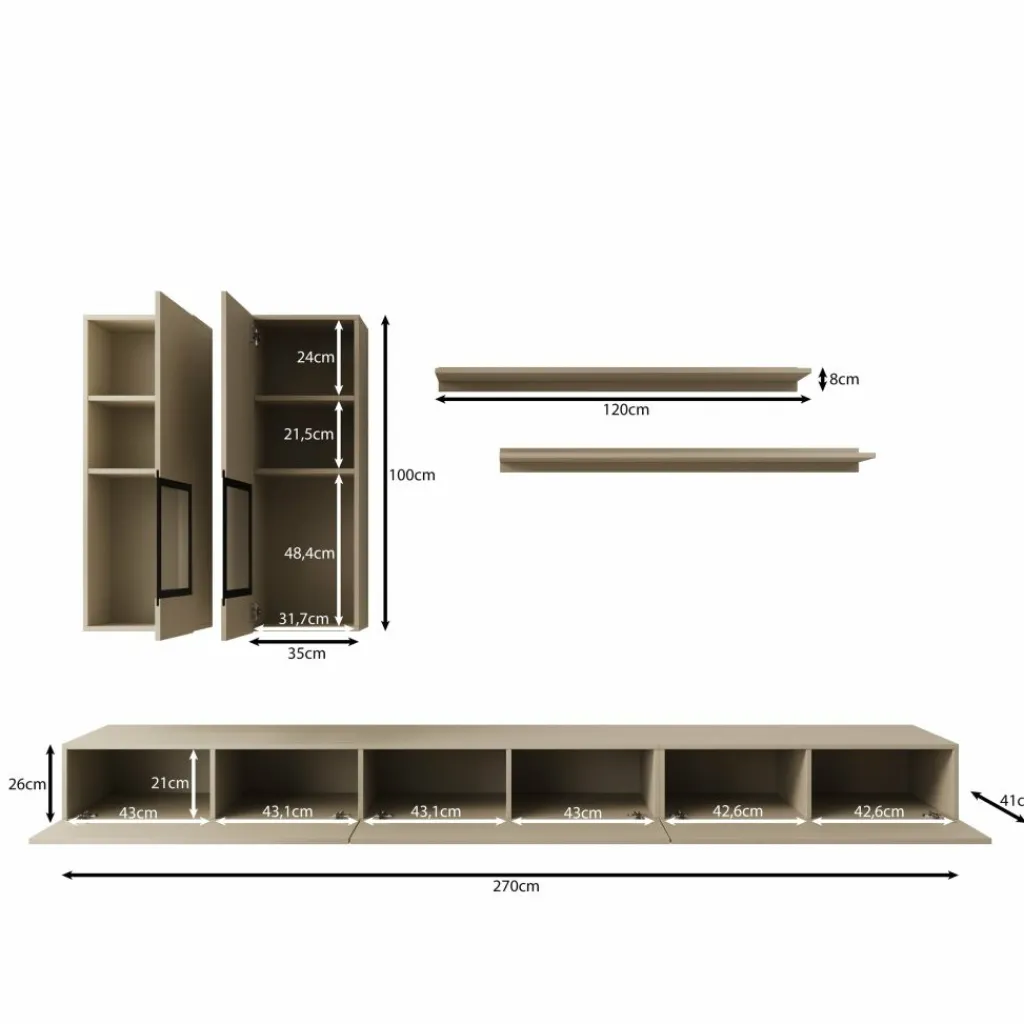 Het tv-meubel heeft een totale breedte van 270 cm en een hoogte van 26 cm en beschikt over zes open vakken aan de voorzijde, elk met een breedte van circa 43 cm en een diepte van 41 cm, afsluitbaar met kleppen. Het maximale draaggewicht op het meubel bedraagt 40 kg. De twee wandkasten zijn elk 35 cm breed en 100 cm hoog en beschikken over een open vak bovenin, een glasvitrinevak in het midden en een gesloten vak onderaan met een deur. De opstelling van de wandkasten is naar eigen voorkeur in te stellen — ze kunnen naast elkaar, boven elkaar of op een andere positie ten opzichte van het tv-meubel worden geplaatst, zodat het wandmeubel altijd aansluit bij jouw ruimte en smaak.