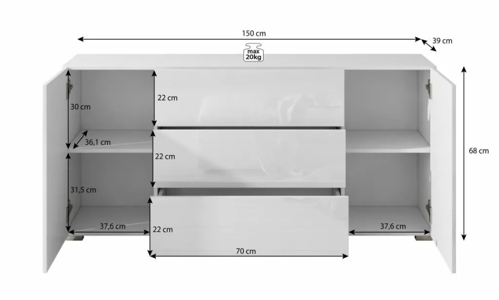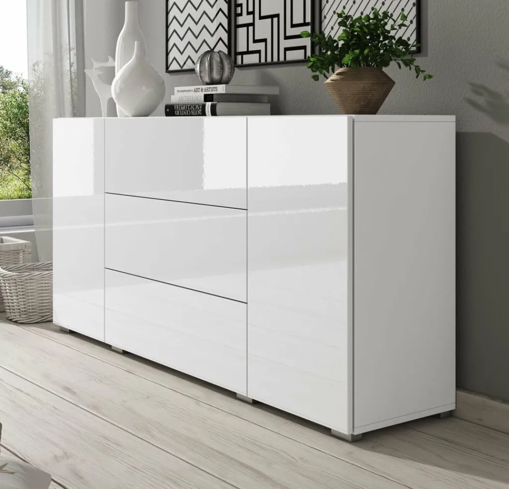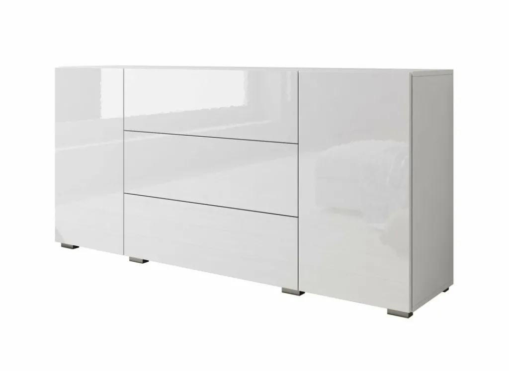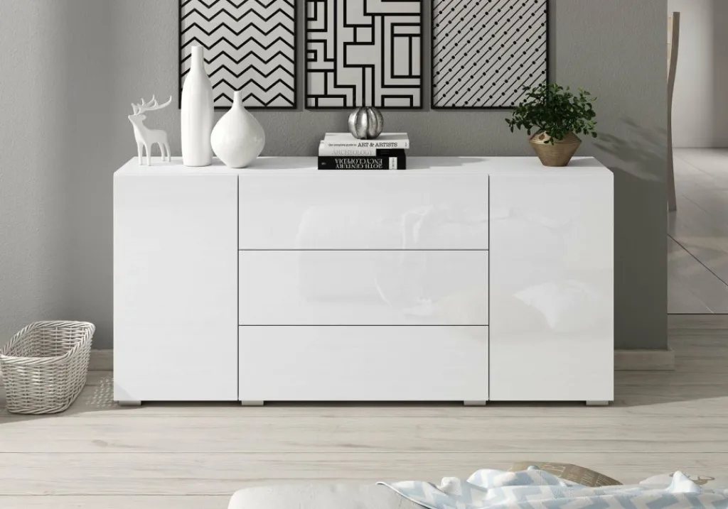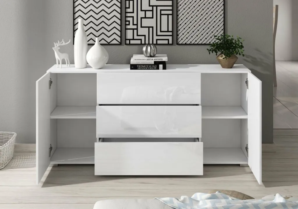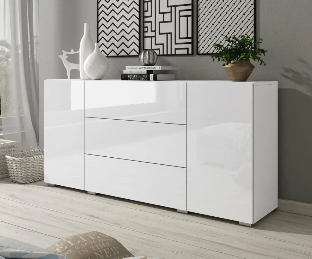Dressoir Bonzo is een moderne designkast, uitgevoerd in een witte kleur met hoogglans witte deurtjes en lades. De kast beschikt over 2 openslaande deuren en drie handige opberglades. Door het strakke en eenvoudige design is dit meubel vooral passend binnen een moderne woonstijl.