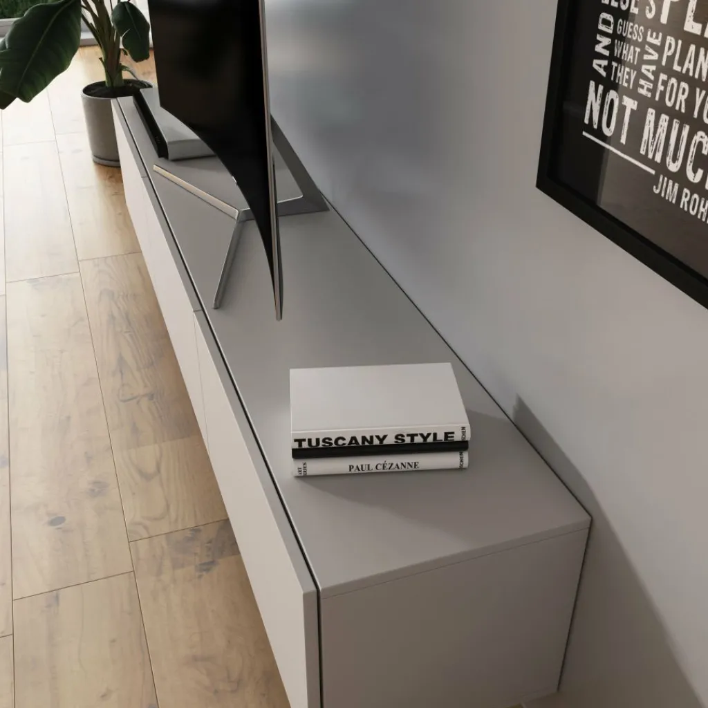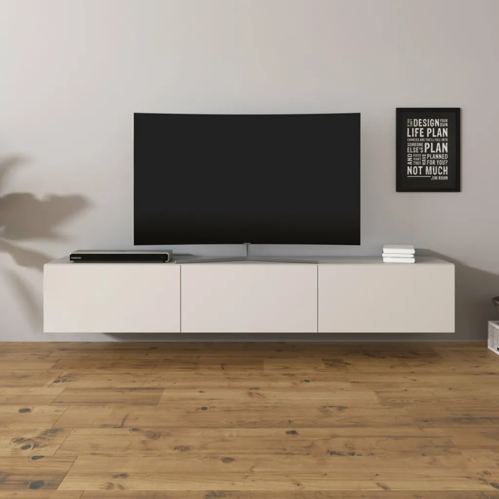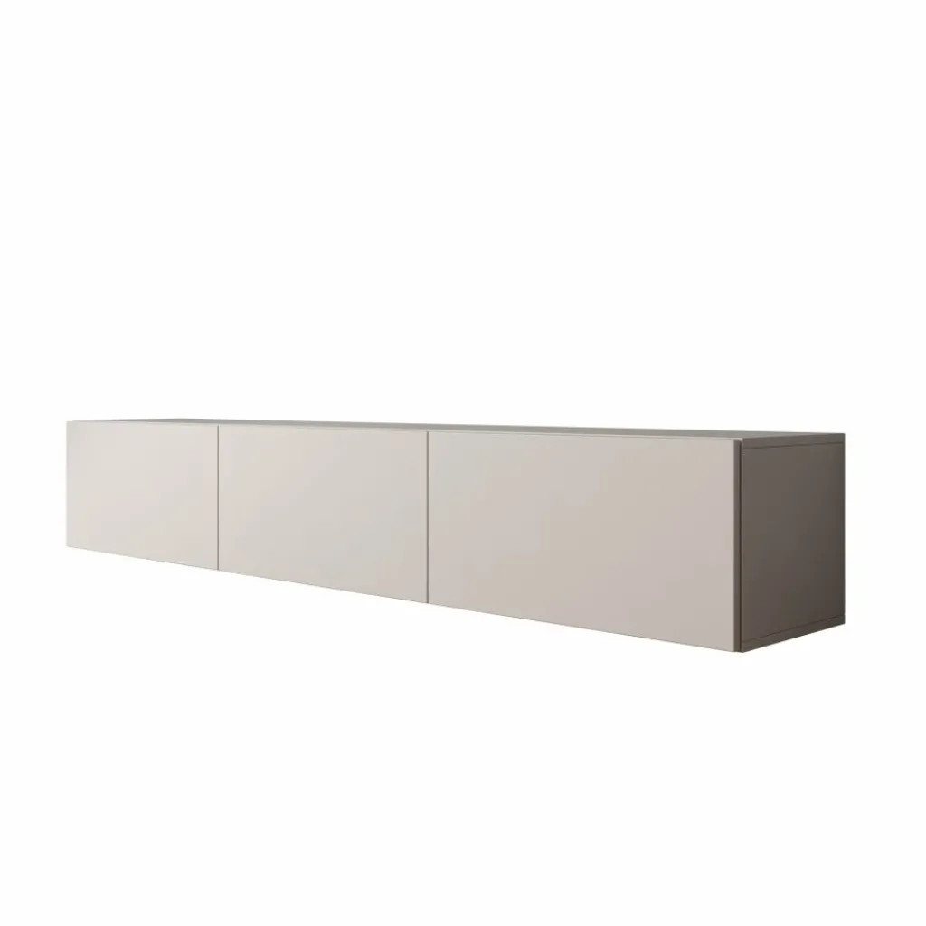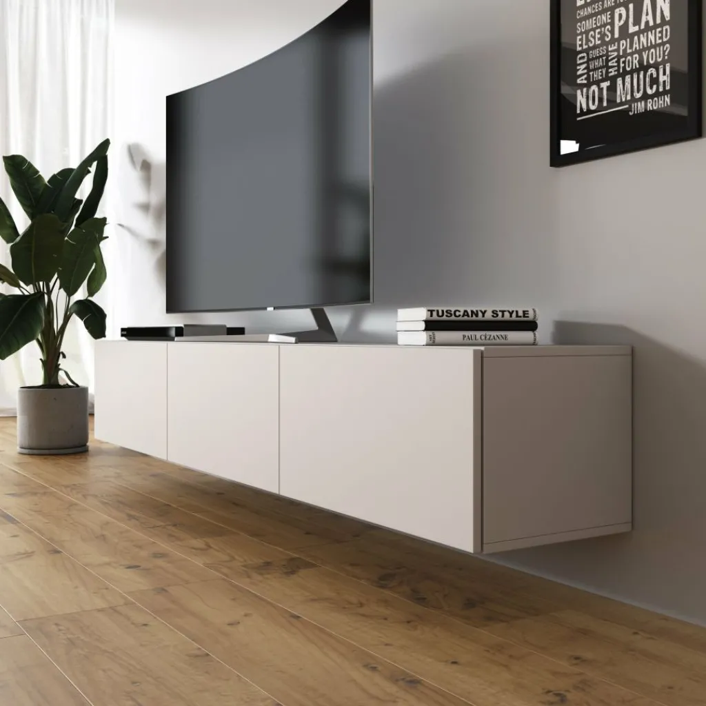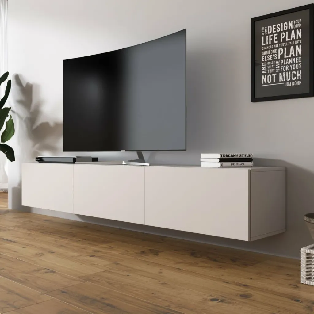 Dit zwevende TV-meubel houdt de vloer vrij en zorgt voor een strakke, opgeruimde aanblik. De beige kleur sluit goed aan bij rustige interieurs en biedt een neutrale basis voor je TV-opstelling. Met een breedte van 180 cm is er voldoende ruimte voor je televisie en apparatuur.