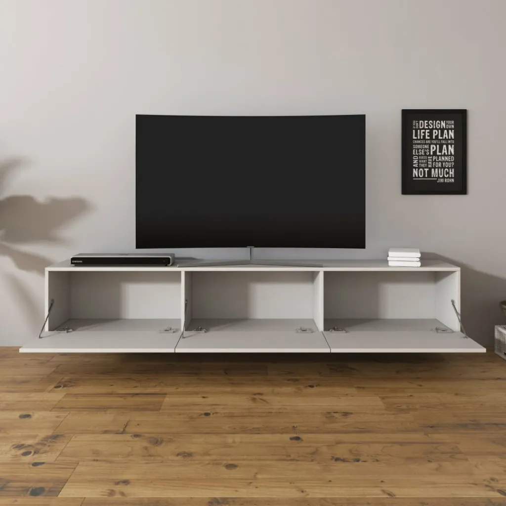 Achter de klepdeuren vind je drie gelijk verdeelde vakken die geschikt zijn voor media-apparatuur, accessoires of kleine opslag. De deuren openen naar beneden en blijven stabiel dankzij de metalen steunen, waardoor je eenvoudig bij de inhoud kunt. Het meubel is onderhoudsvriendelijk en ontworpen voor dagelijks gebruik aan de wand.