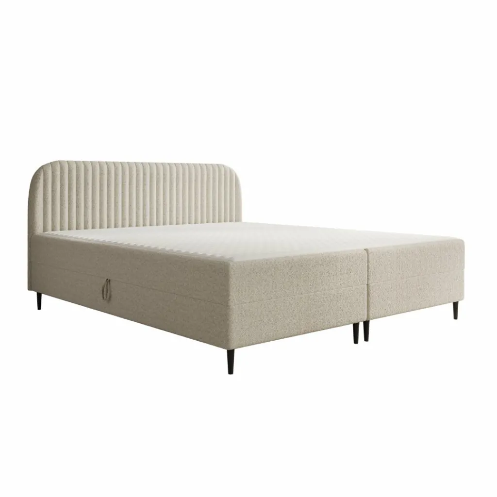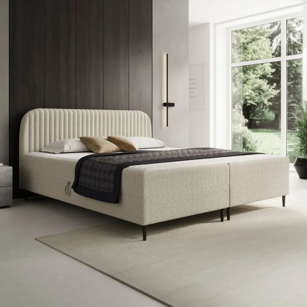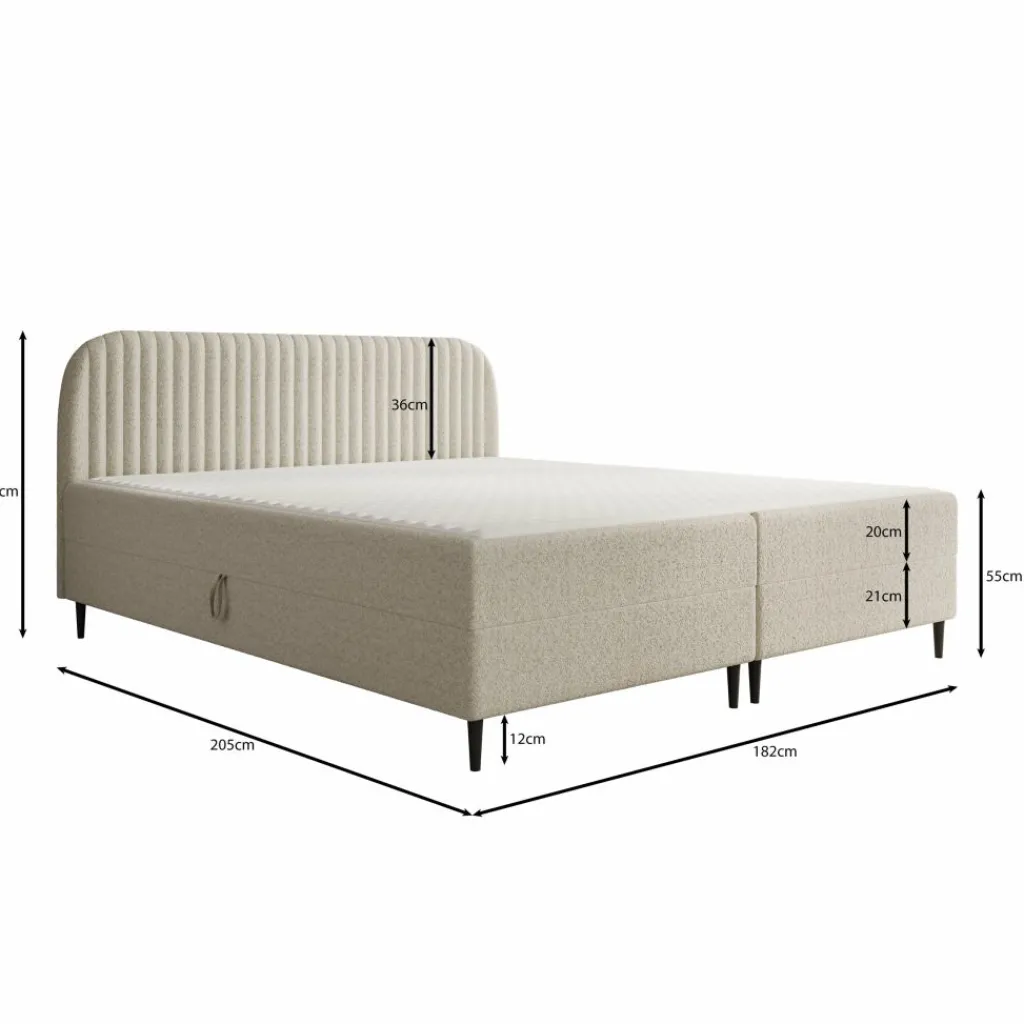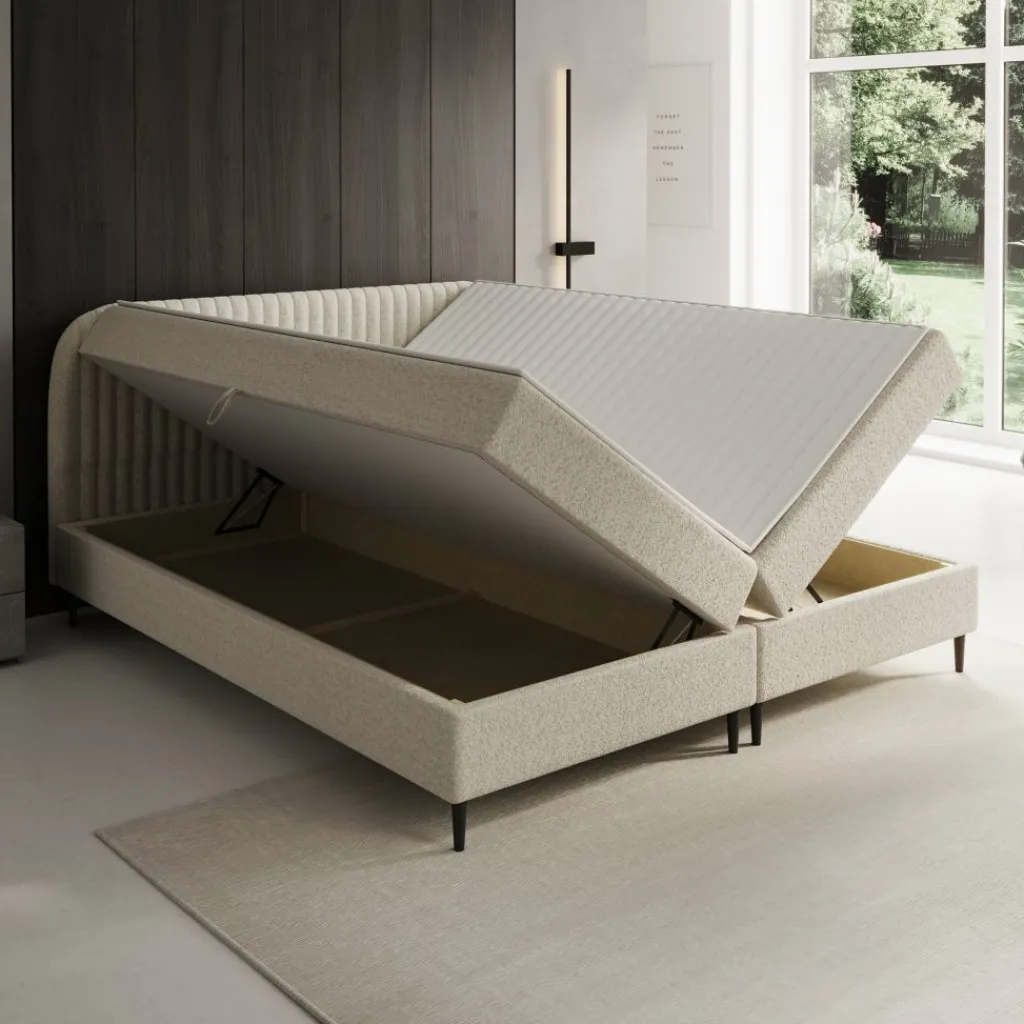 De Bosque boxspring in 180×200 cm is een ruime en praktisch ingerichte slaapoplossing met geïntegreerde opbergruimte. Het model is bekleed met beige teddystof en opgebouwd uit een stevig frame van 16 mm meubelplaat en hout. Het hoofdbord is voorzien van 2 cm T25-schuim voor extra comfort tijdens het zitten.
