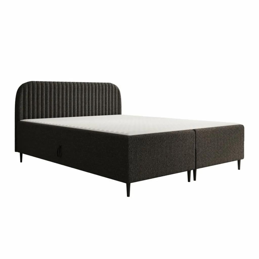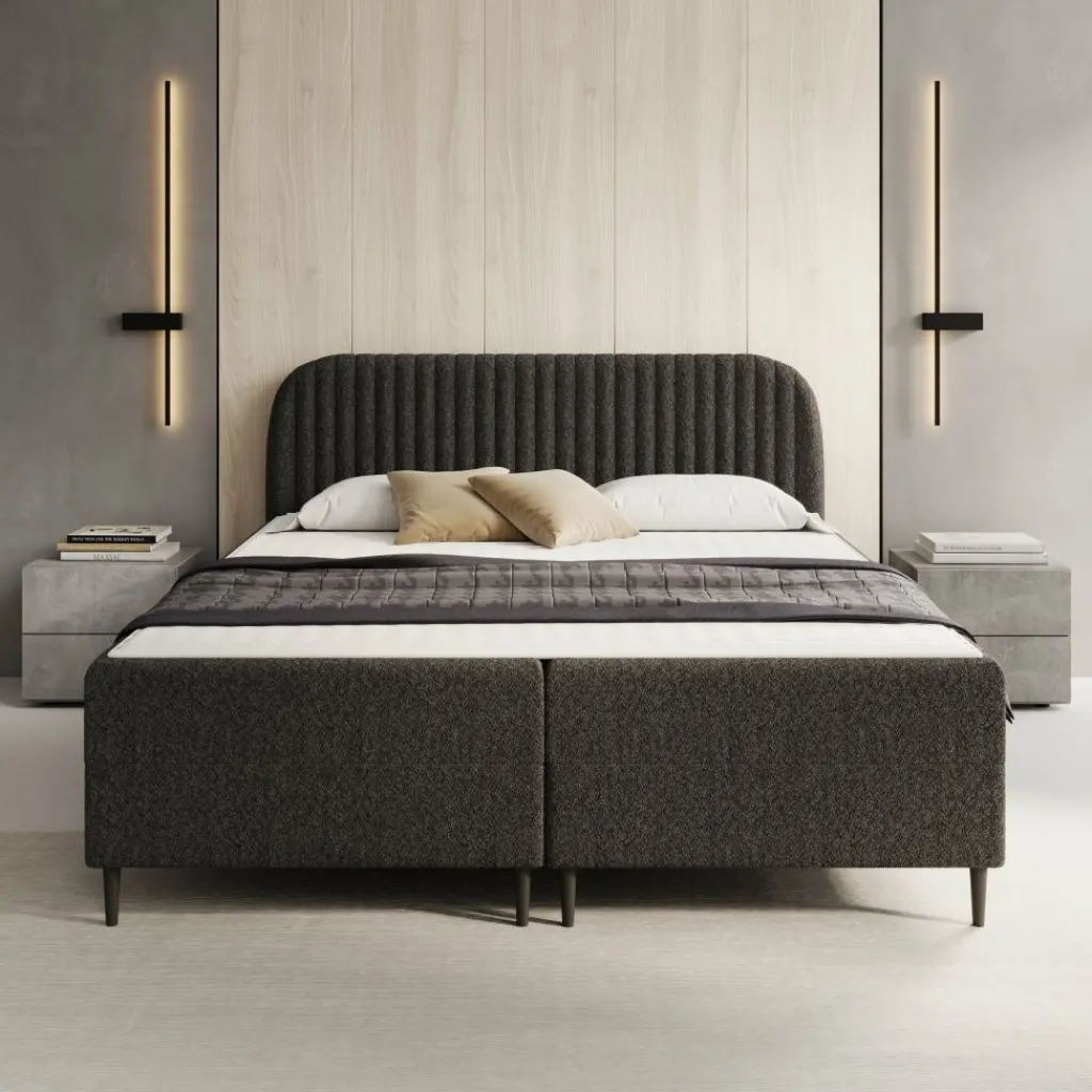 De Bosque boxspring biedt een combinatie van comfortabele ondersteuning en praktische opbergruimte. Het model is bekleed met zachte teddystof in zwart en is opgebouwd uit een stevig frame van 16 mm meubelplaat en hout. Het hoofdbord is voorzien van 2 cm T25-schuim, waardoor je prettig kunt zitten en leunen.