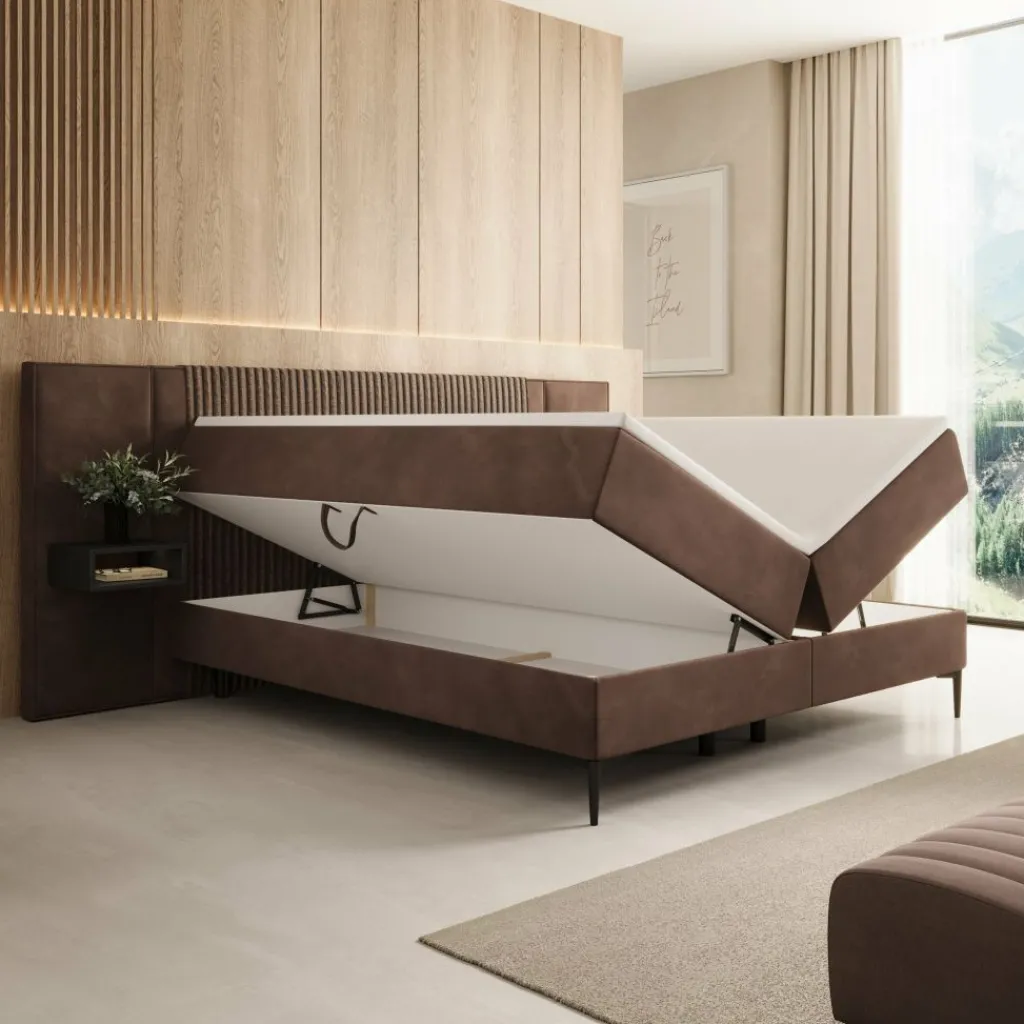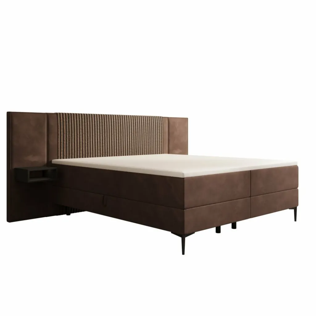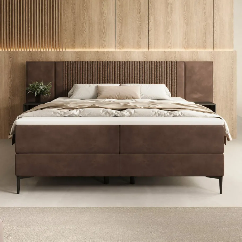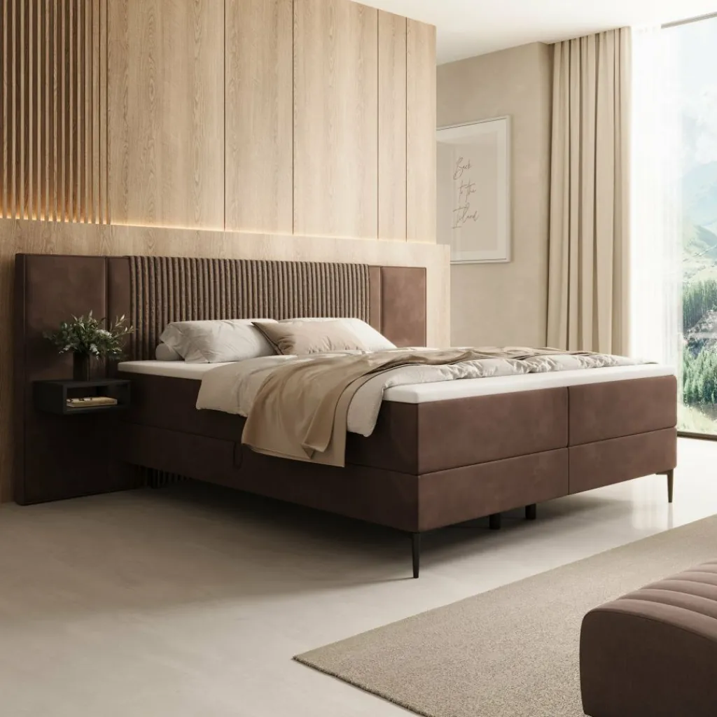 De Boyd boxspring in velvet bruin wordt geleverd in de maat 180×200 cm en heeft een matte afwerking. De twee zwevende nachtkastjes zijn direct aan het hoofdbord bevestigd, waardoor het geheel compact en strak oogt. De nachtkastjes zijn voorzien van geïntegreerde LED-verlichting, die zorgt voor een praktisch lichtpunt naast het bed. Het hoofdbord zelf is uitgevoerd met verticale banen en heeft geen verlichting. De velvet bekleding zorgt voor een gelijkmatige en verzorgde afwerking.