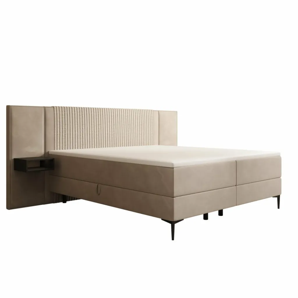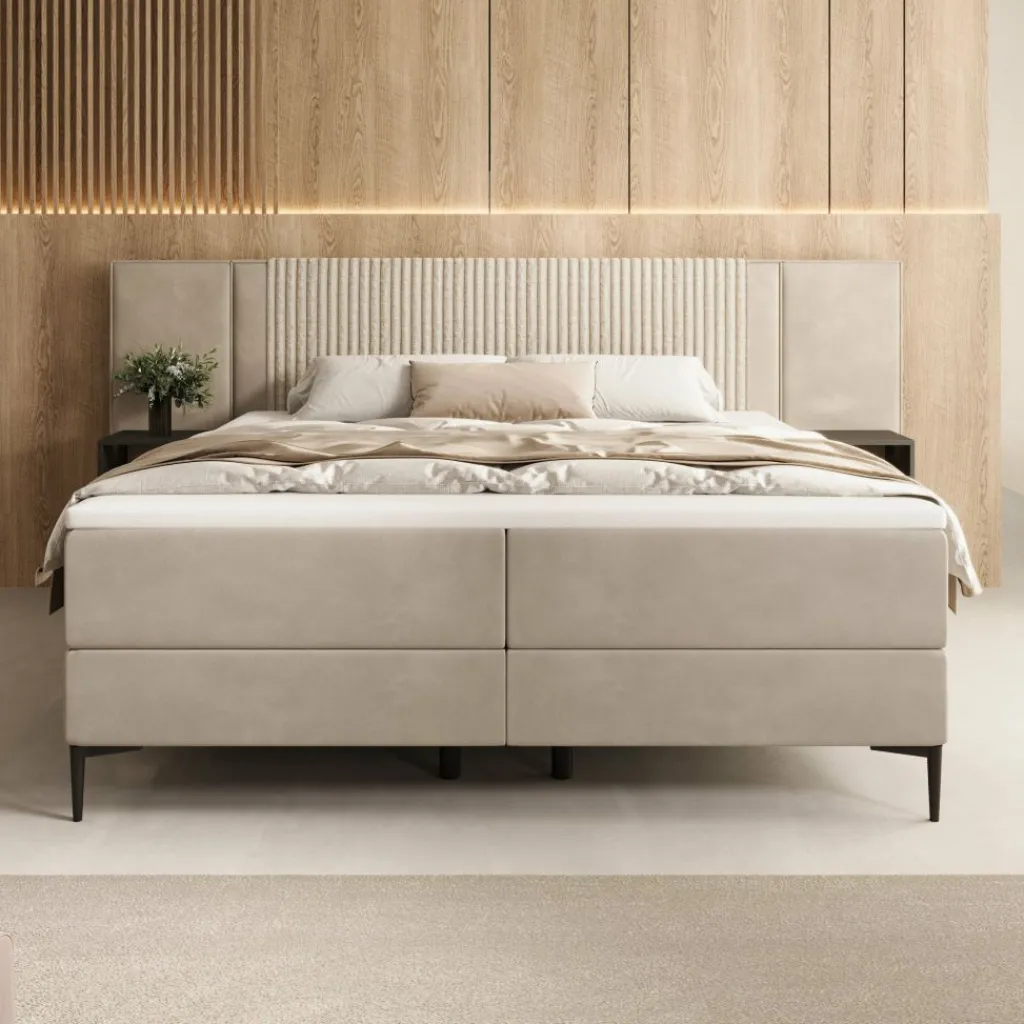 De Boyd boxspring in velvet beige wordt geleverd in de maat 180×200 cm en heeft een matte afwerking. De twee zwevende nachtkastjes zijn direct aan het hoofdbord bevestigd, waardoor het geheel compact en strak oogt. De nachtkastjes zijn voorzien van geïntegreerde LED-verlichting, die zorgt voor een praktisch lichtpunt naast het bed. Het hoofdbord zelf is uitgevoerd met verticale banen en heeft geen verlichting. De velvet bekleding zorgt voor een gelijkmatige en verzorgde afwerking.