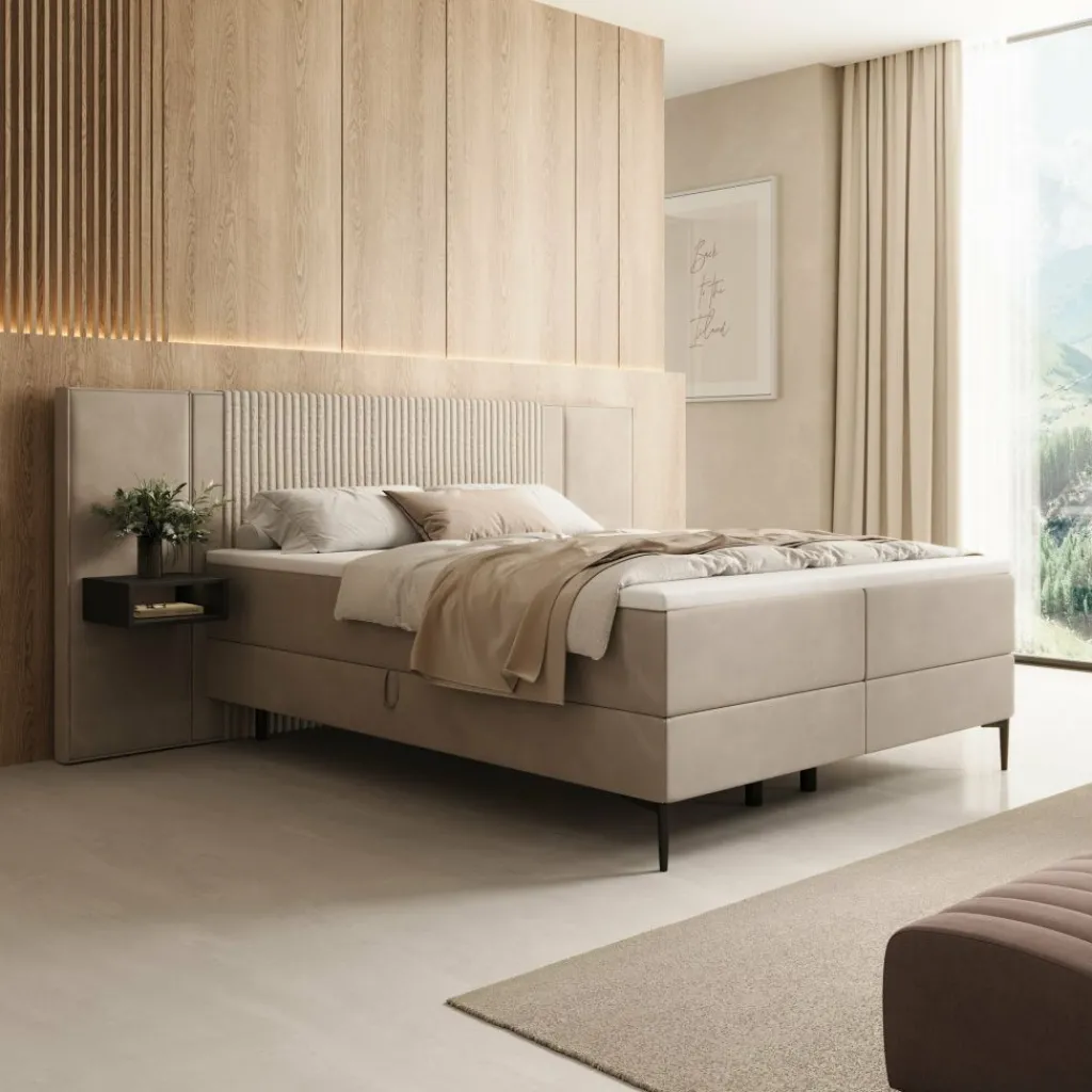 De Boyd boxspring in velvet beige wordt geleverd in de maat 160×200 cm en heeft een matte afwerking. De twee zwevende nachtkastjes zijn direct aan het hoofdbord bevestigd, waardoor het geheel compact en strak oogt. De nachtkastjes zijn voorzien van geïntegreerde LED-verlichting, die zorgt voor een praktisch lichtpunt naast het bed. Het hoofdbord zelf is uitgevoerd met verticale banen en heeft geen verlichting. De velvet bekleding zorgt voor een gelijkmatige en verzorgde afwerking.