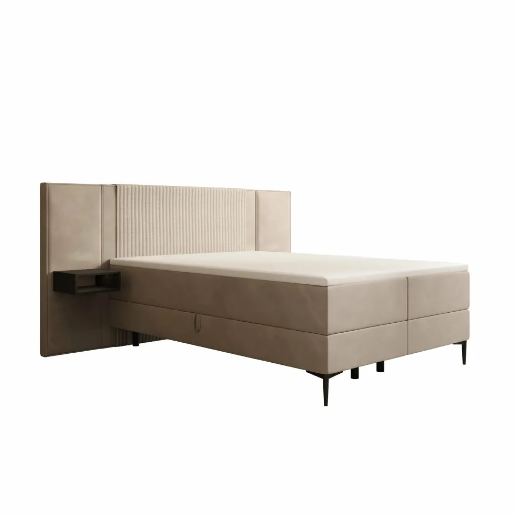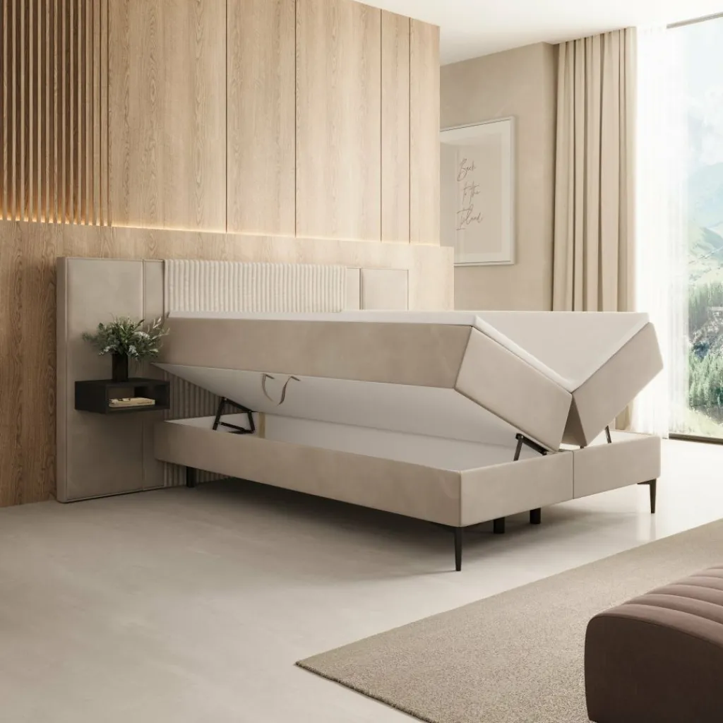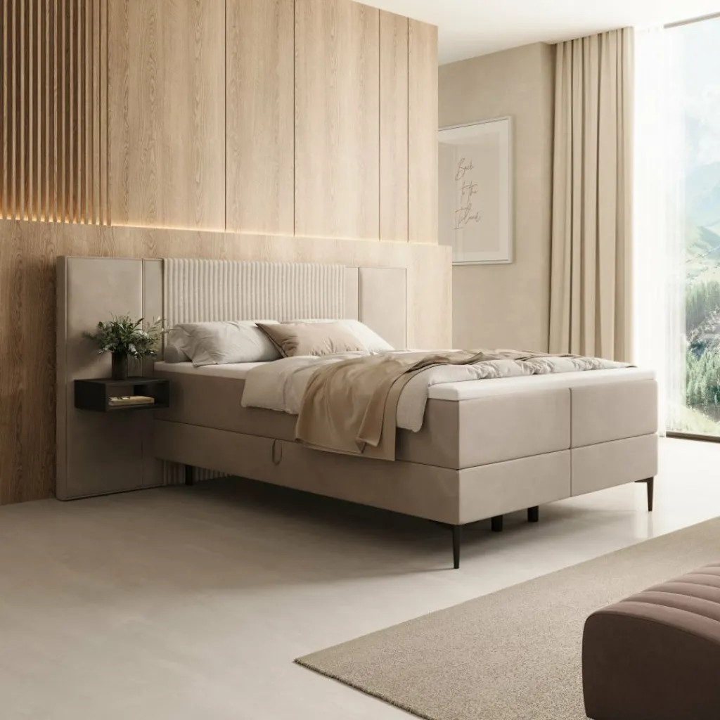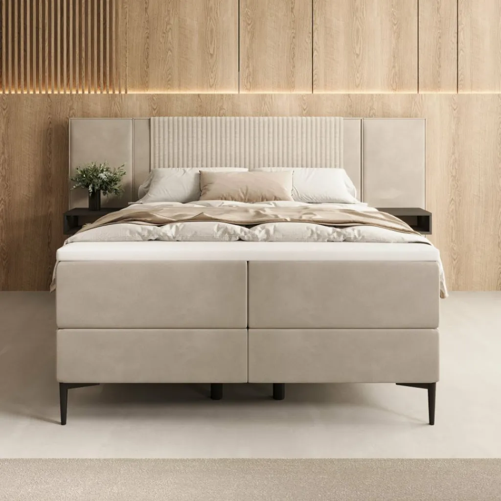De Boyd boxspring in velvet beige wordt geleverd in de maat 140×200 cm en heeft een matte afwerking. De twee zwevende nachtkastjes zijn direct aan het hoofdbord bevestigd, waardoor het geheel compact en strak oogt. De nachtkastjes zijn voorzien van geïntegreerde LED-verlichting, die zorgt voor een praktisch lichtpunt naast het bed. Het hoofdbord zelf is uitgevoerd met verticale banen en heeft geen verlichting. De velvet bekleding zorgt voor een gelijkmatige en verzorgde afwerking.