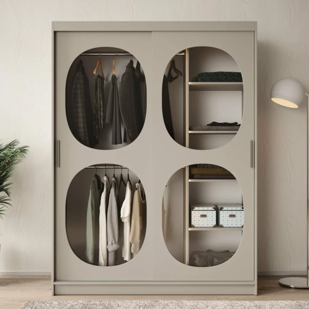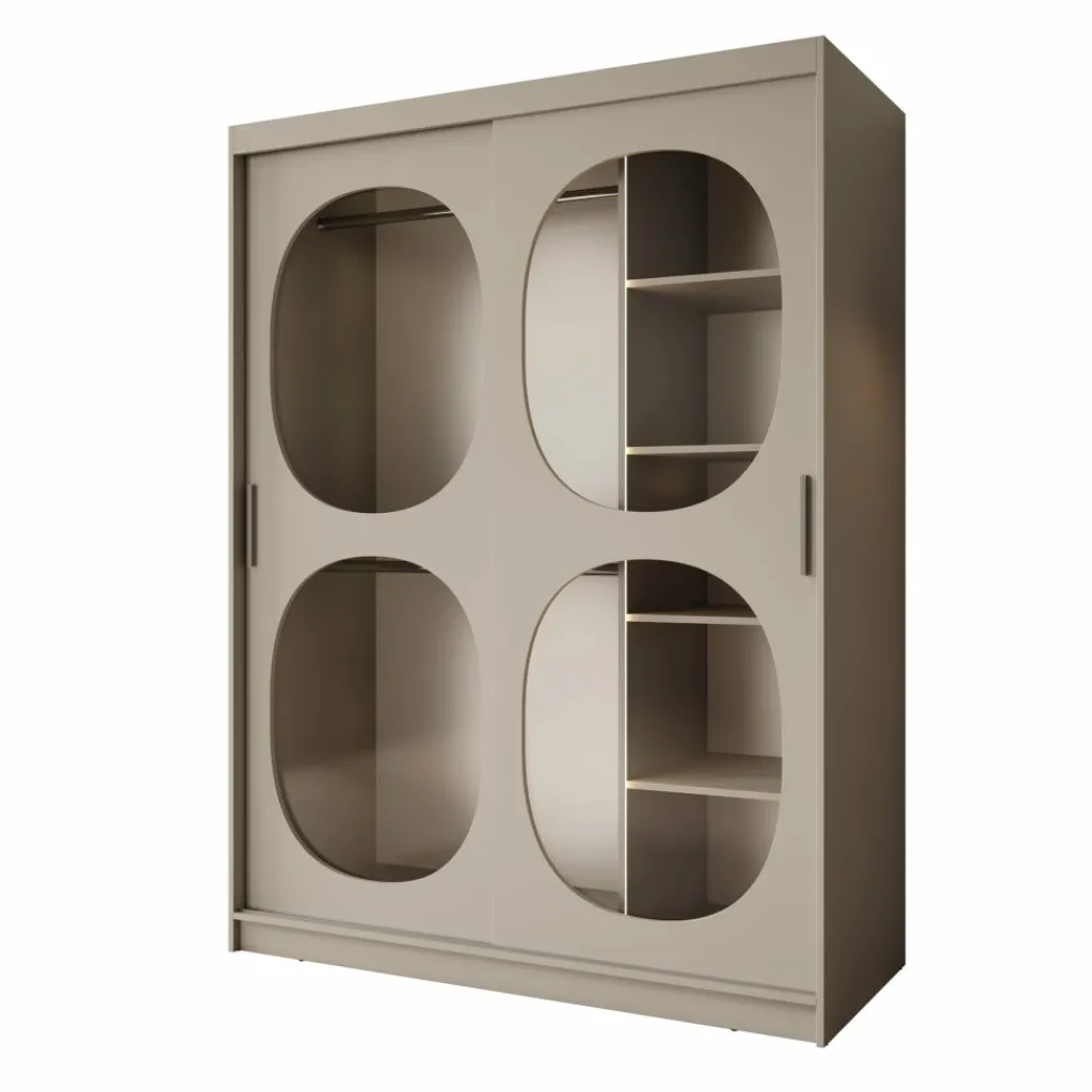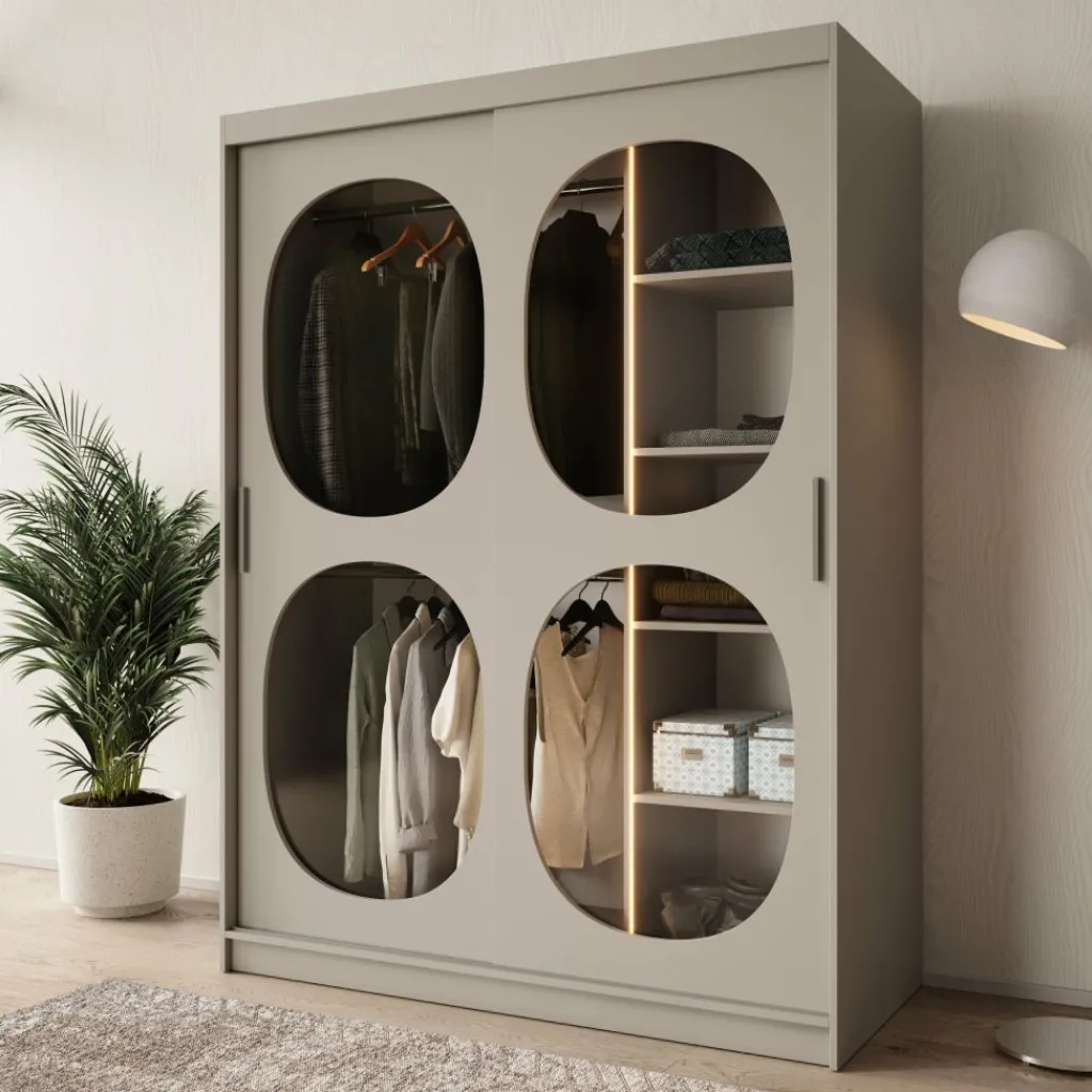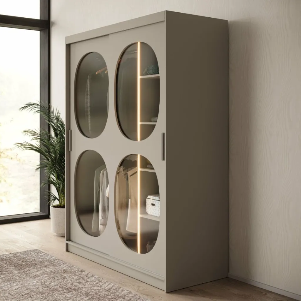 De Bravanti kledingkast in beige brengt een zachte, moderne elegantie in de slaapkamer. De warme beige tint zorgt voor een rustige en harmonieuze uitstraling, terwijl de afgeronde glazen panelen een verfijnd contrast bieden. De geïntegreerde LED-verlichting geeft de kast een luxe uitstraling en zorgt voor een sfeervol verlichte binnenkant.