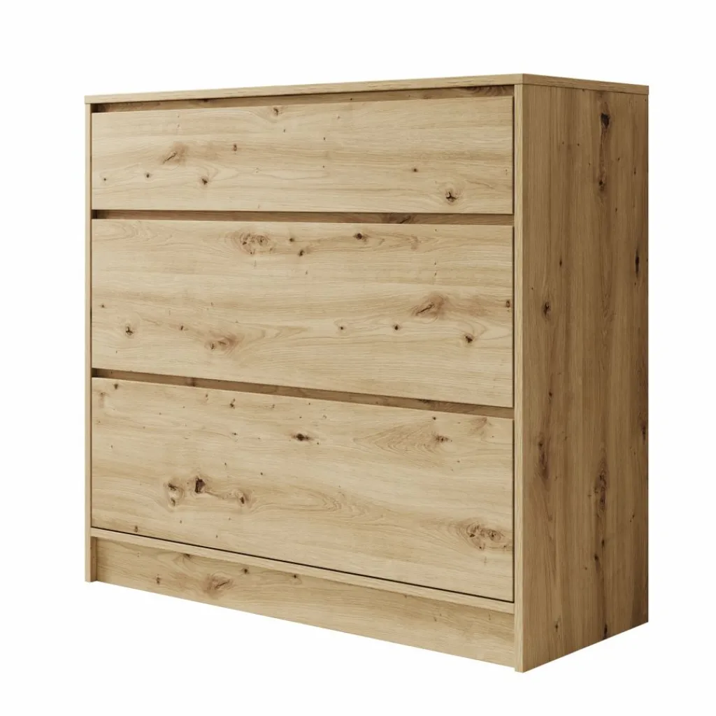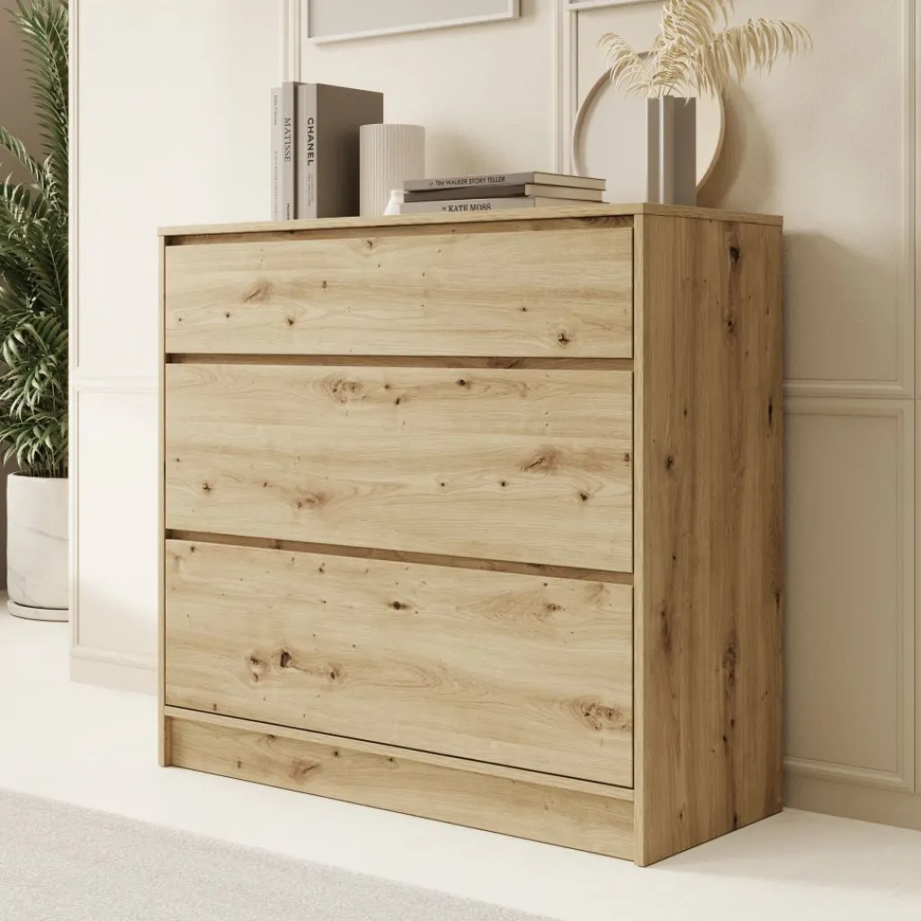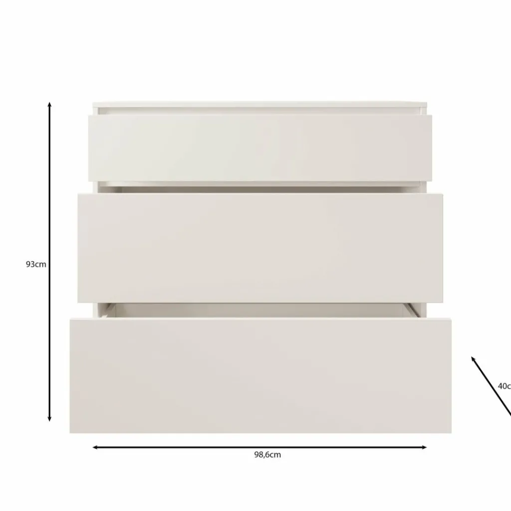 De ladekast beschikt over drie ruime lades waarin je eenvoudig kleding, linnengoed of andere spullen kunt opbergen. Dankzij de afmetingen van 99x40x93 cm is hij compact genoeg voor in de slaapkamer, hal of woonkamer, maar toch ruim van binnen.