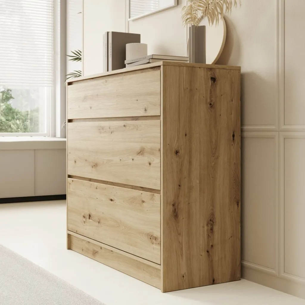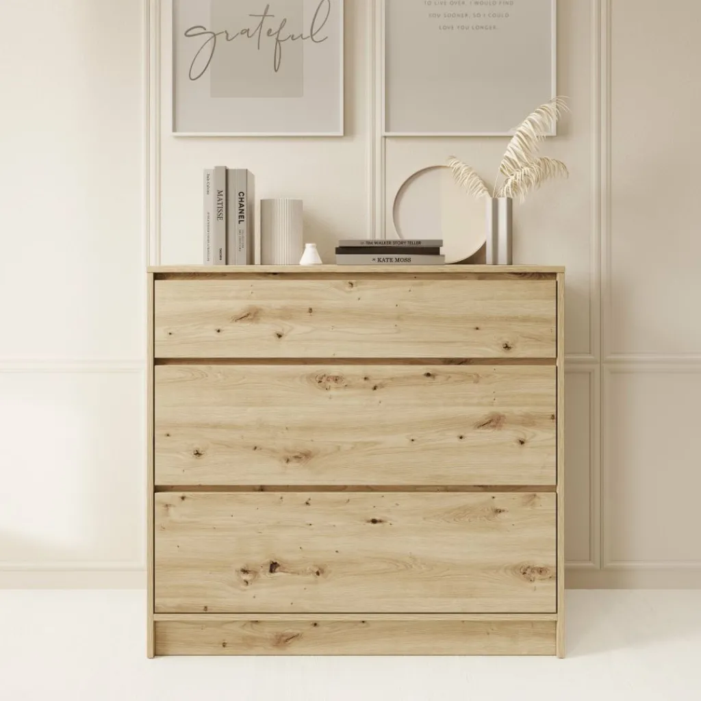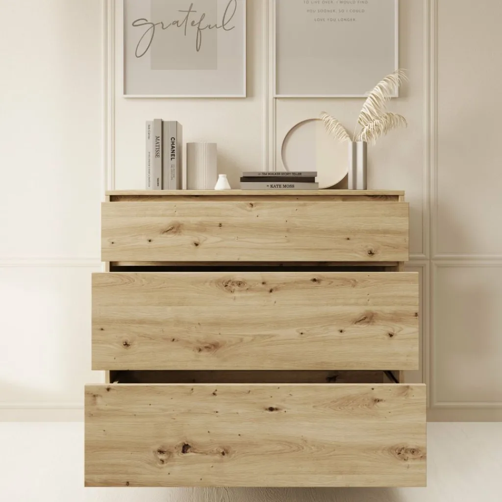 De ladekast beschikt over drie ruime lades waarin je eenvoudig kleding, linnengoed of andere spullen kunt opbergen. Dankzij de afmetingen van 99x40x93 cm is hij compact genoeg voor in de slaapkamer, hal of woonkamer, maar toch ruim van binnen.