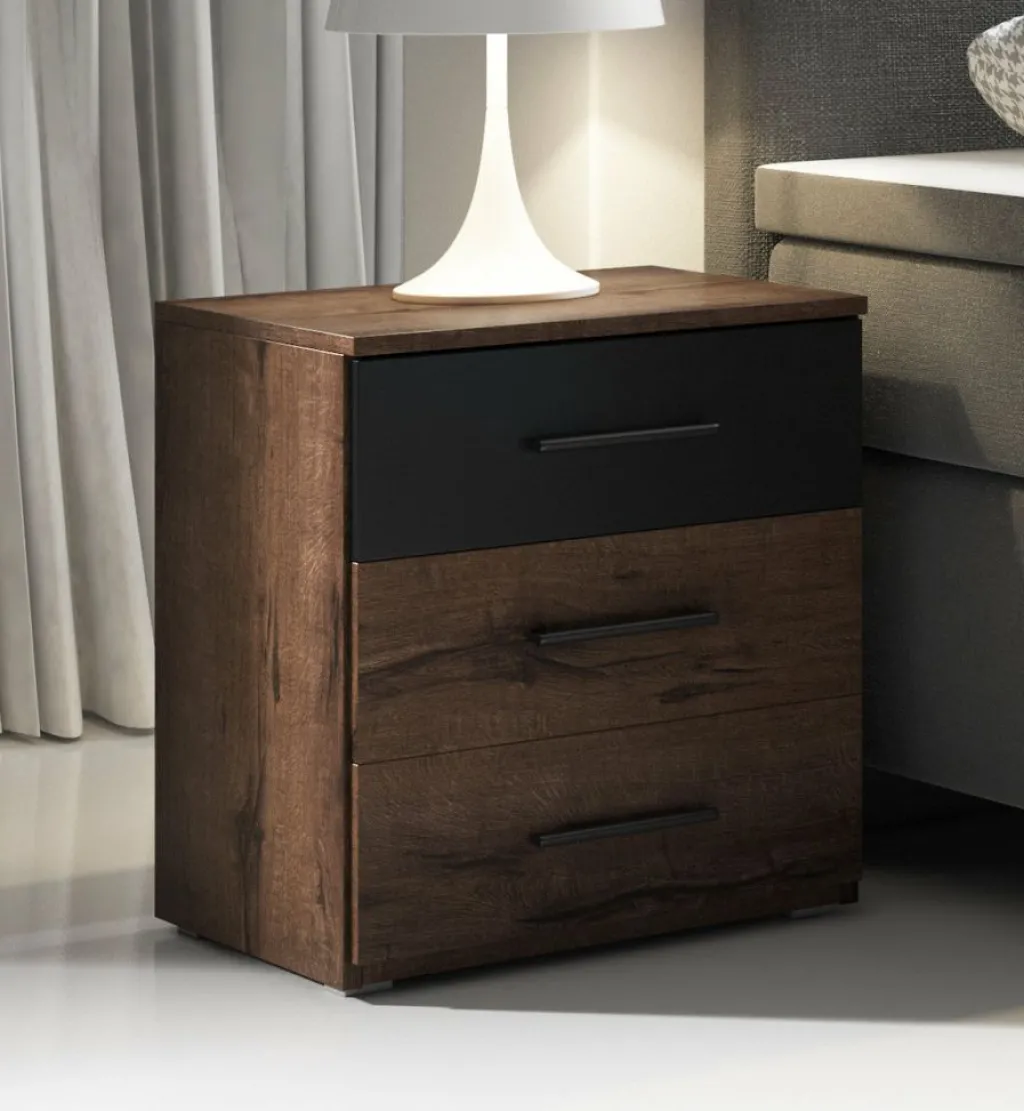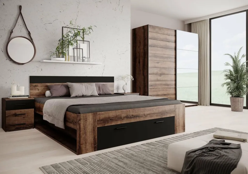 De Slaapkamer Brown combineert stoere houttinten met modern zwart. Deze complete set bestaat uit een royaal tweepersoonsbed, twee nachtkastjes en een stijlvolle kledingkast met spiegeldeur – allemaal in bijpassend design.