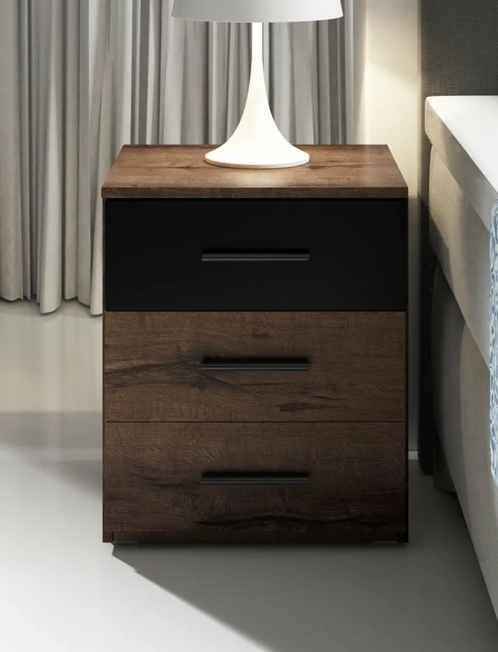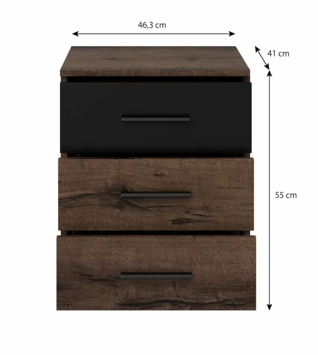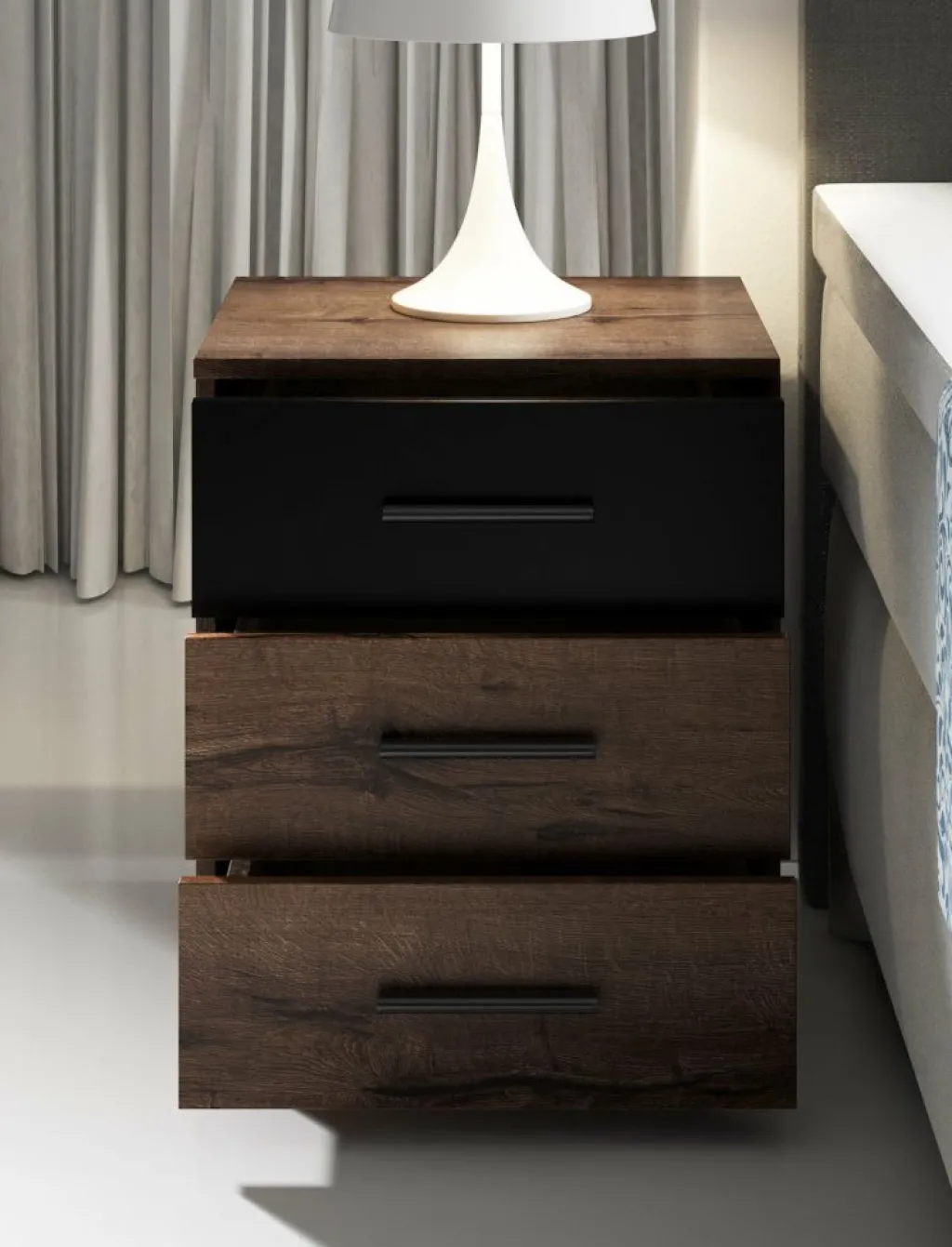 Aan weerszijden van het bed plaats je de twee nachtkastjes (46×41×55 cm), elk voorzien van drie lades met zwarte handgrepen. Handig voor het opbergen van je boek, bril of oplader – en natuurlijk voor een nachtlampje erbovenop.