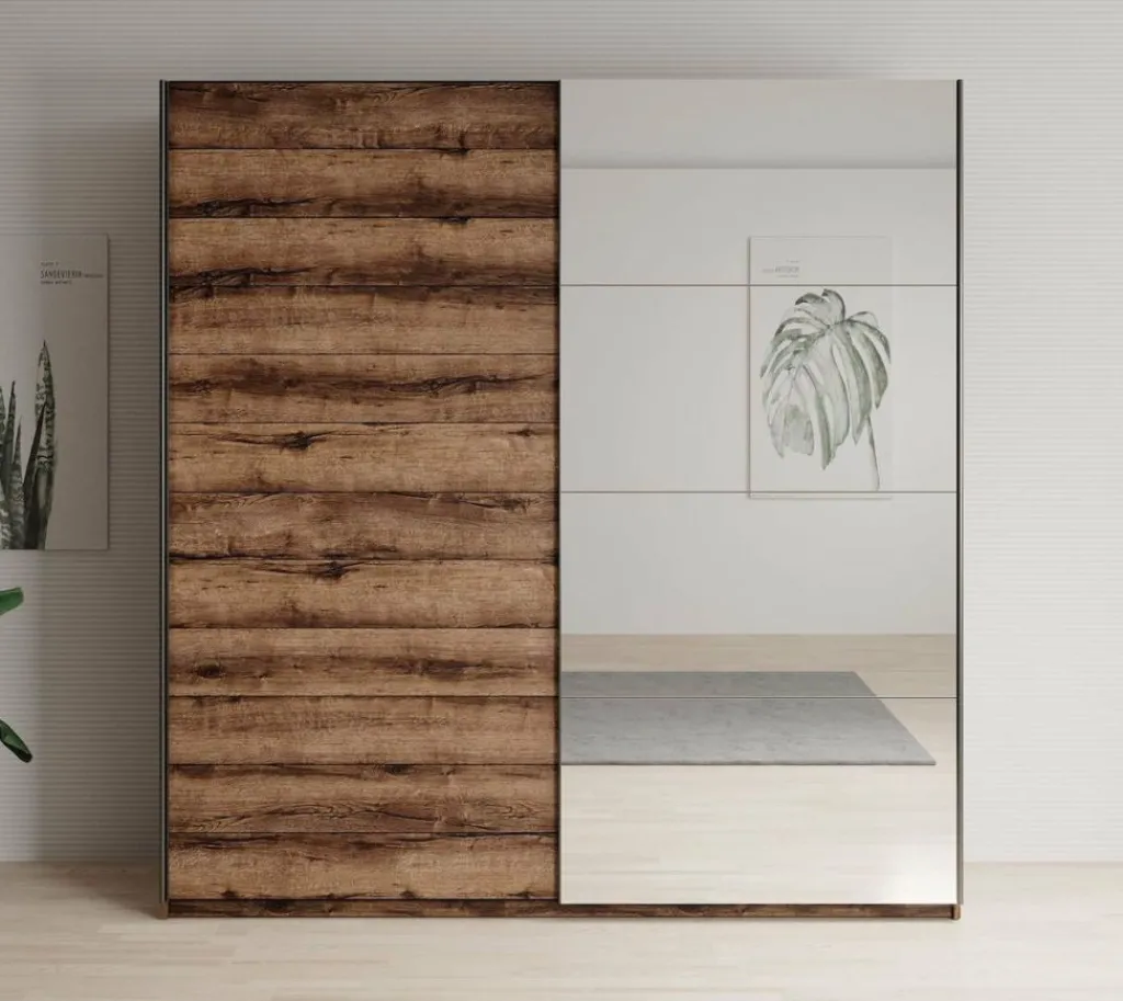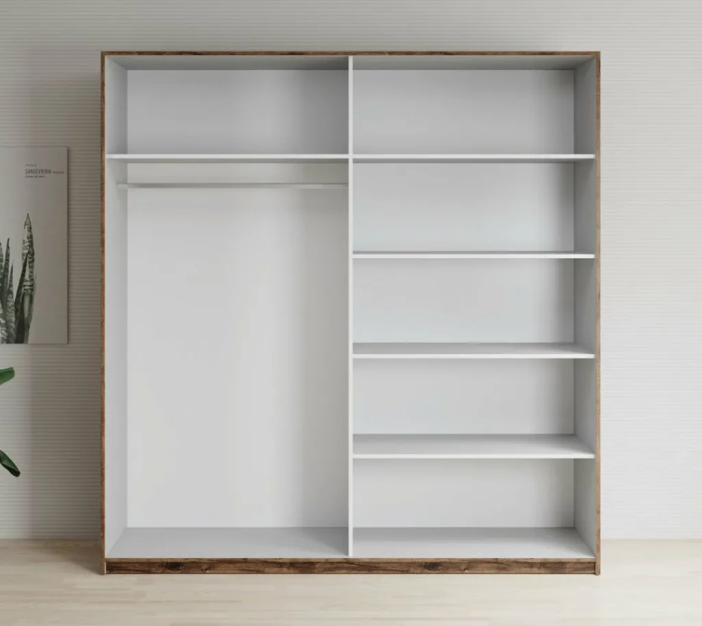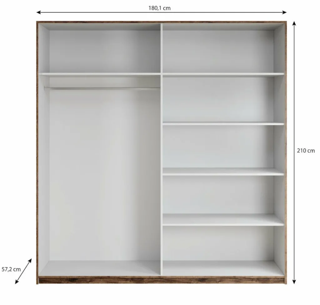 De schuifdeurkast (180×57×210 cm) maakt de set compleet. De rechterdeur is volledig voorzien van een spiegel, wat de ruimte optisch vergroot. Binnenin vind je zes open vakken en een brede kledingroede, zodat je alles netjes kunt opbergen.