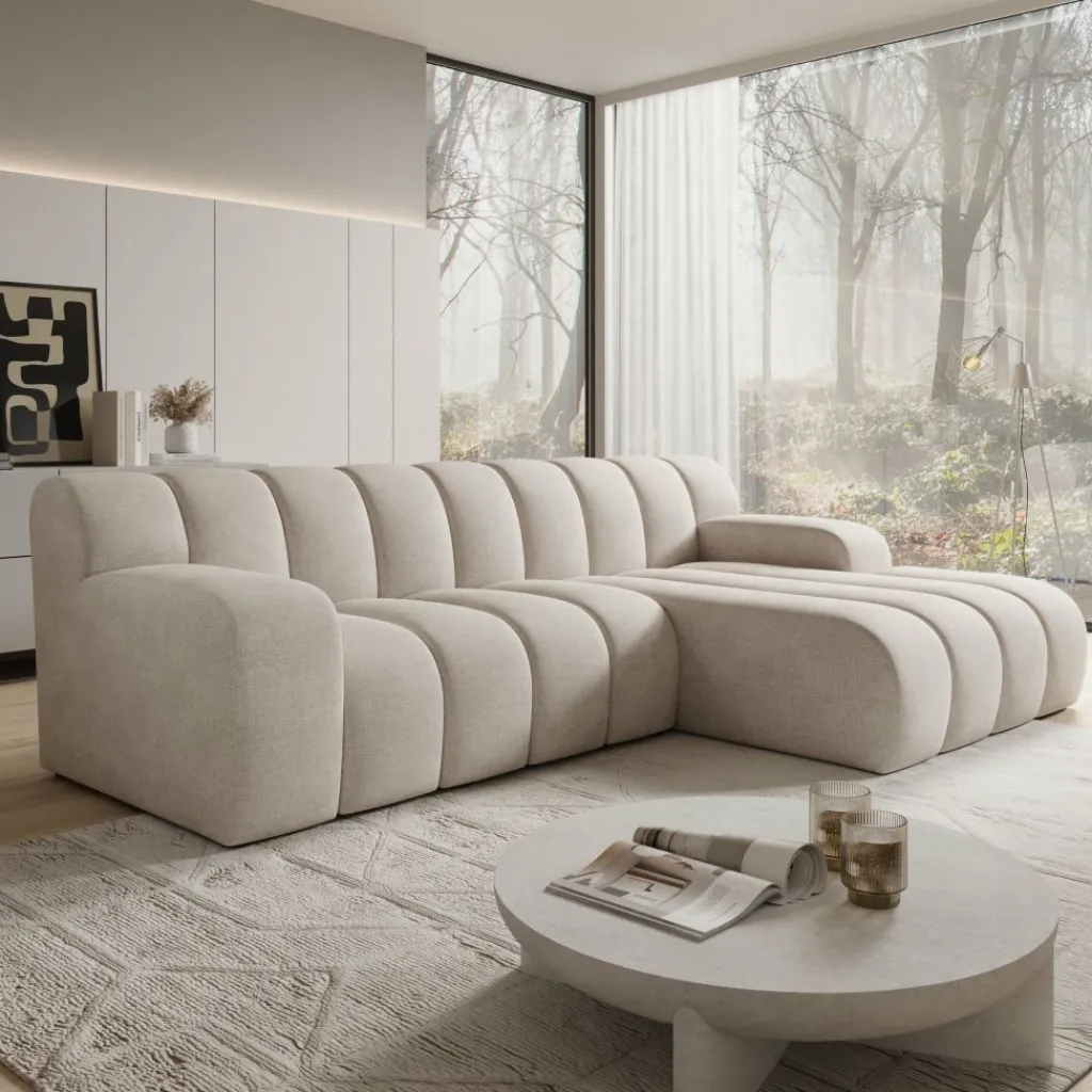 Stijlvol in elk interieur De warme beige stofkleur en de ronde, geribbelde vormgeving passen goed bij een modern of minimalistisch interieur. De bank trekt de aandacht zonder te overheersen.