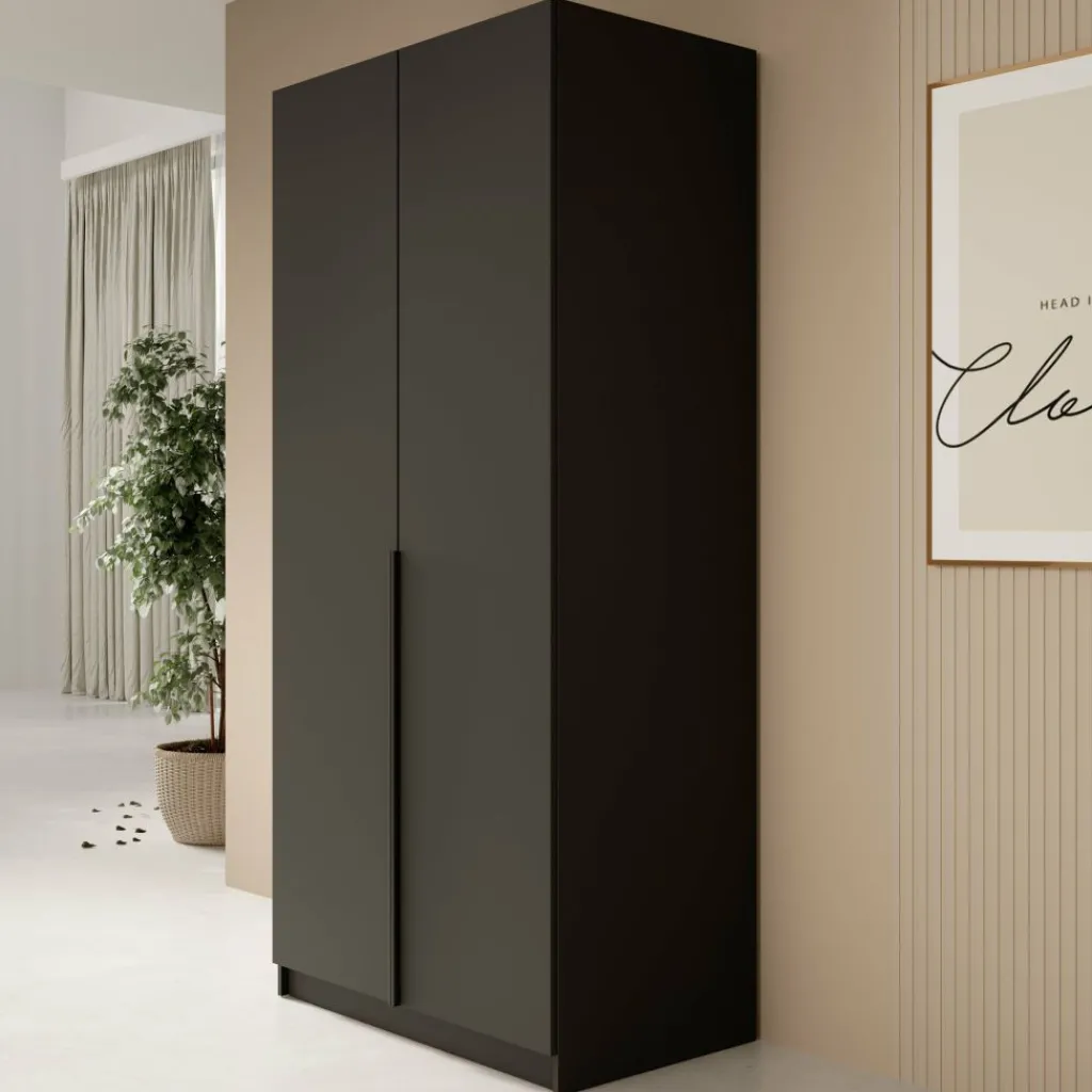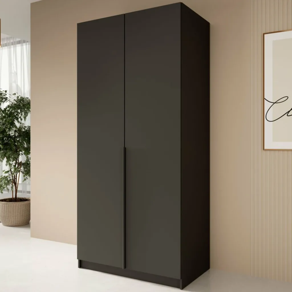 Kledingkast Bruno is een moderne en praktische kast met een stijlvolle uitstraling. De kast is uitgevoerd in zwart met een slanke, zwarte handgreep over de volledige lengte van de deuren. Dankzij het tijdloze ontwerp past deze 2-deurs kledingkast perfect in uiteenlopende interieurs.