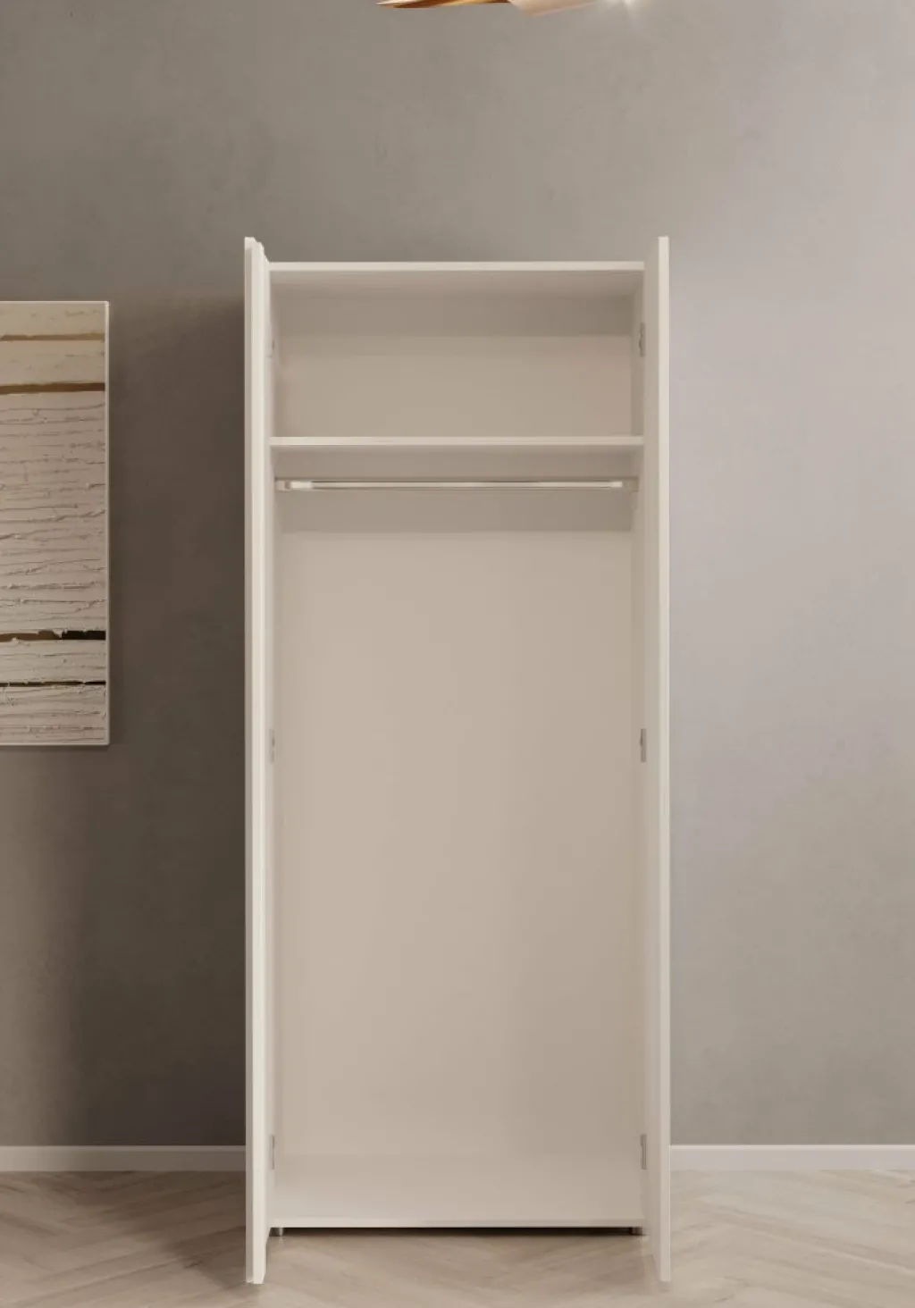 Achter de deuren biedt de kast een overzichtelijke indeling: een kledingroede over de volledige breedte voor hangkleding en een legplank erboven voor bijvoorbeeld tassen of opgevouwen kledingstukken. Dankzij de compacte vorm is deze kast ideaal voor kleinere slaapkamers, logeerkamers of de hal. De mat-witte afwerking zorgt voor een moderne uitstraling die zich moeiteloos laat combineren met andere meubels.