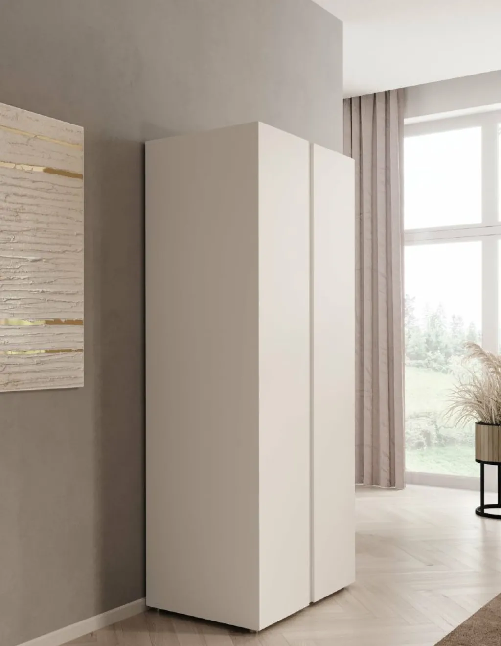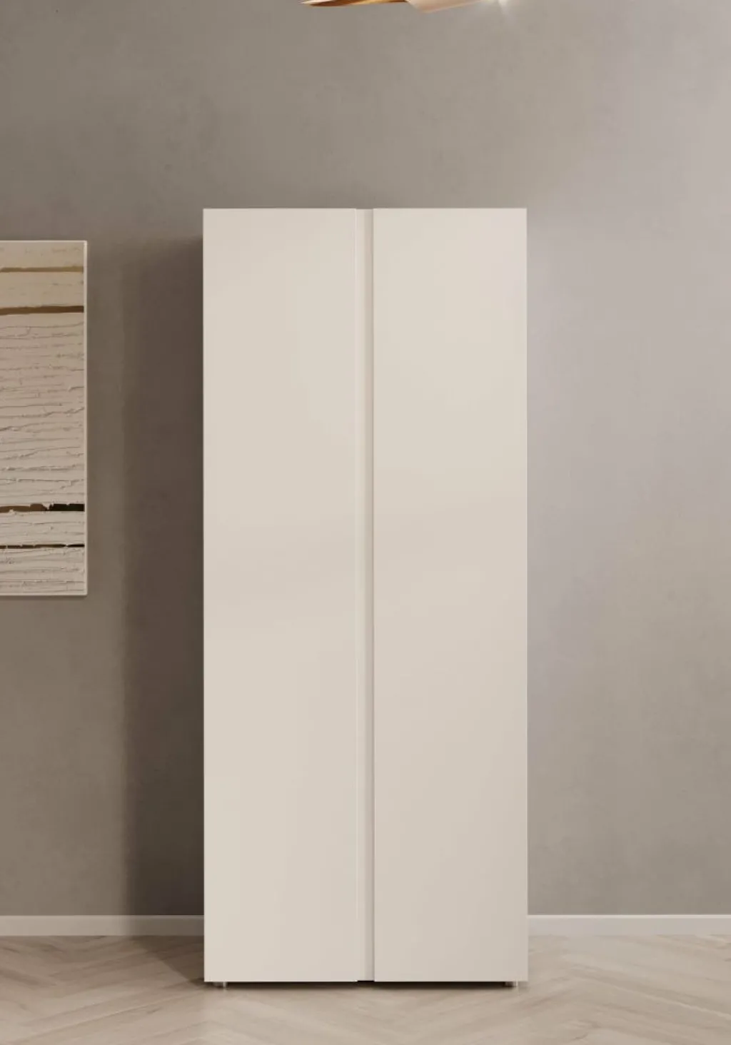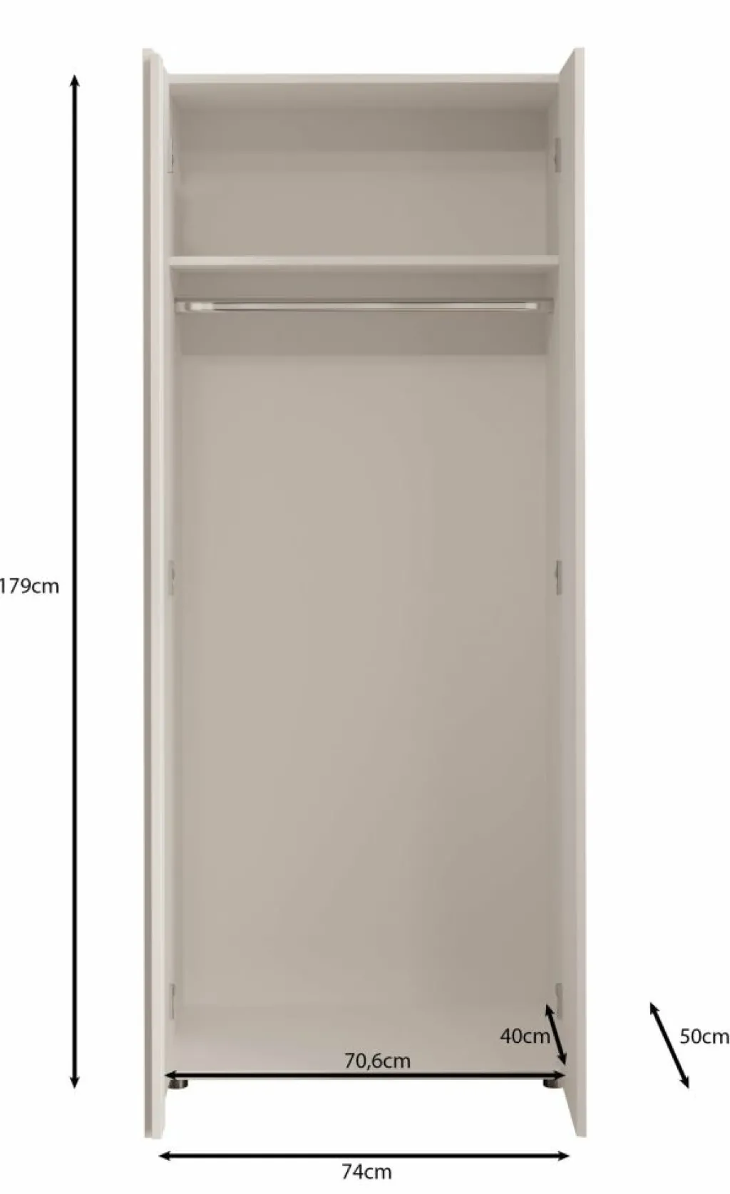 Kledingkast Brussel is een praktische garderobekast in een strak, wit design. Het model is 74 cm breed en voorzien van 2 scharnierdeuren met inkepingen om deze te openen.