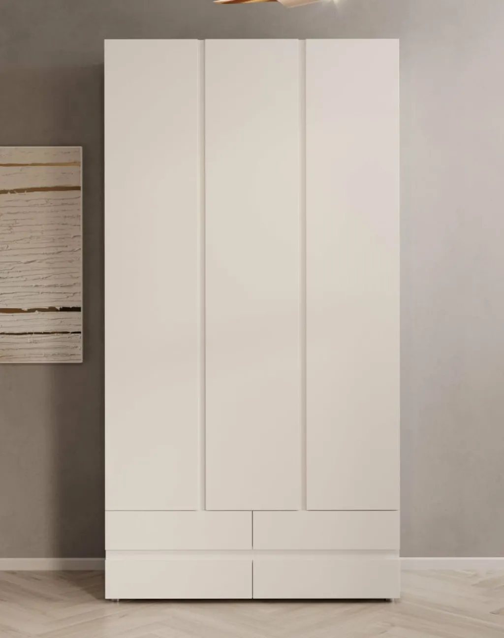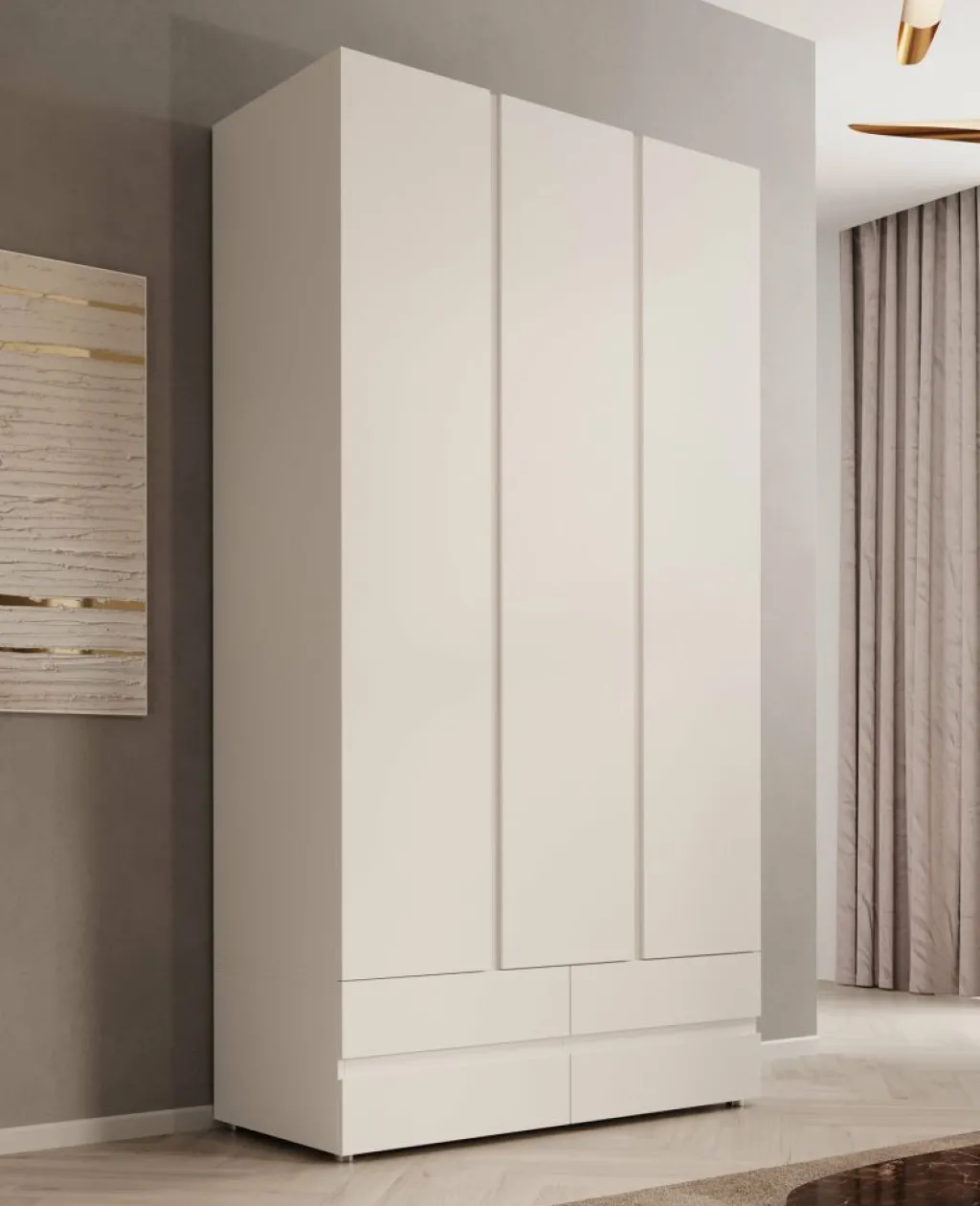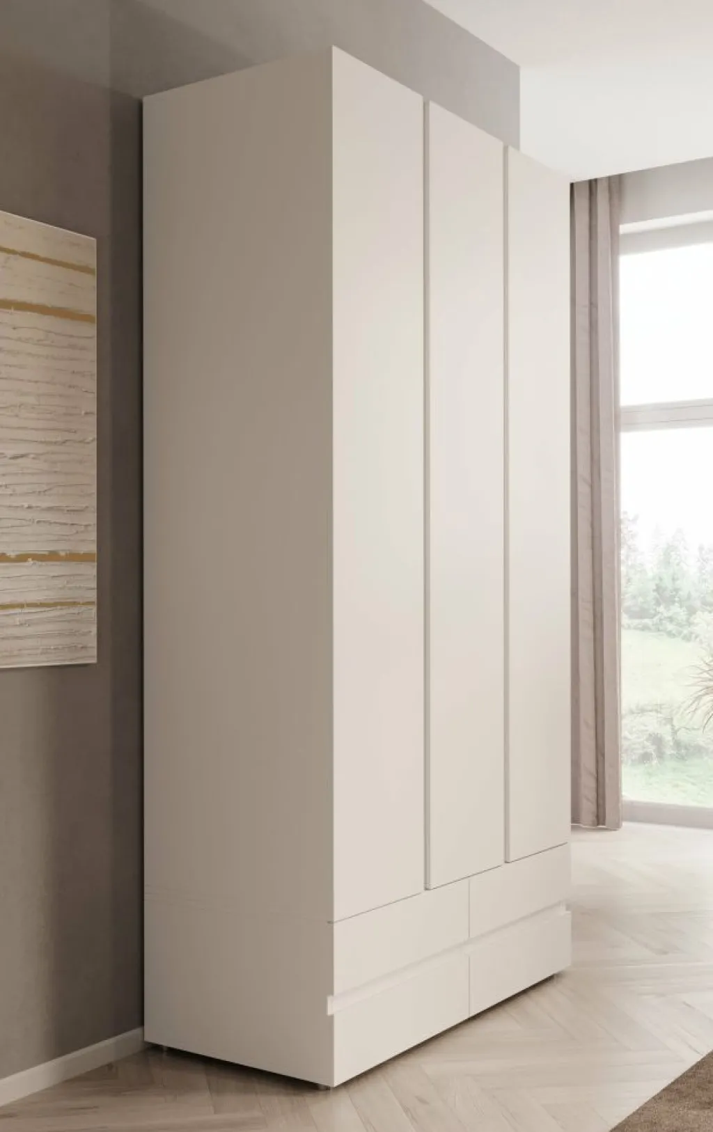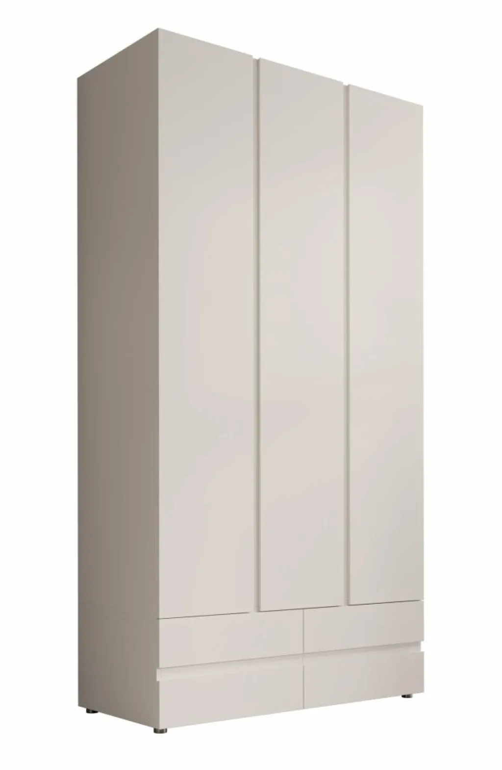 Kledingkast Brussel is een moderne garderobekast in een strakke witte uitvoering. Het model is voorzien van drie scharnierdeuren met subtiele verticale inkepingen die dienen als grepen. Onderin de kast bevinden zich vier ruime, greeploze lades voor extra opbergruimte.