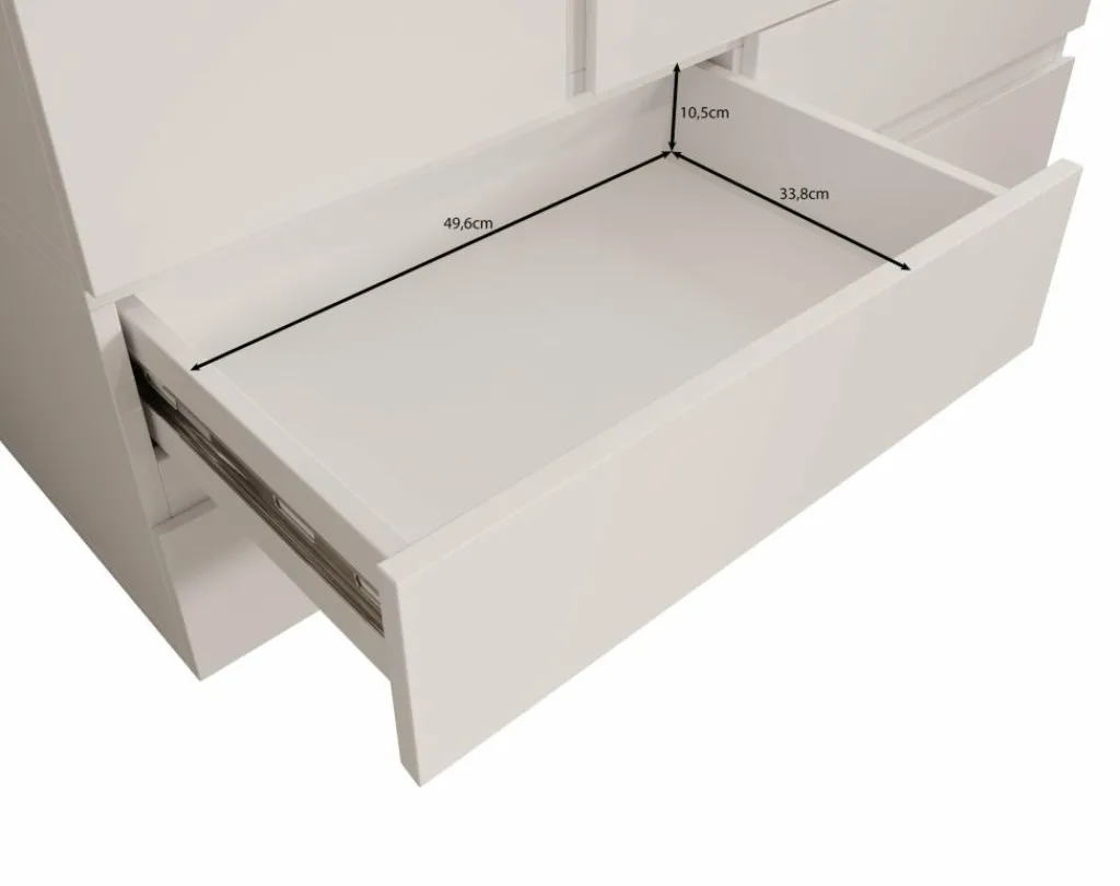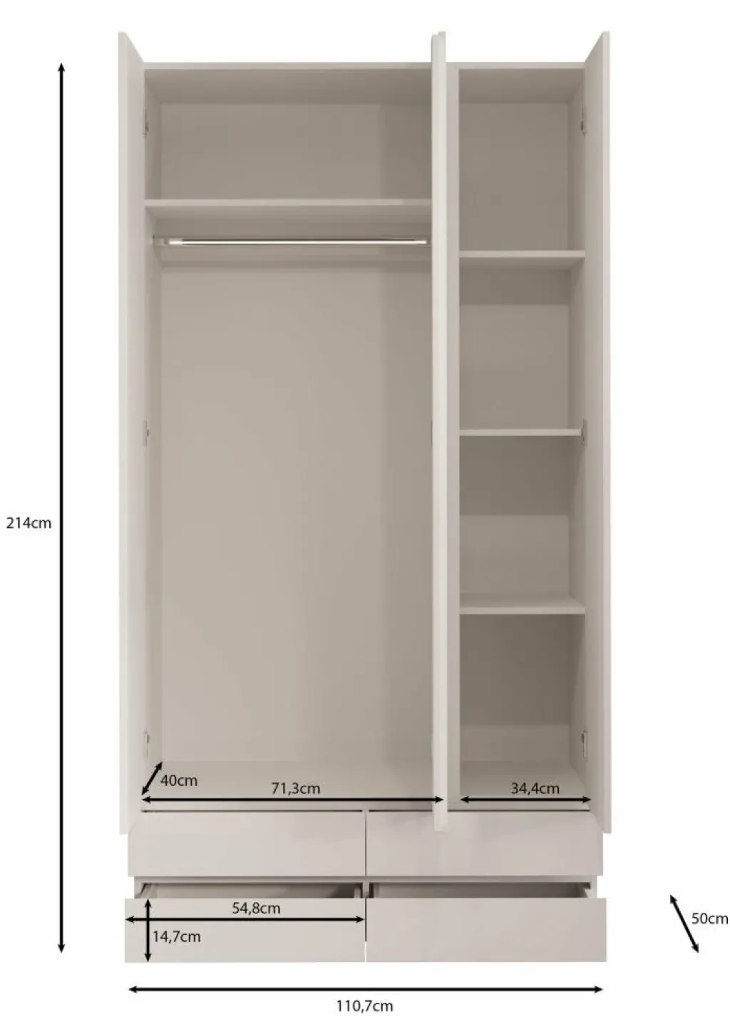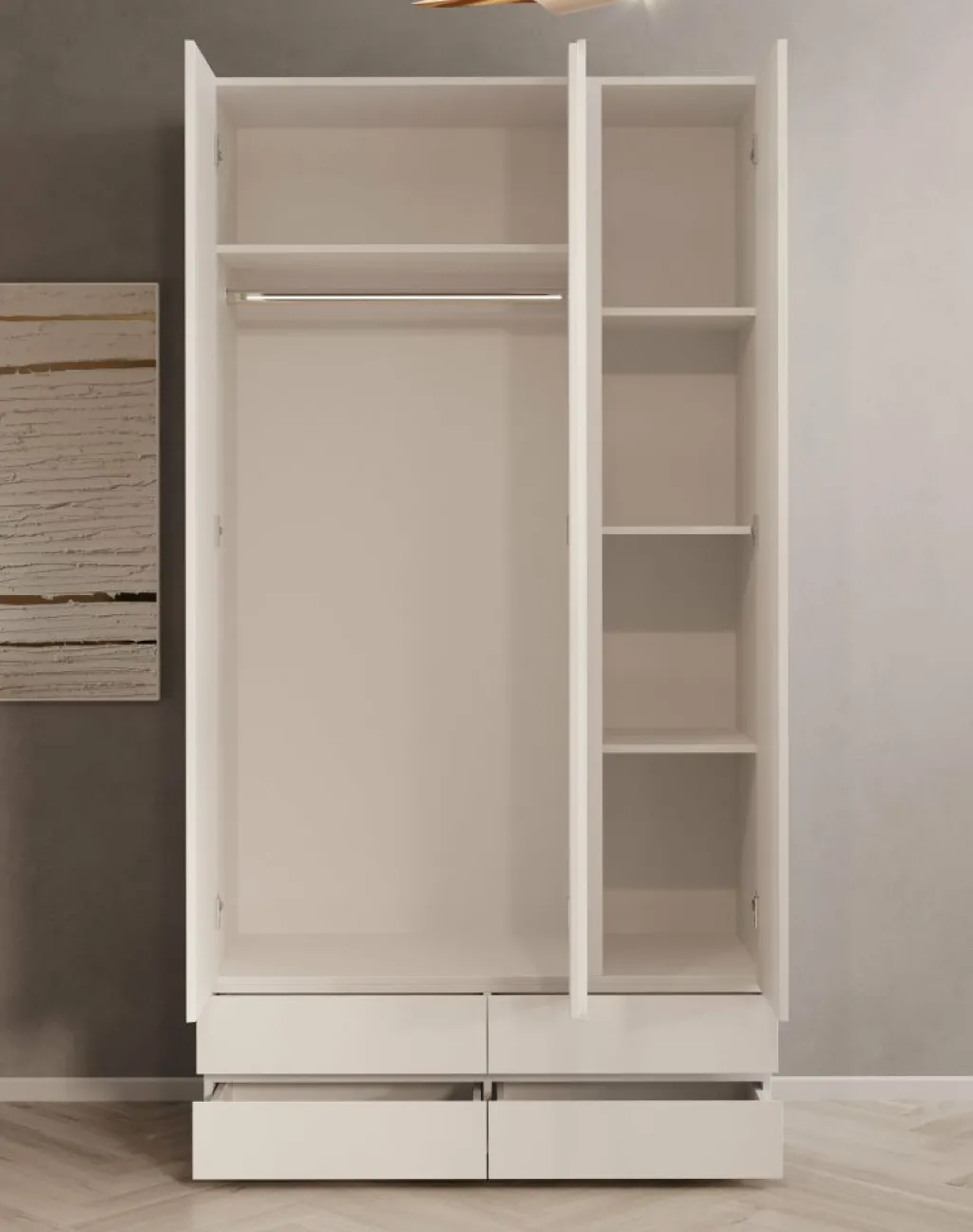 De binnenzijde van de kast is praktisch ingedeeld met vijf opbergvakken en een brede kledingroede. Daarmee biedt de kast volop ruimte voor het overzichtelijk opbergen van zowel gevouwen als hangende kleding. Dankzij de neutrale kleur en minimalistische vormgeving past dit model moeiteloos in diverse interieurstijlen – van modern tot Scandinavisch.